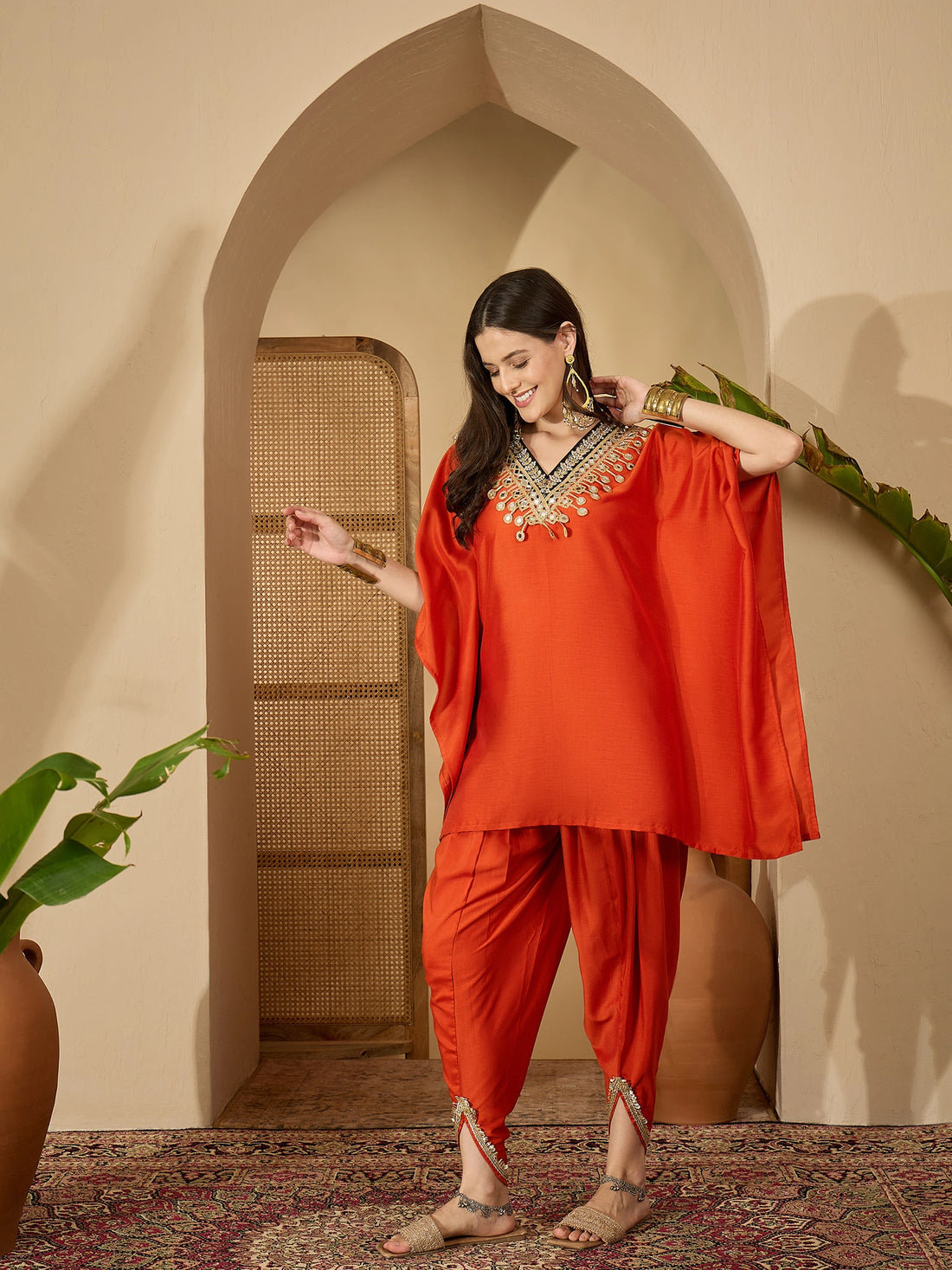 Orange Cotton Silk Embroidered Kaftan Kurta with Dhoti Pant Set