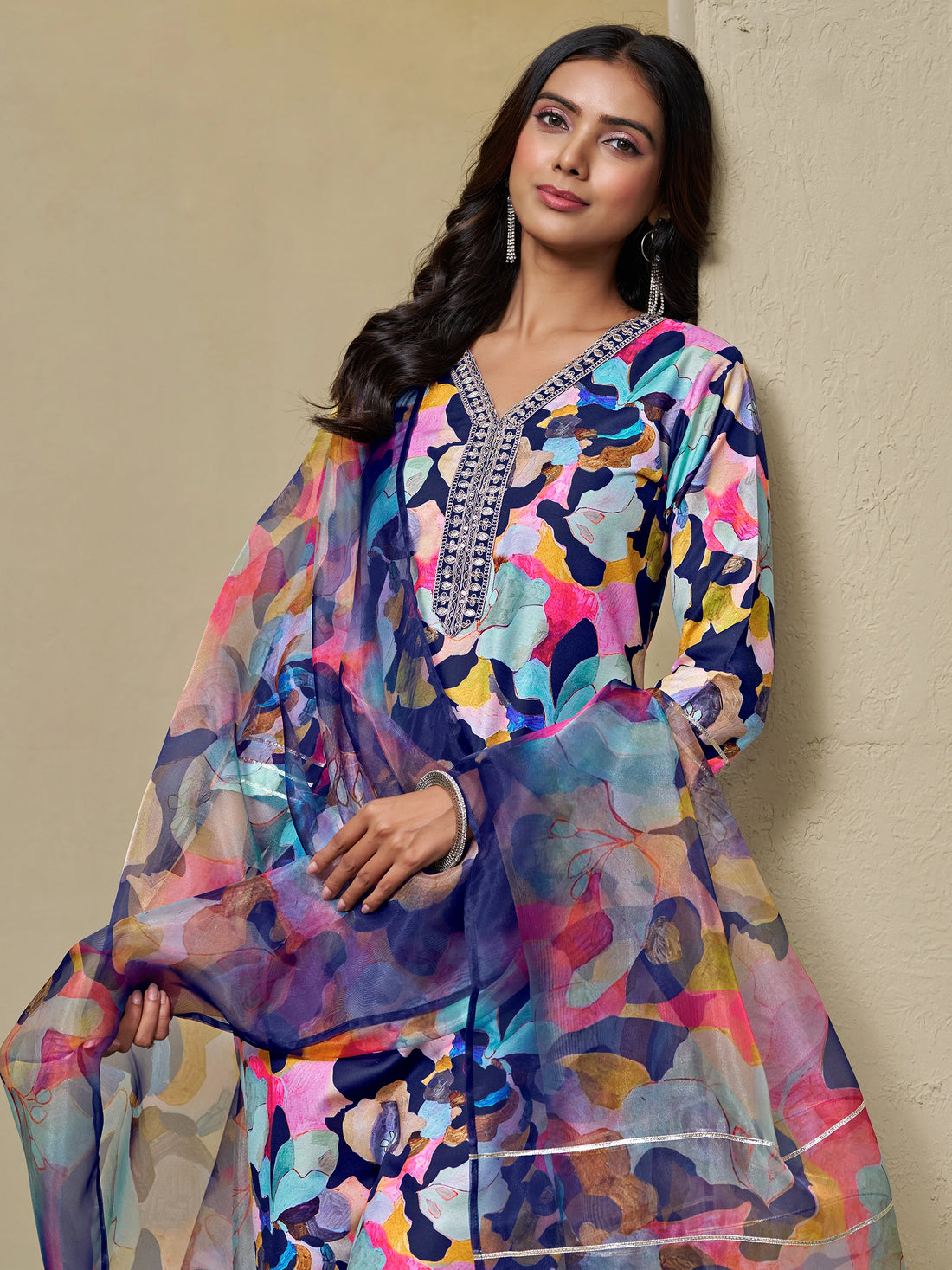 Navy Blue Viscose Rayon Printed Kurta Pant with Organza Dupatta
