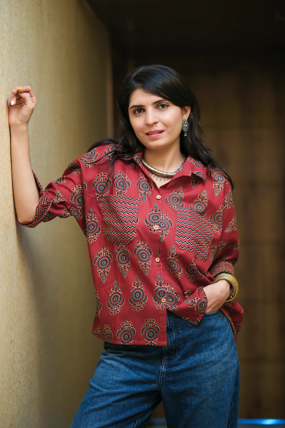 Upgrade your casual wardrobe with this chic Cotton Blend Ajrak print and Embroidered Boxy Shirt....