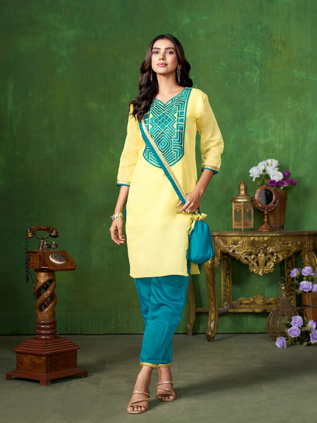 Yellow Chanderi Silk Embroidered Straight Kurta Salwar With Potli bag