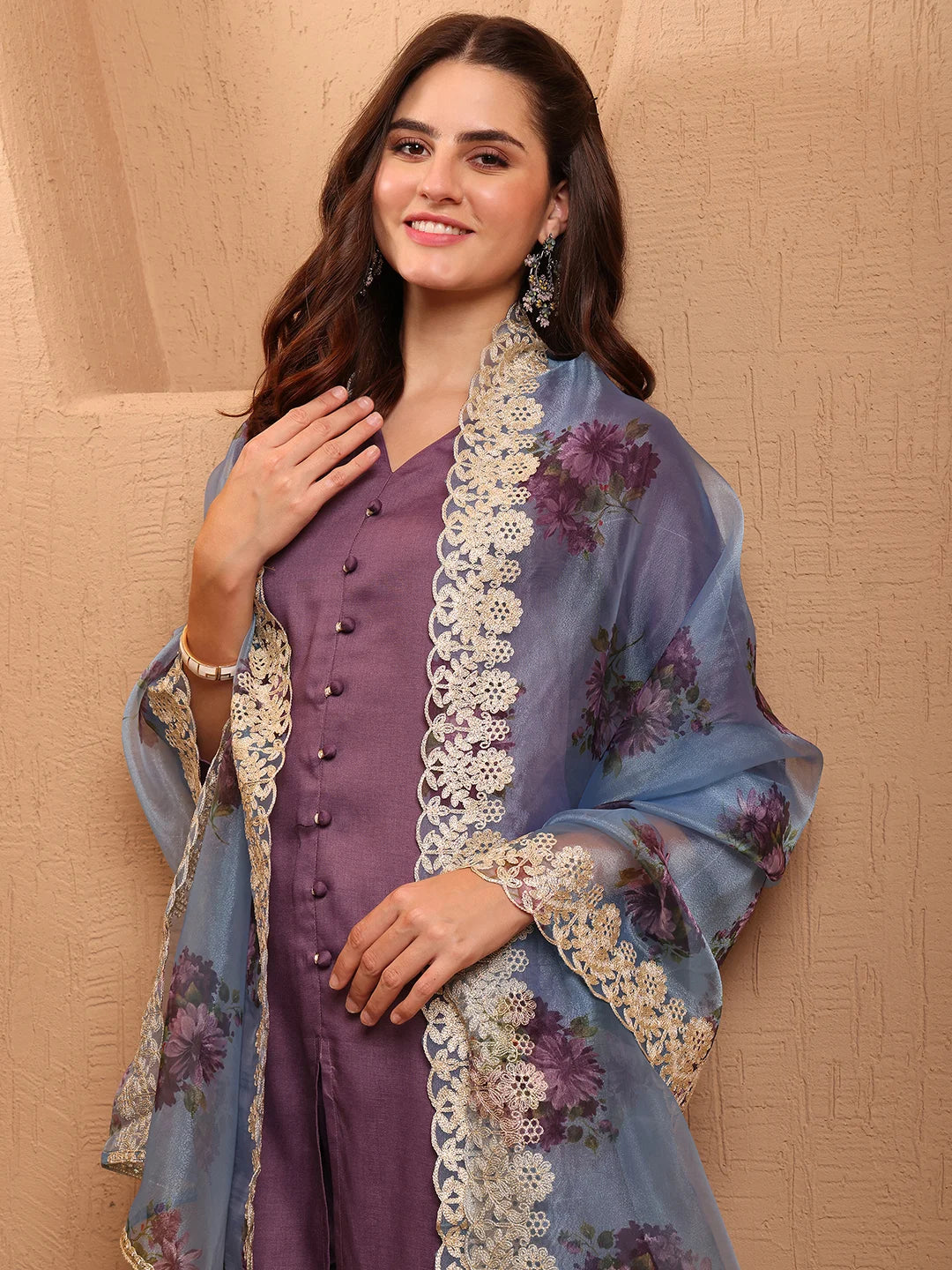 Lavender Cotton Silk Solid Hight Front Slit A-Line Kurta Palazzo With Organza Dupatta Set