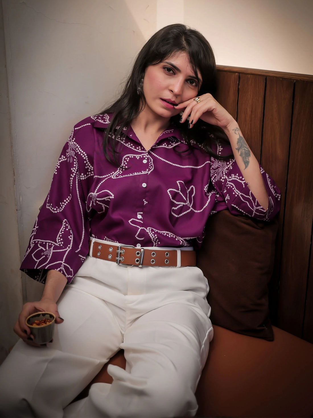 Upgrade your casual wardrobe with this chic Wine Rayon Bandhani print and Embroidered Boxy Shirt....