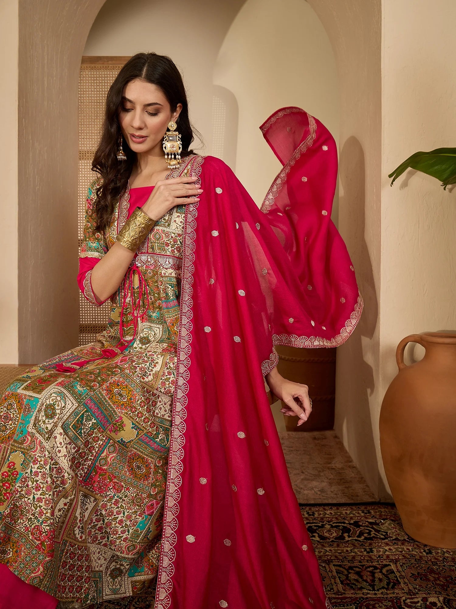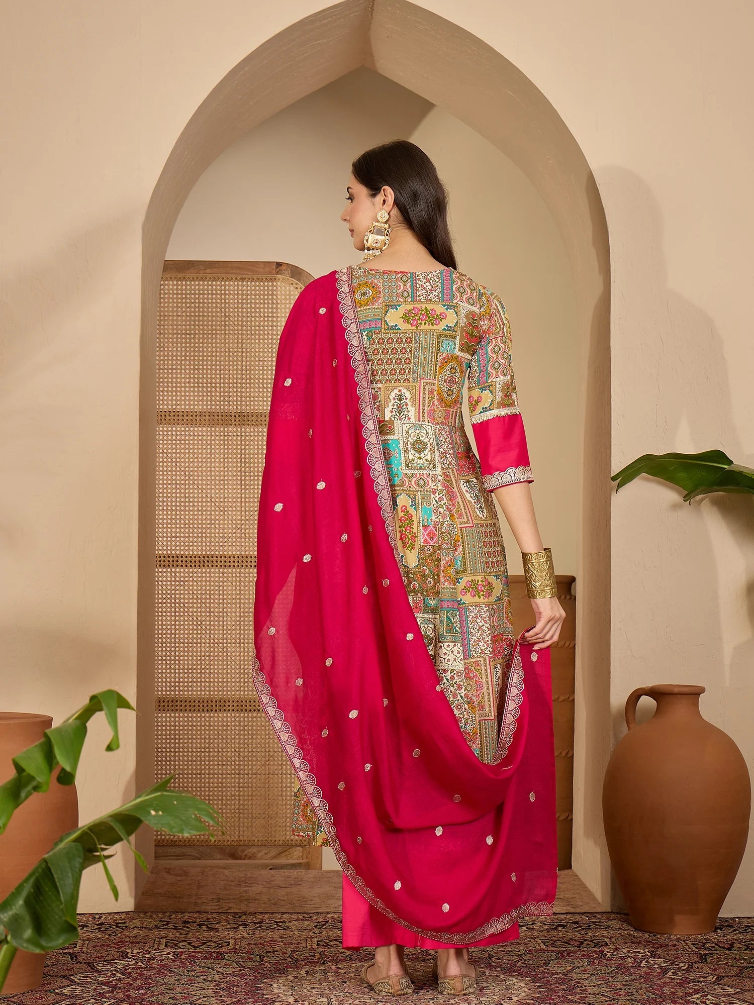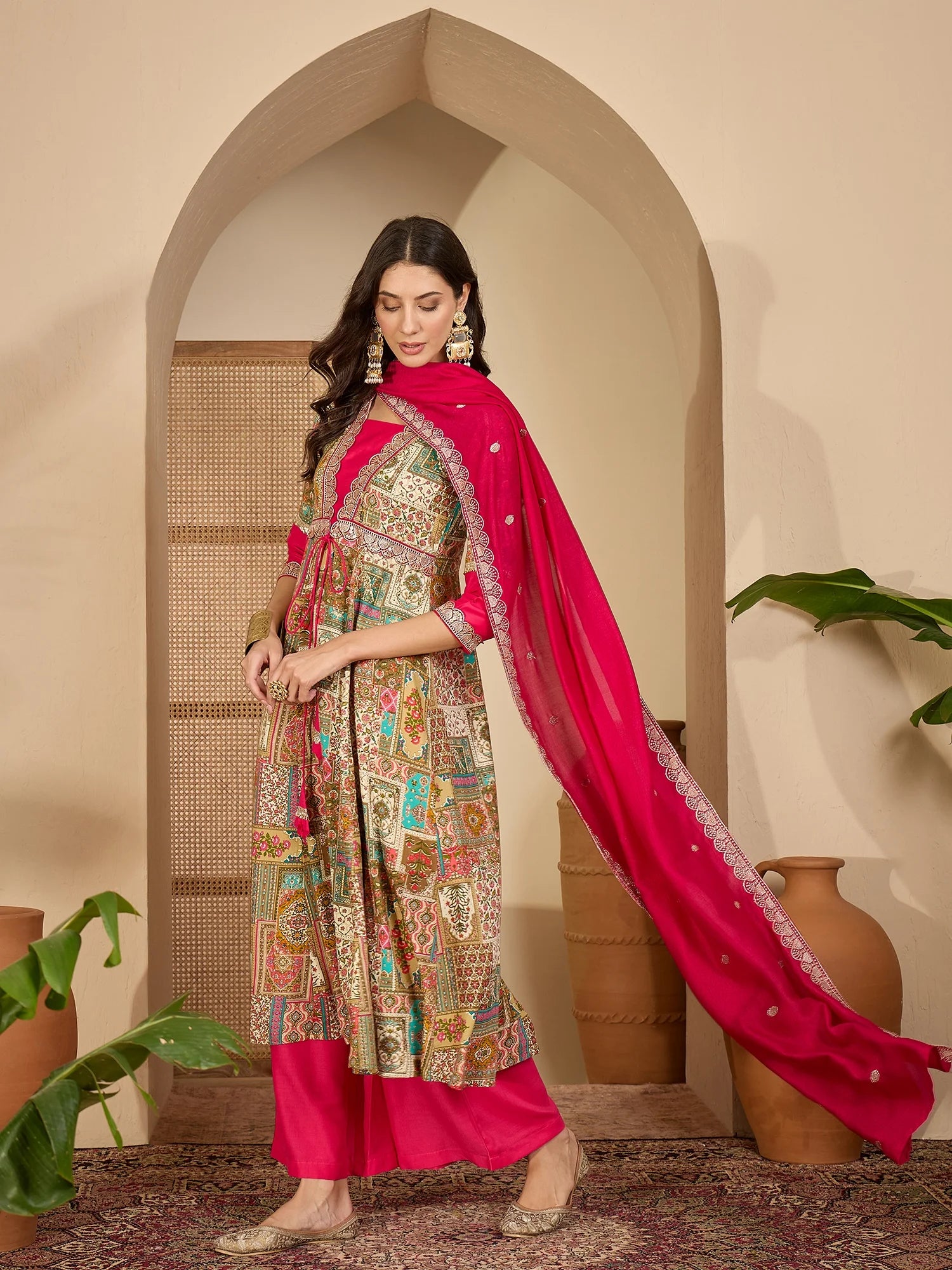 Beige Viscose Rayon Embroidered Anarkali Kurta Palazzo with Dupatta Set
