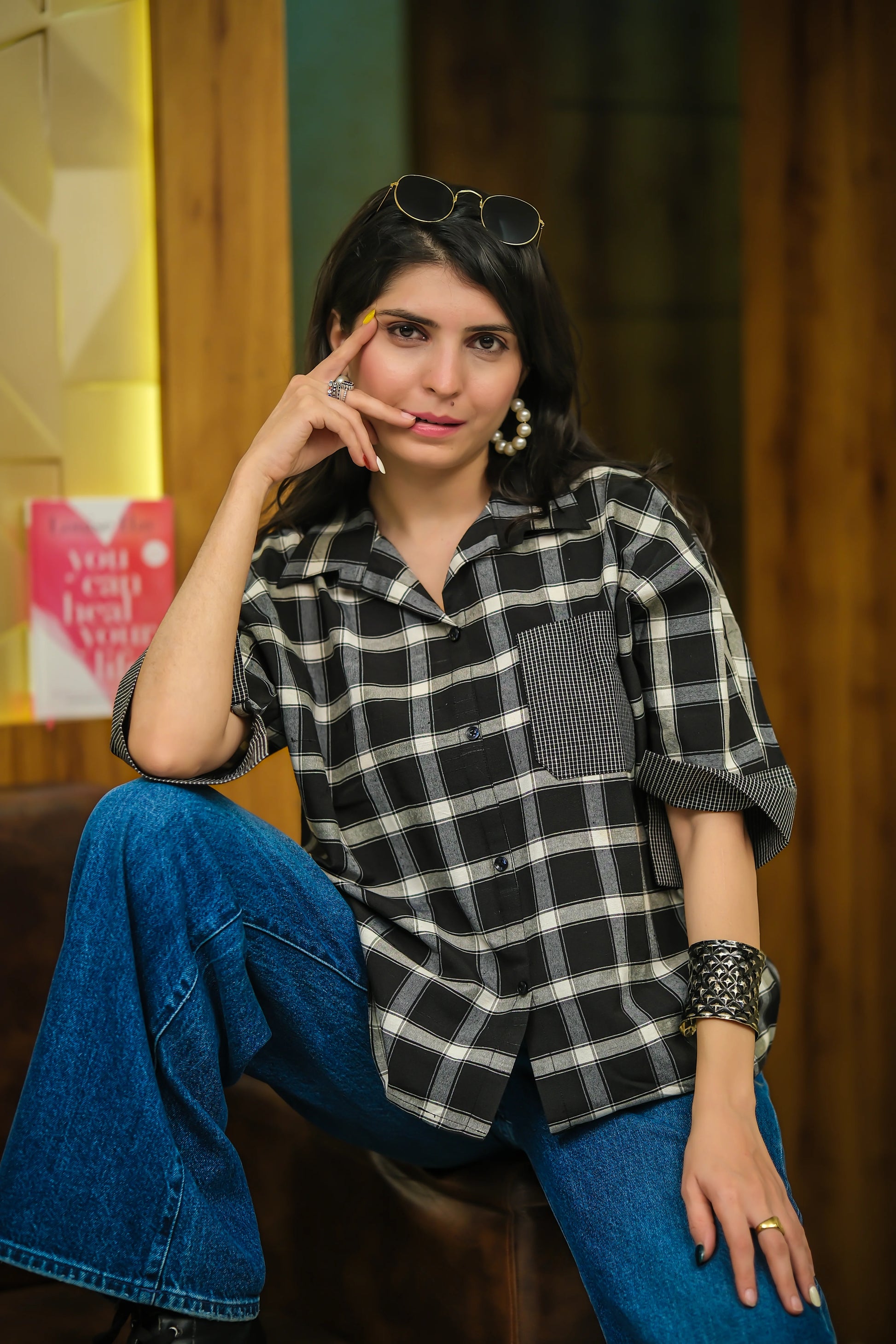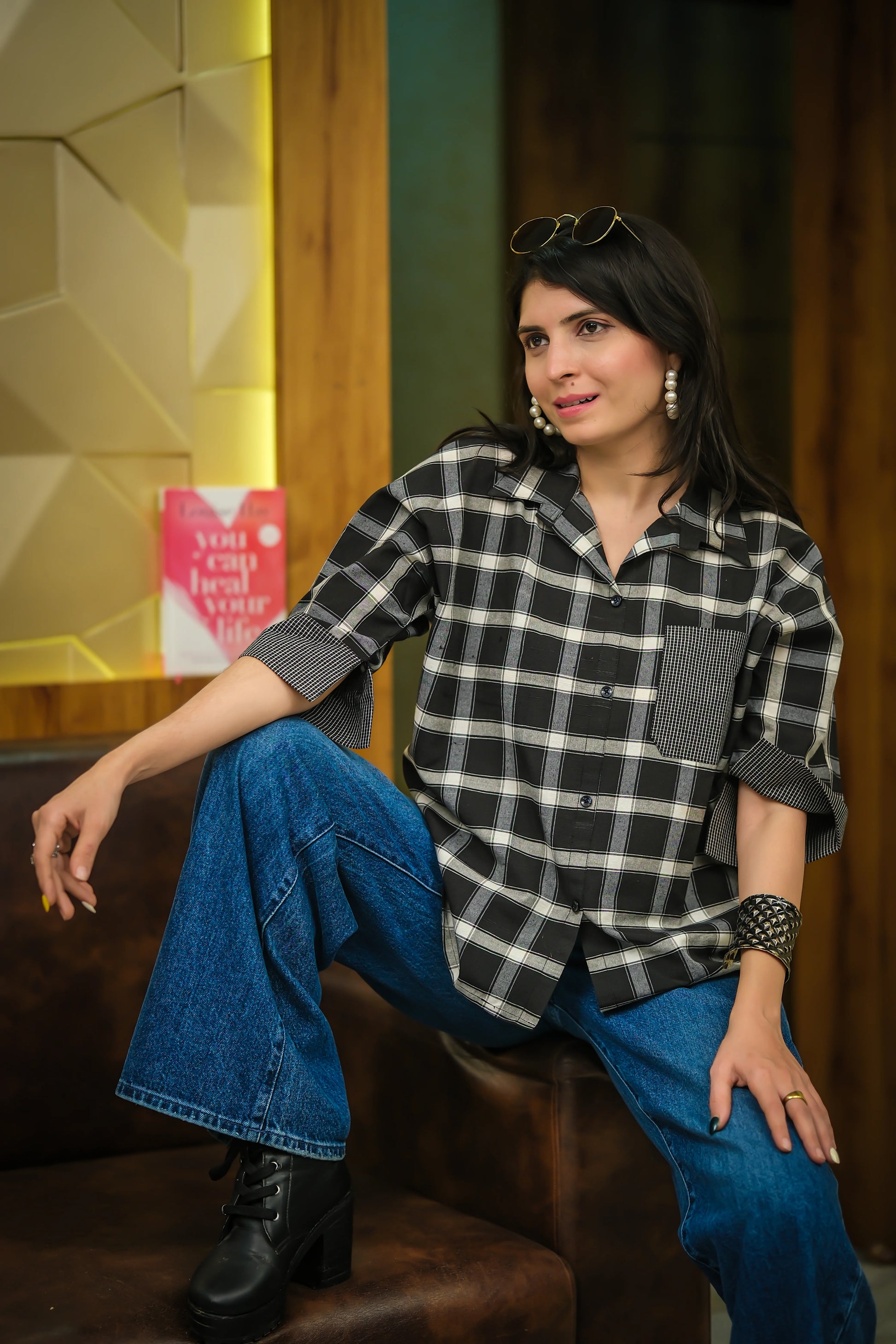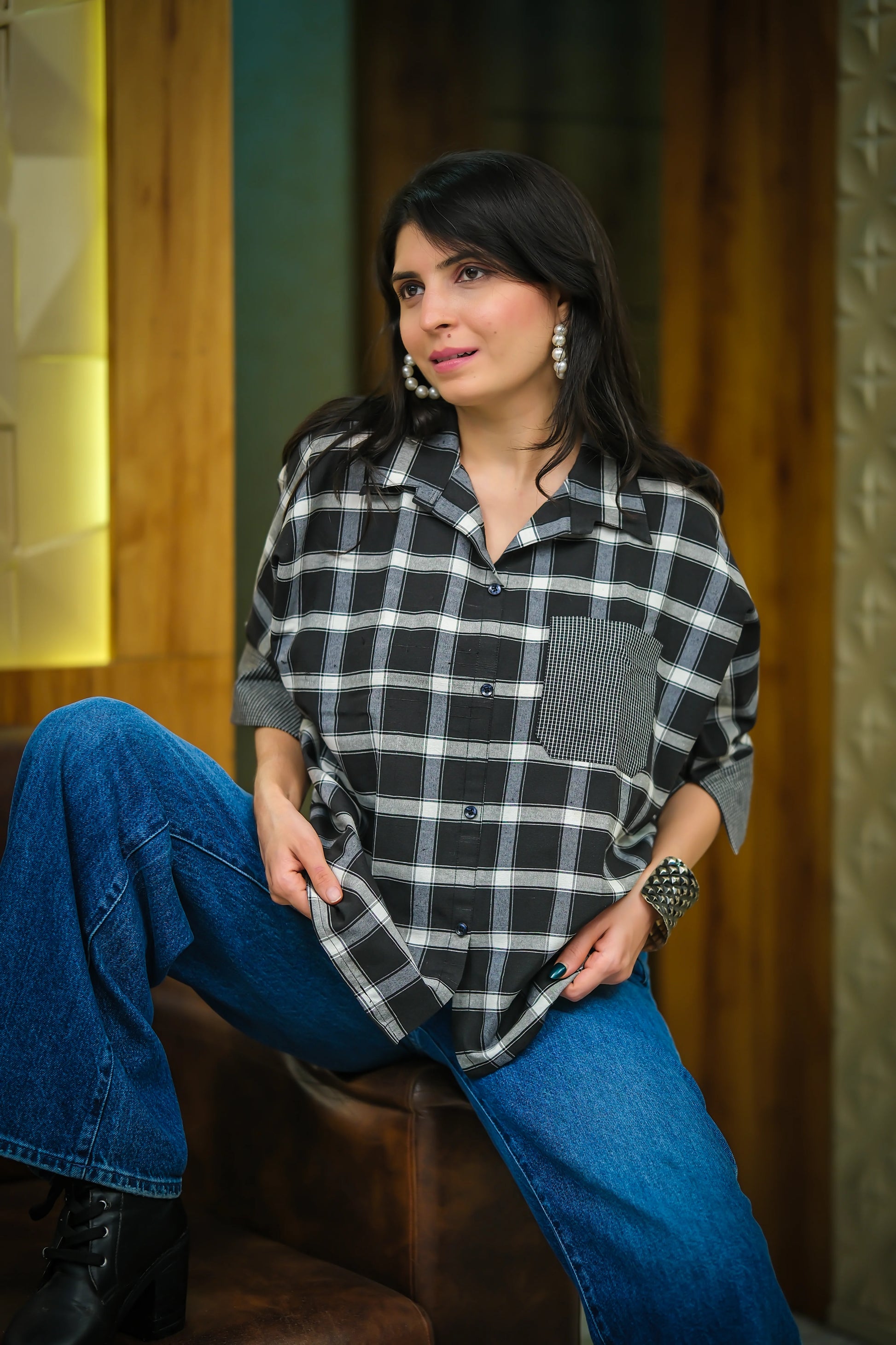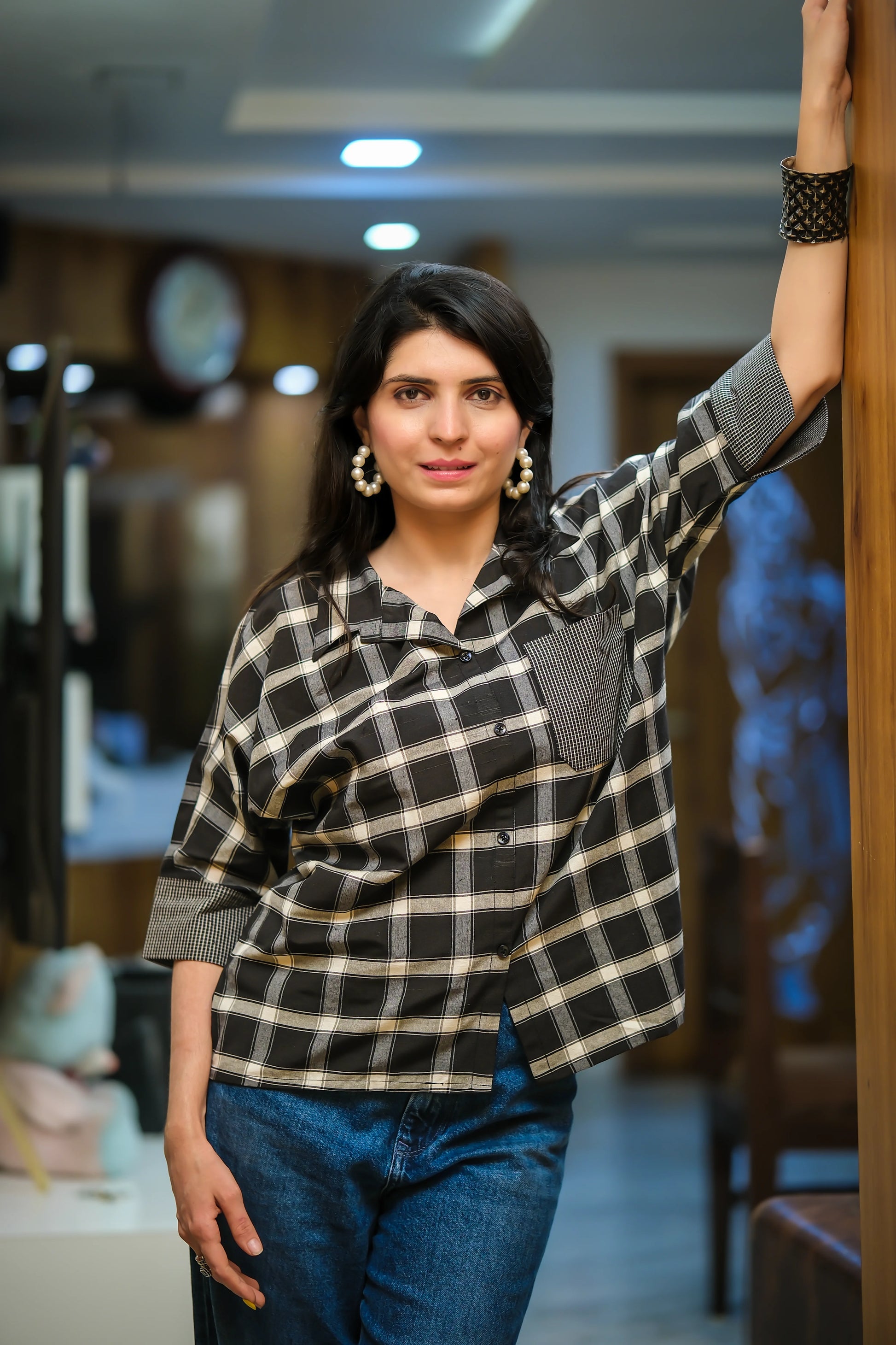 Upgrade your casual wardrobe with this chic Black Cotton Blend Checked Boxy Shirt. Designed in a relaxed fit, it features a Checked base with contrasting printed details on the pocket and sleeve hems, adding a touch of ethnic flair to its modern silhouette. The button-down front and soft cotton-silk fabric ensure comfort with effortless style. Perfect for pairing with jeans, trousers, or skirts, this versatile shirt is ideal for both casual outings and smart-casual looks.