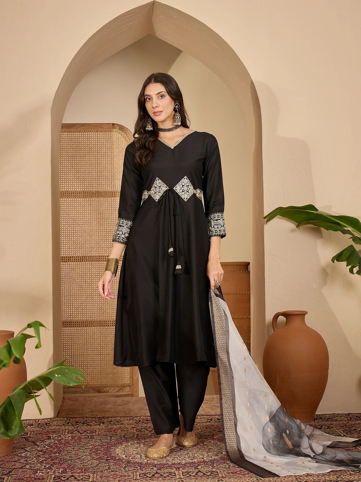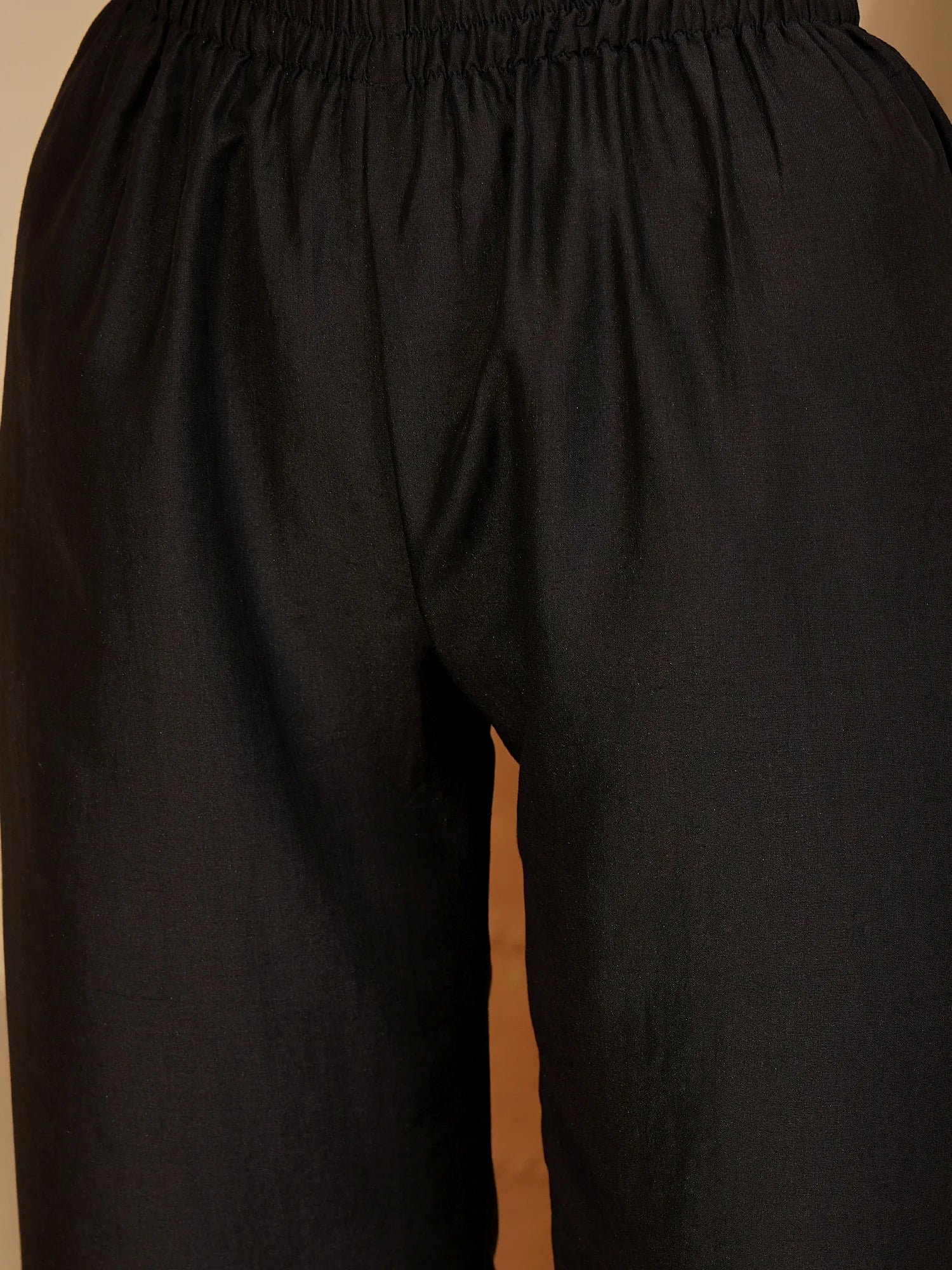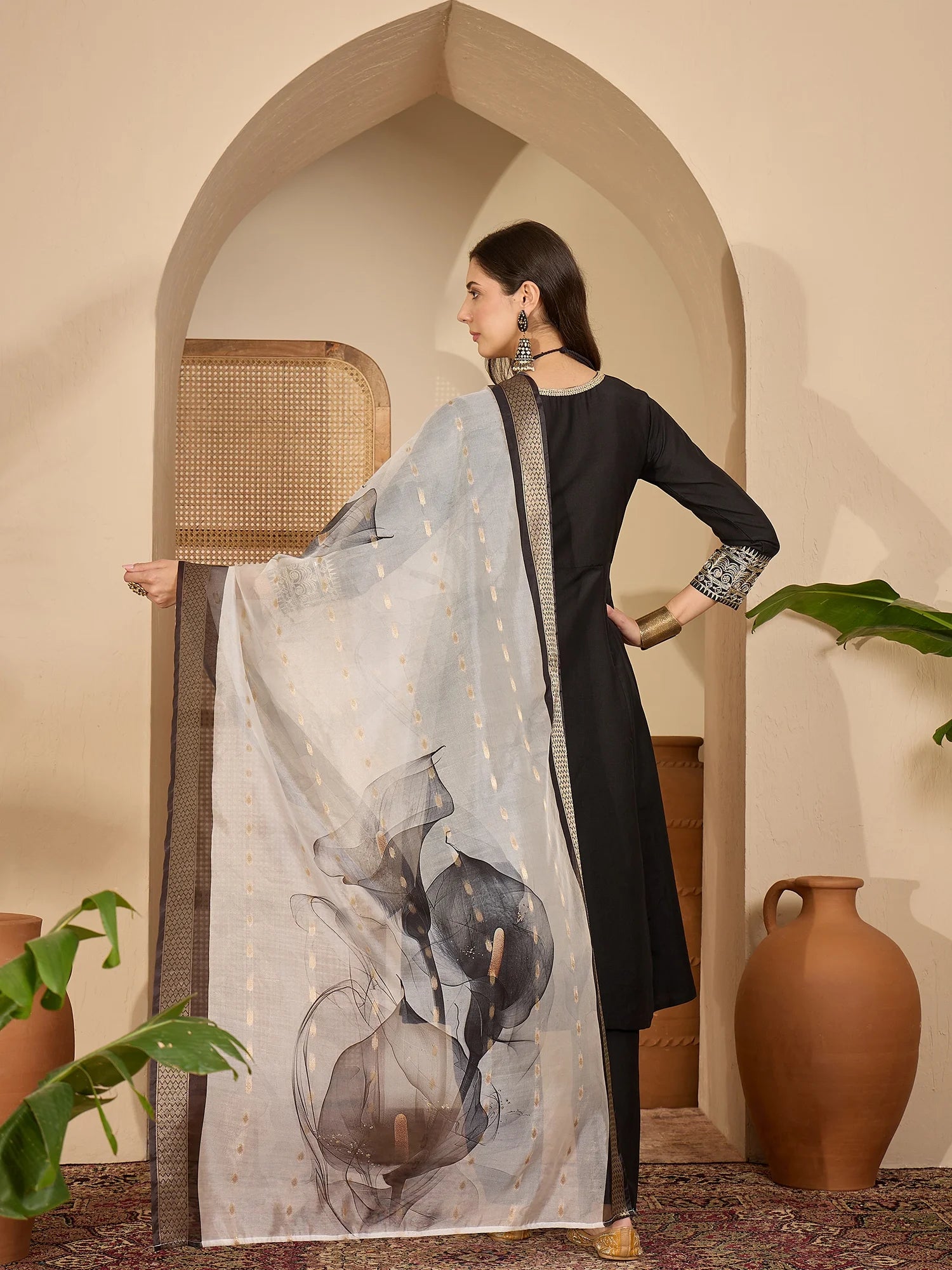 Black Cotton Silk Embroidered Anarkali Kurta Palazzo With Digital Print Dupatta Set