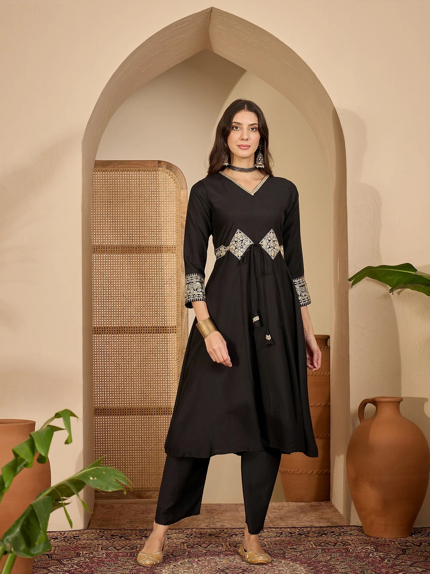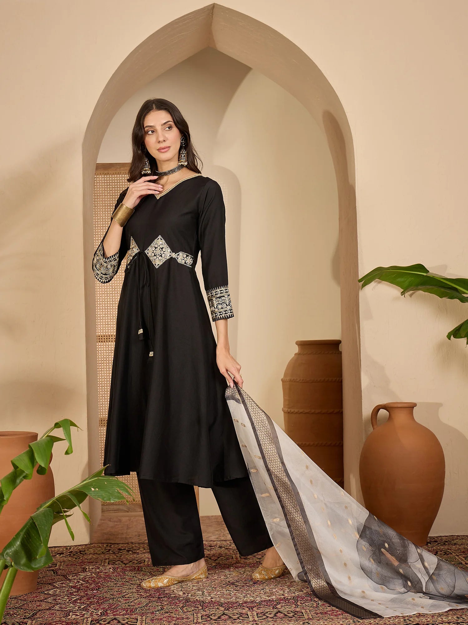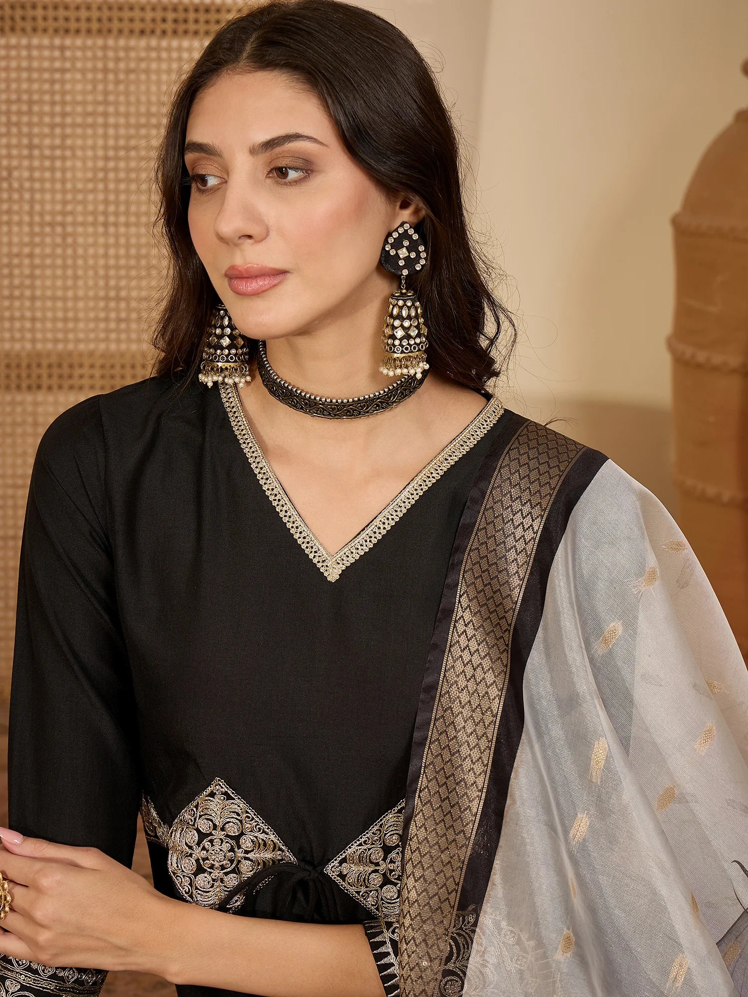 Black Cotton Silk Embroidered Anarkali Kurta Palazzo With Digital Print Dupatta Set