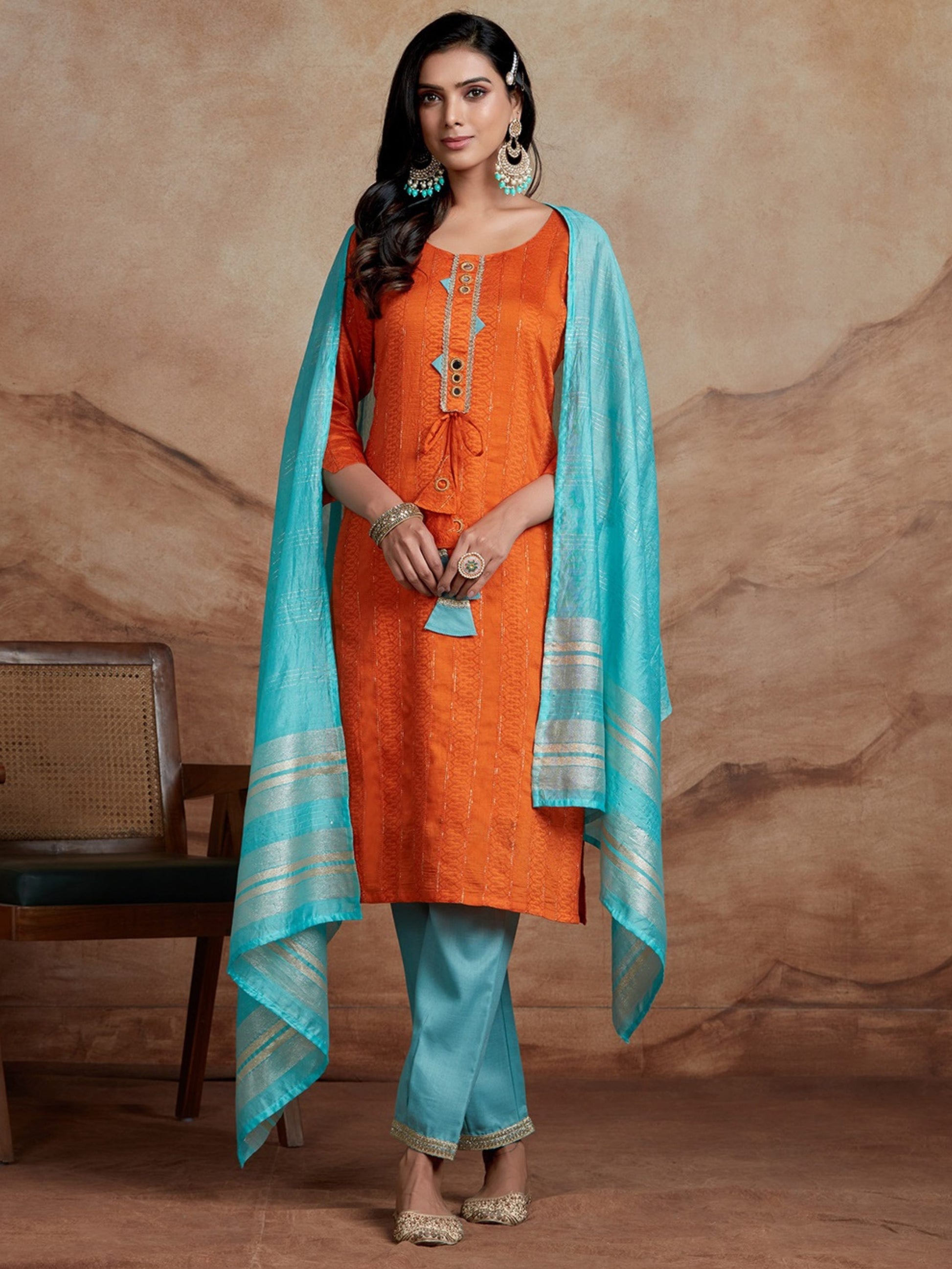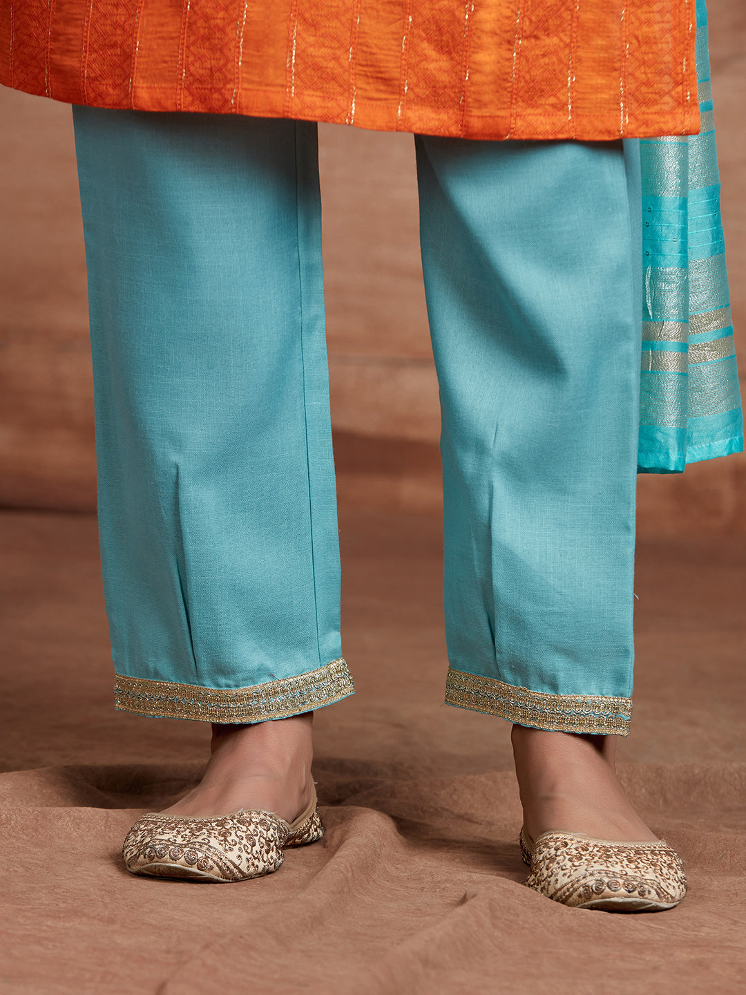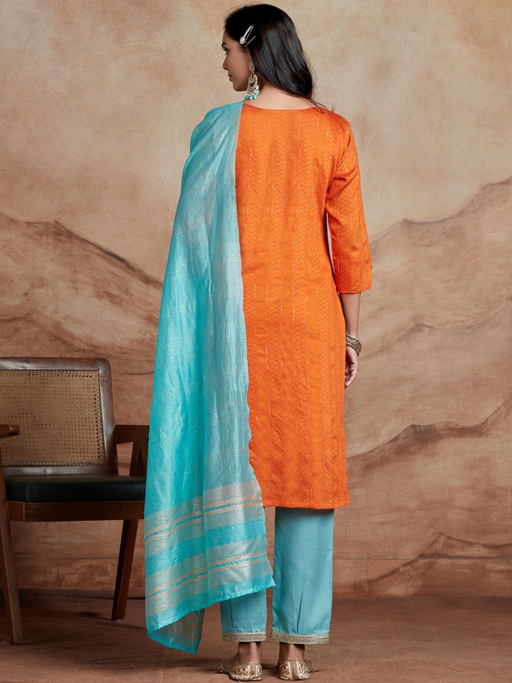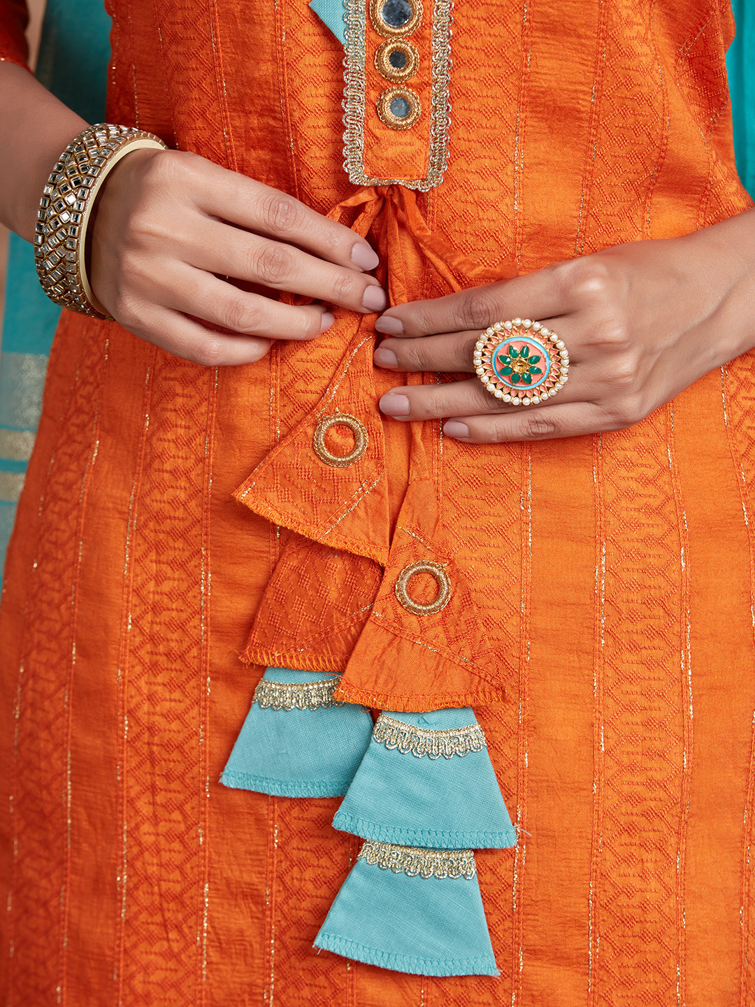 Orange Silk Blend Woven Zari Mirror Work Straight Kurta Pant and Dupatta Set