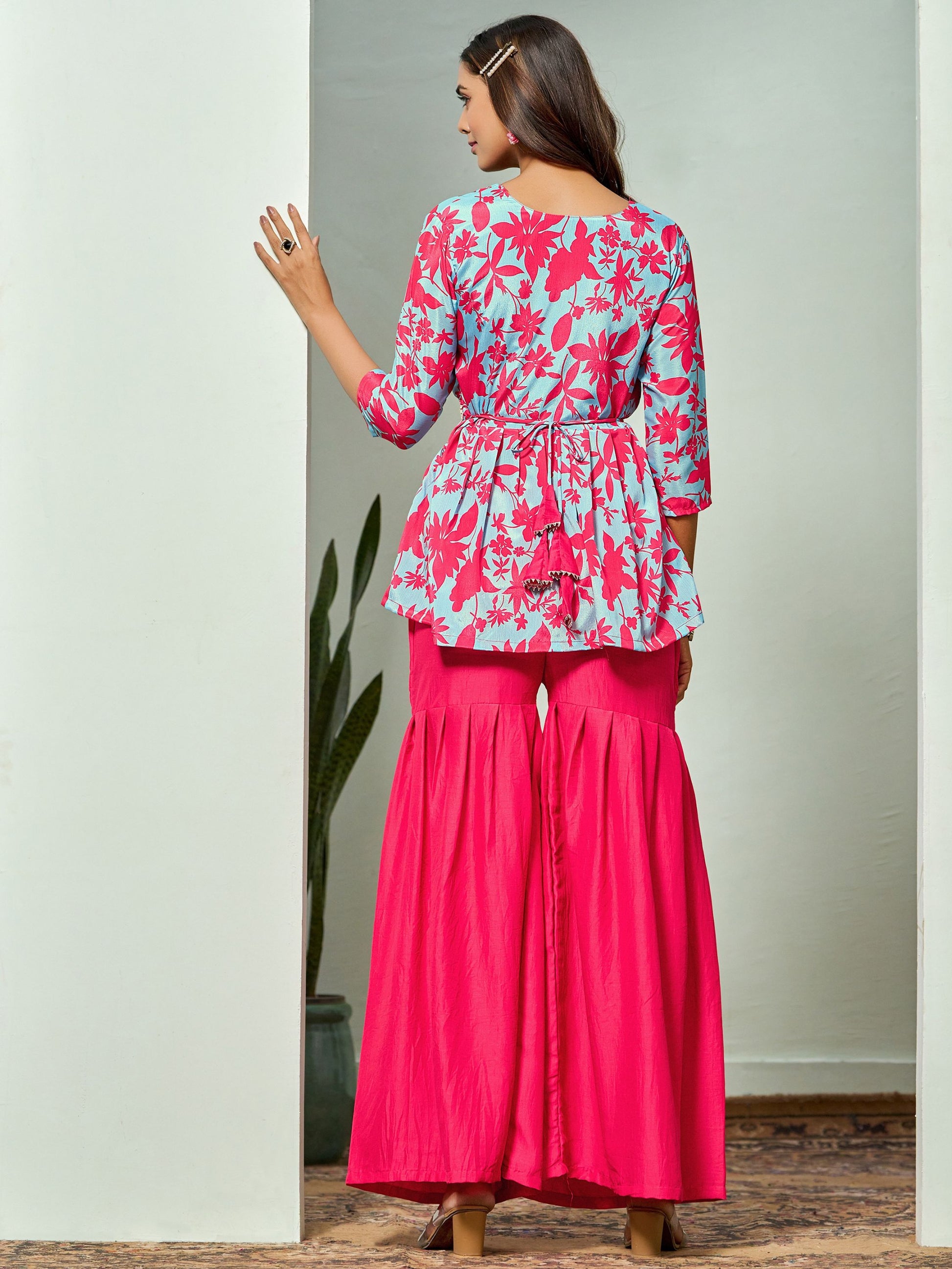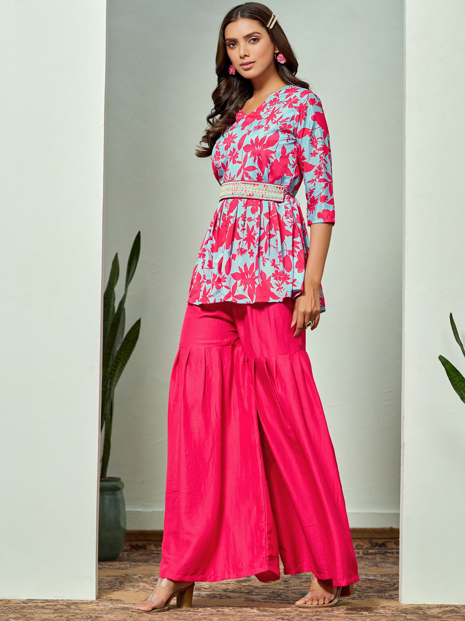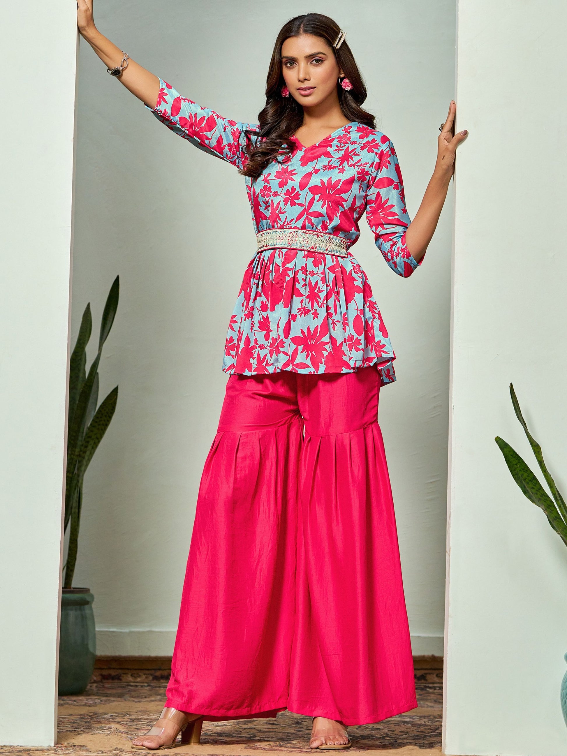 This A-line Kurta Sharara Set With Embroidered Belt can be classified and can also be worn with Palazzo or jeans.Crafted in Chinon fabric,the pretty colour of this kurti will surely elevate your festival Style. Kurti Fabric : Chinon , Kurta Style: A-line Style Floral Print Kurta Sharara Set. Sleeve Length: 3/4 Sleeves Kurti Length : 41 inches approx.Wash Care Instructions - Dry Clean