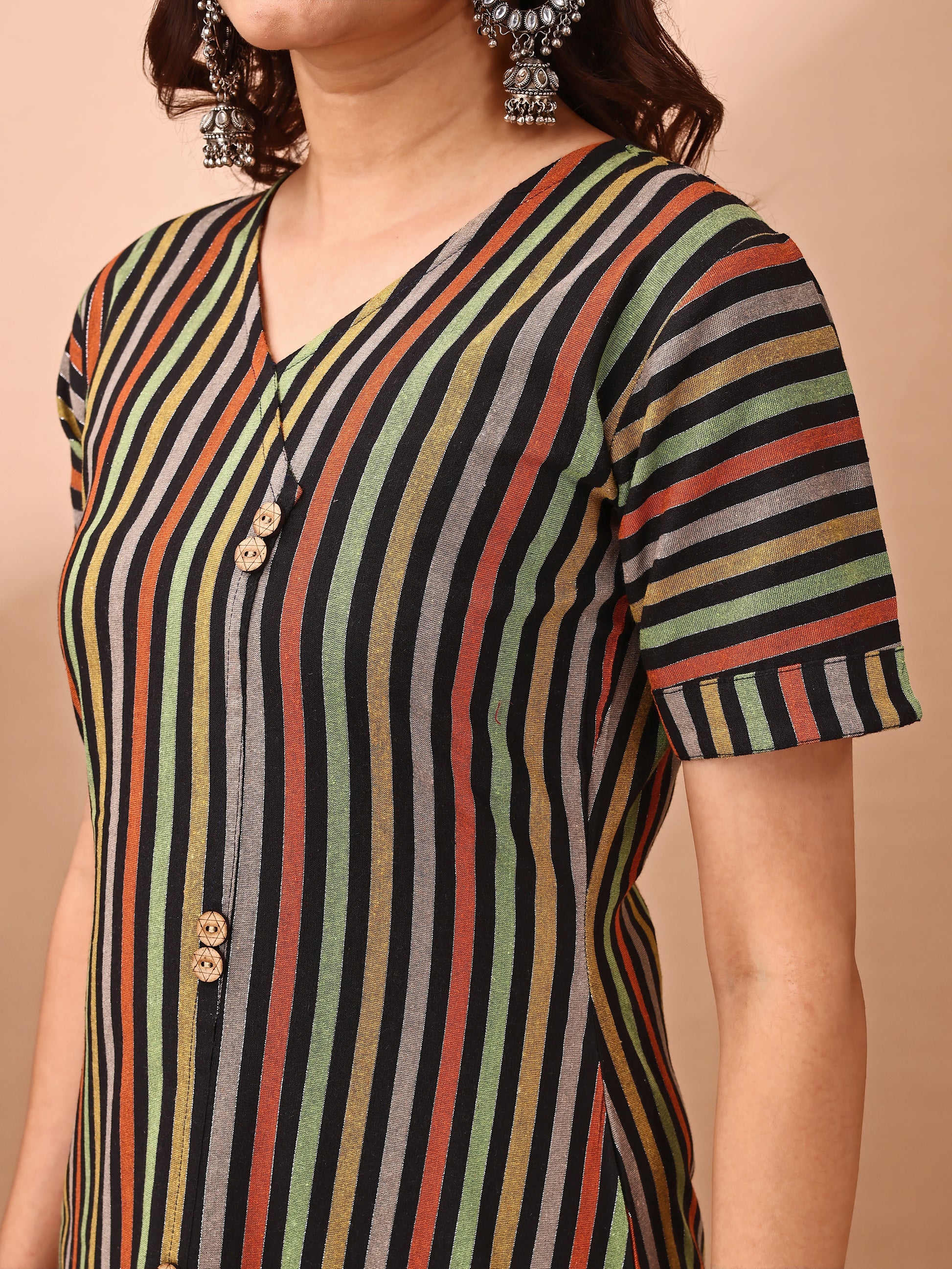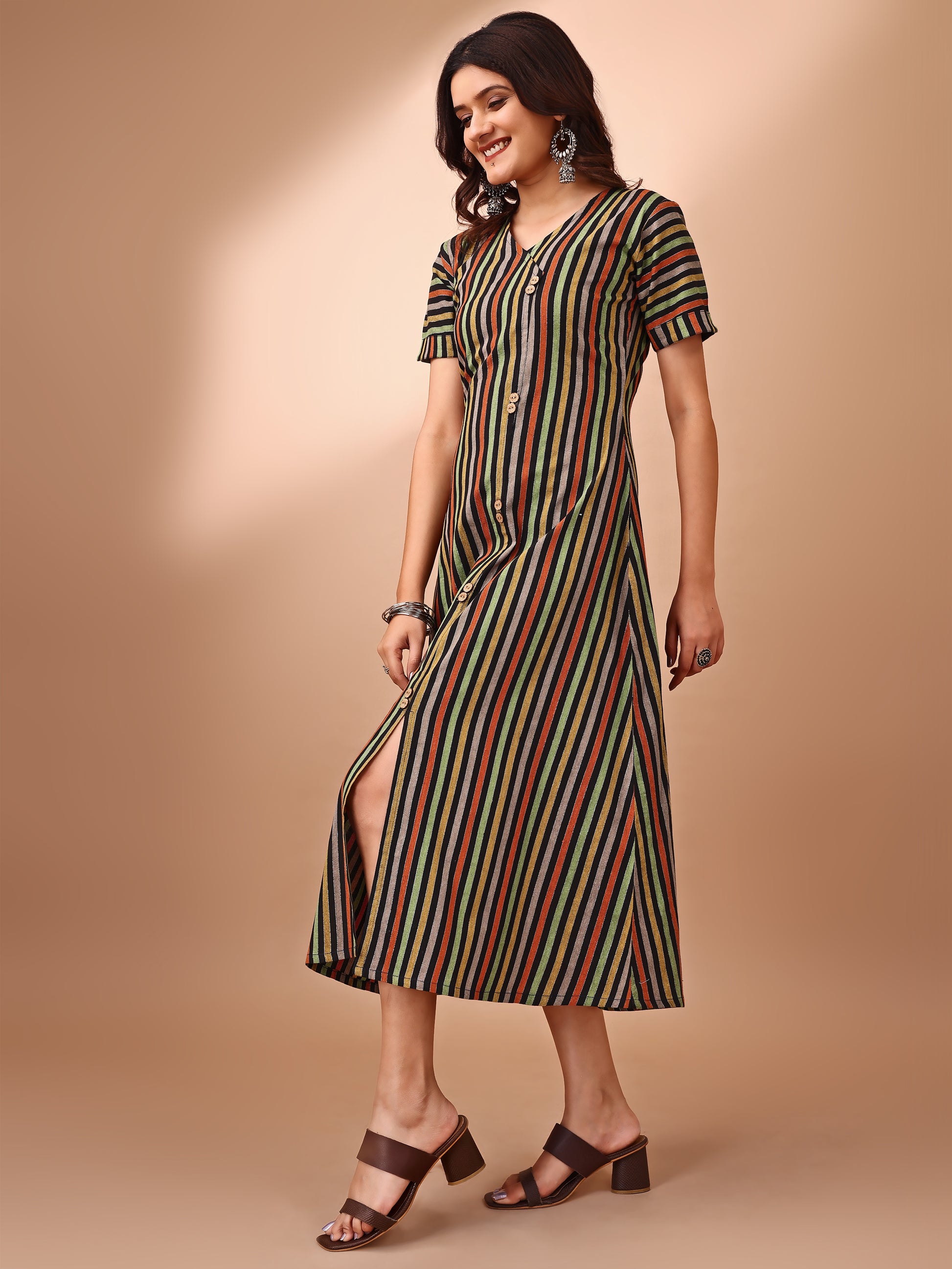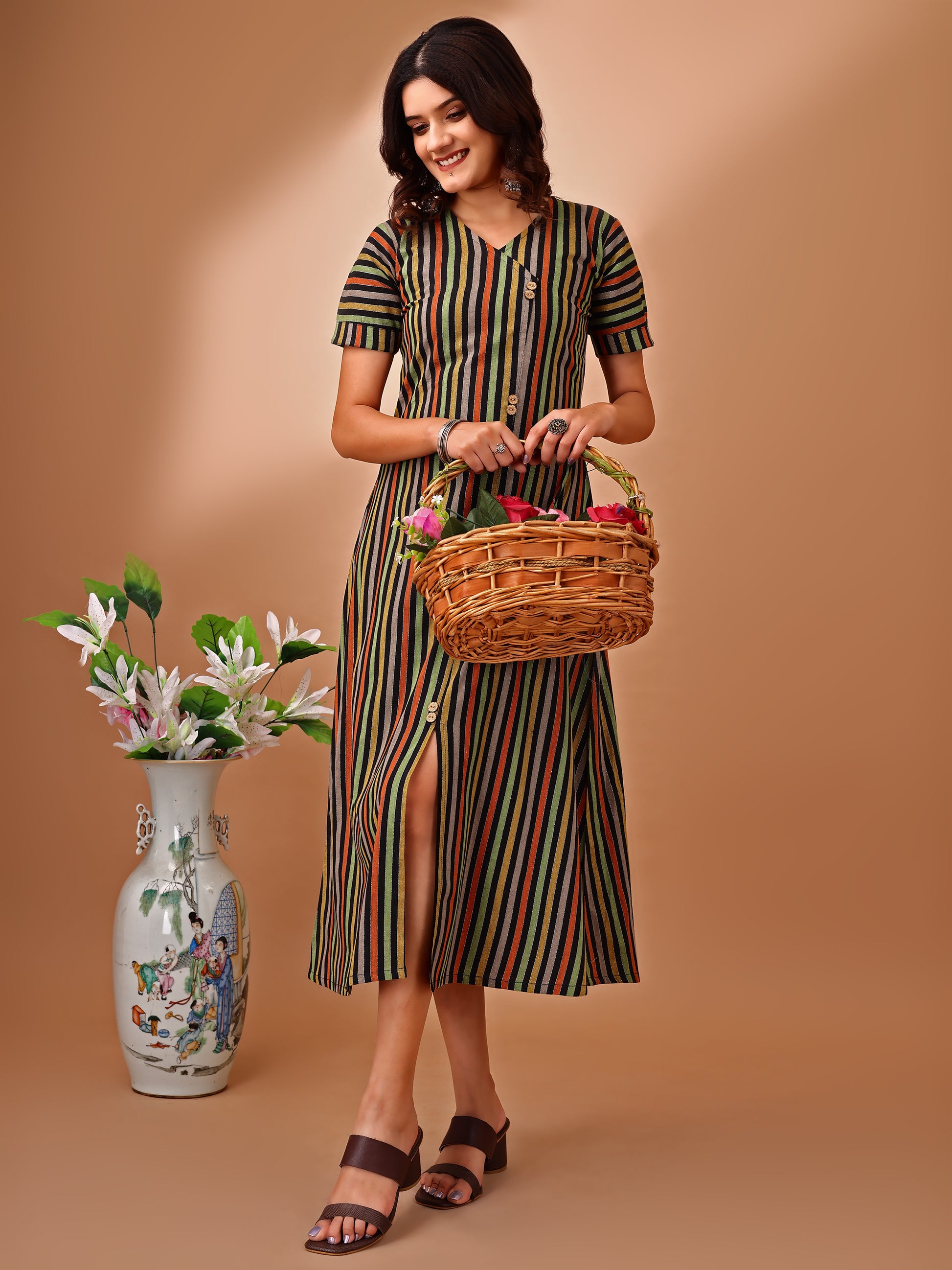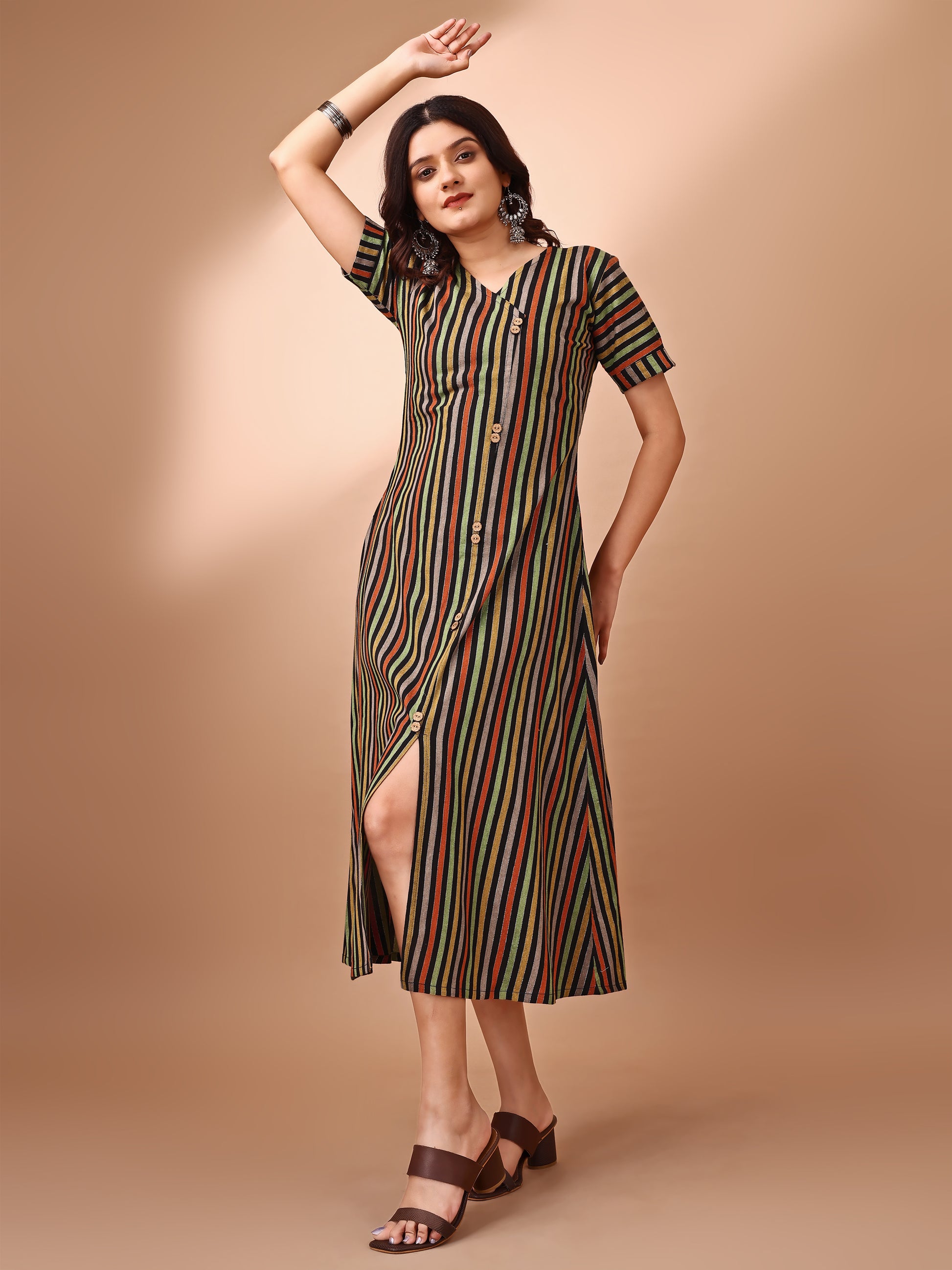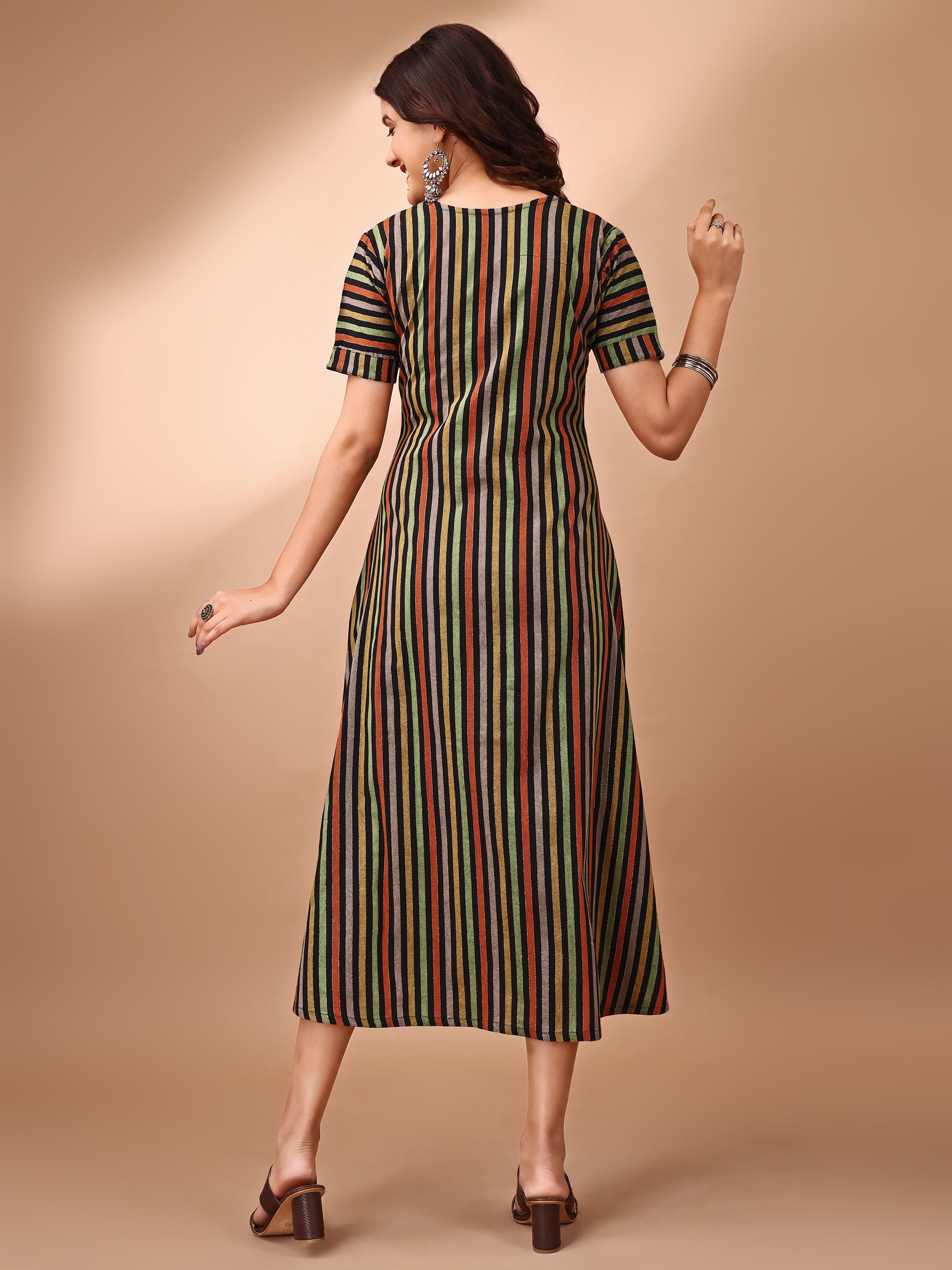 A fresh fusion of traditional charm and modern swag Slay the day in our A-line Striped Dress is Perfect for the young Indian woman who's redefining desi chic, this stunning duo is a celebration of heritage and high style. Own your roots, own your style, and rock that desi girl magic