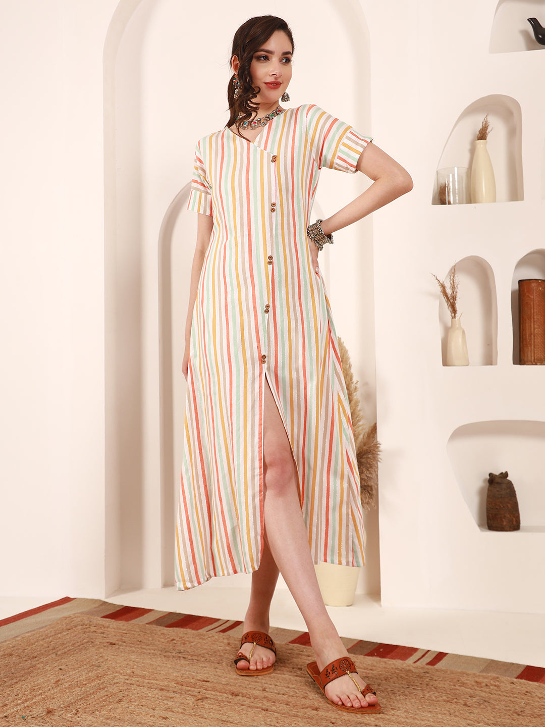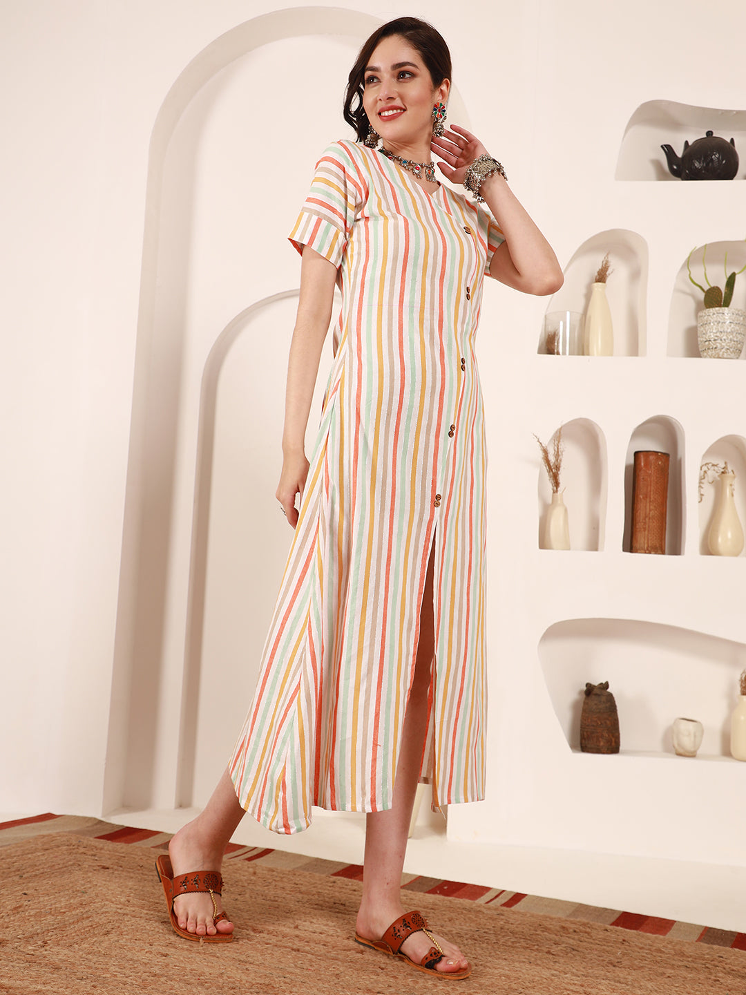 Multicolor Cotton Blend Striped Multicolor A-Line Dress