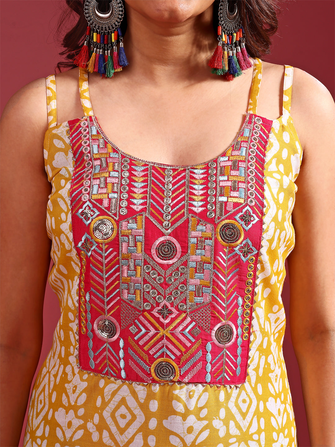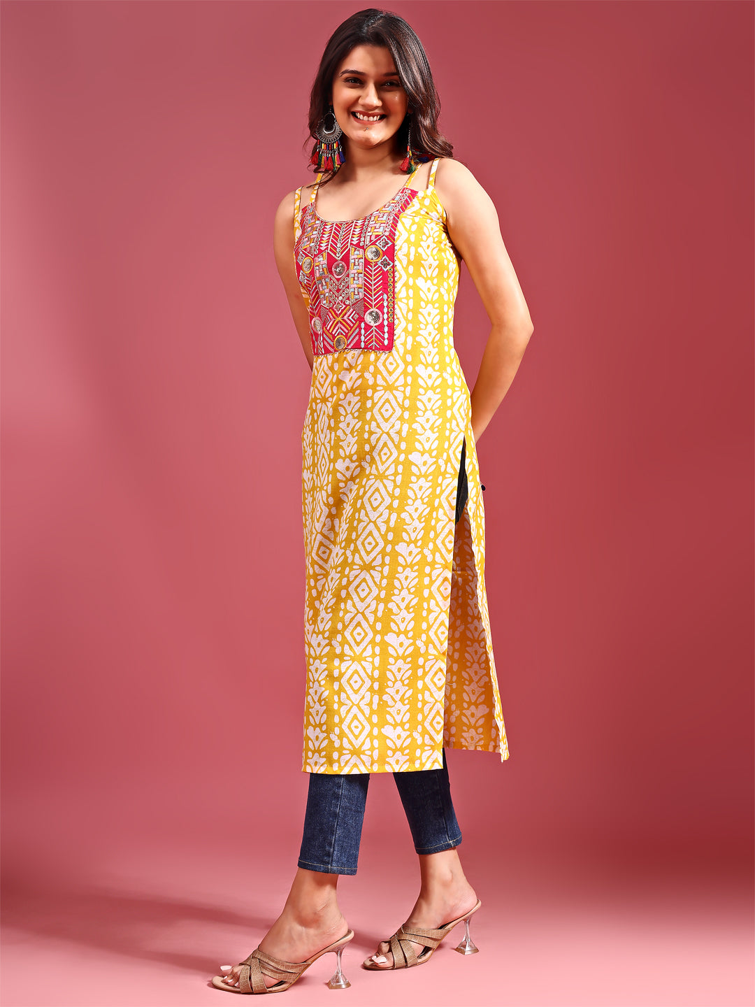 Cotton Blend Yellow Embroidered Batik Print Straight Shoulder Straps Summer Kurta