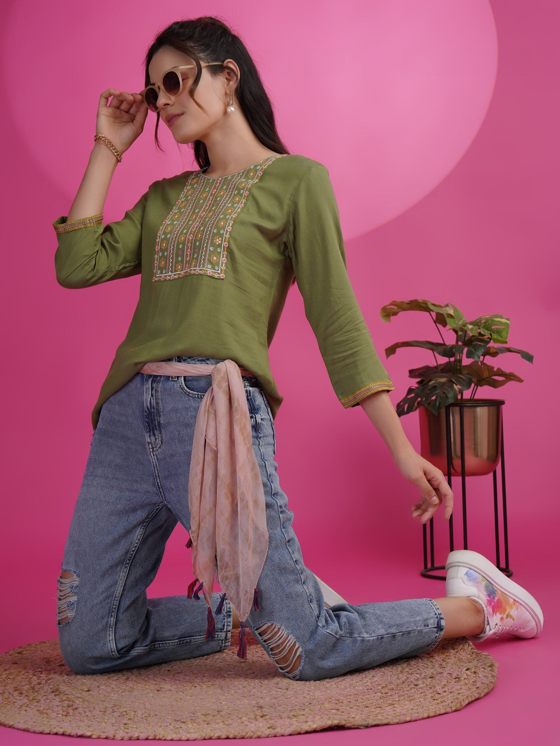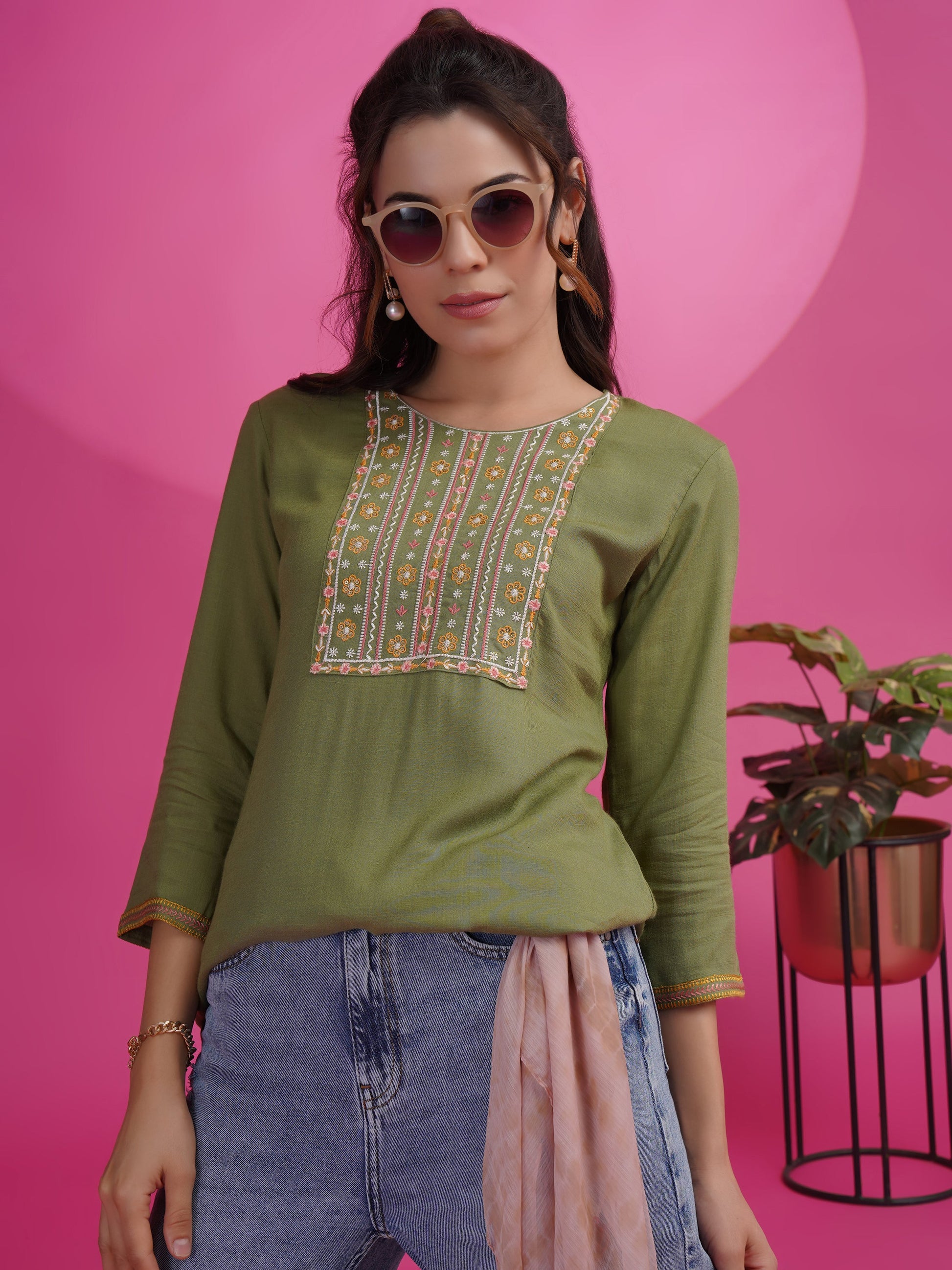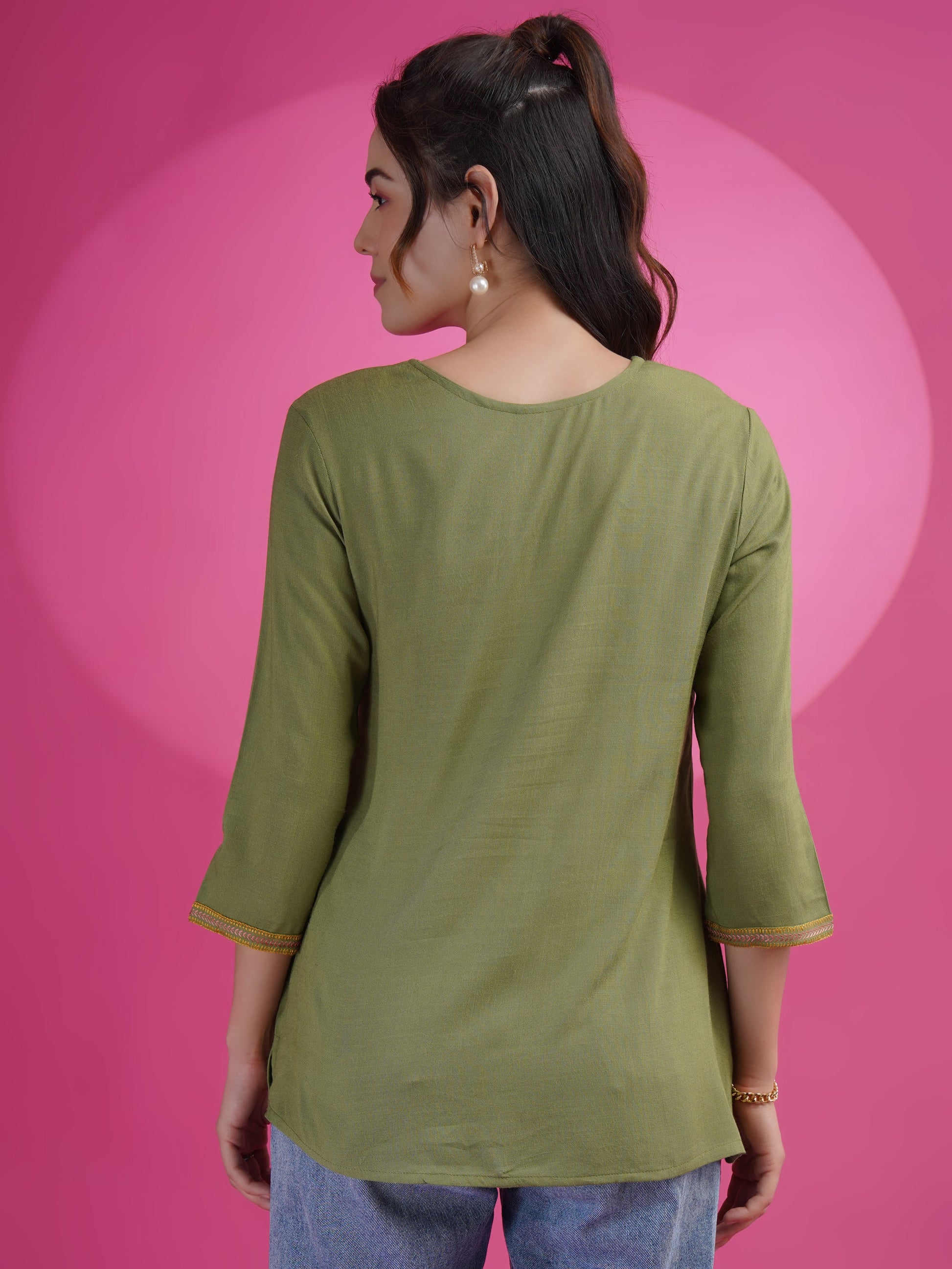 Dusty Green Cotton Rayon Embroidered Patch Work Short Kurti