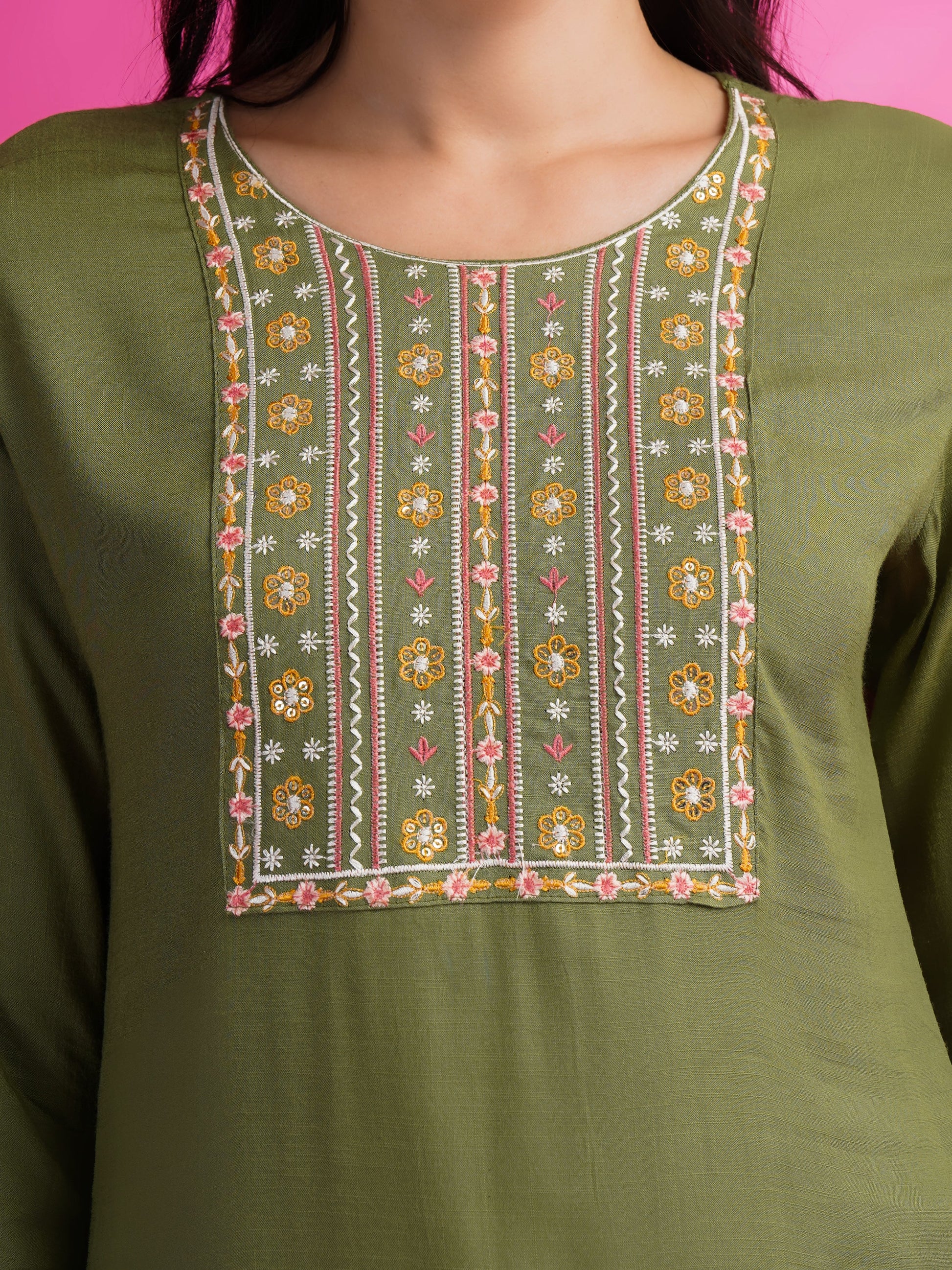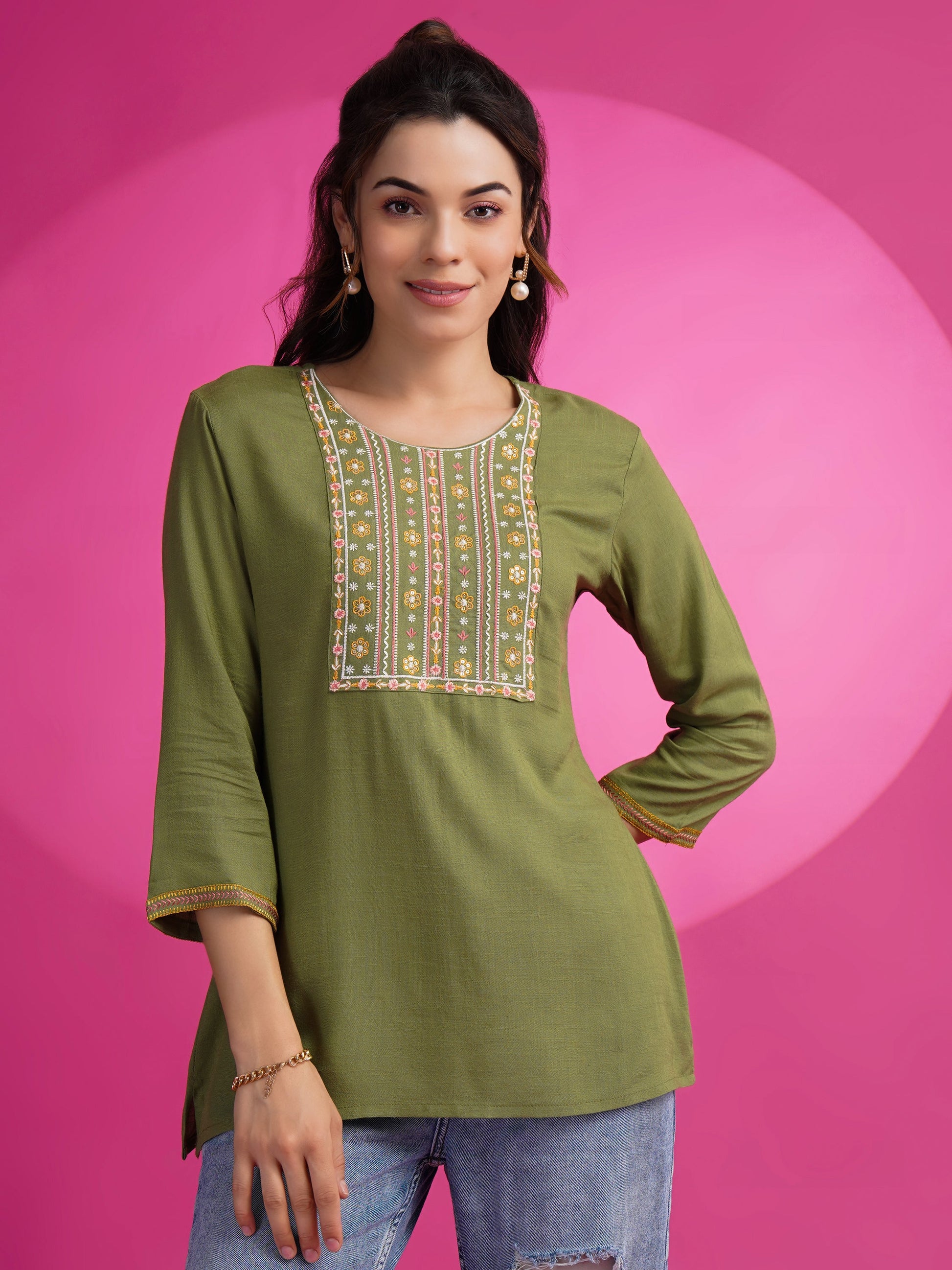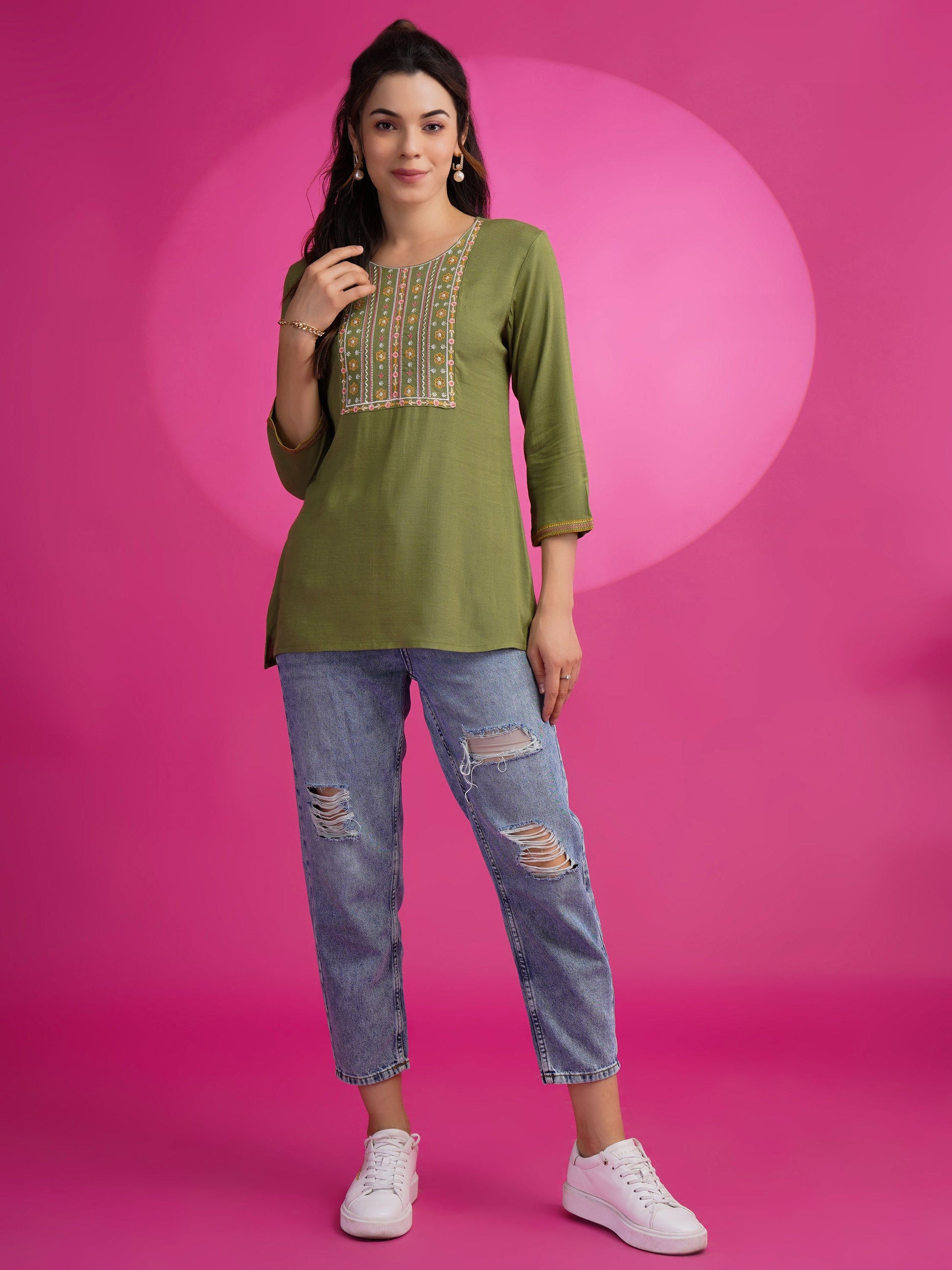 Dusty Green Cotton Rayon Embroidered Patch Work Short Kurti