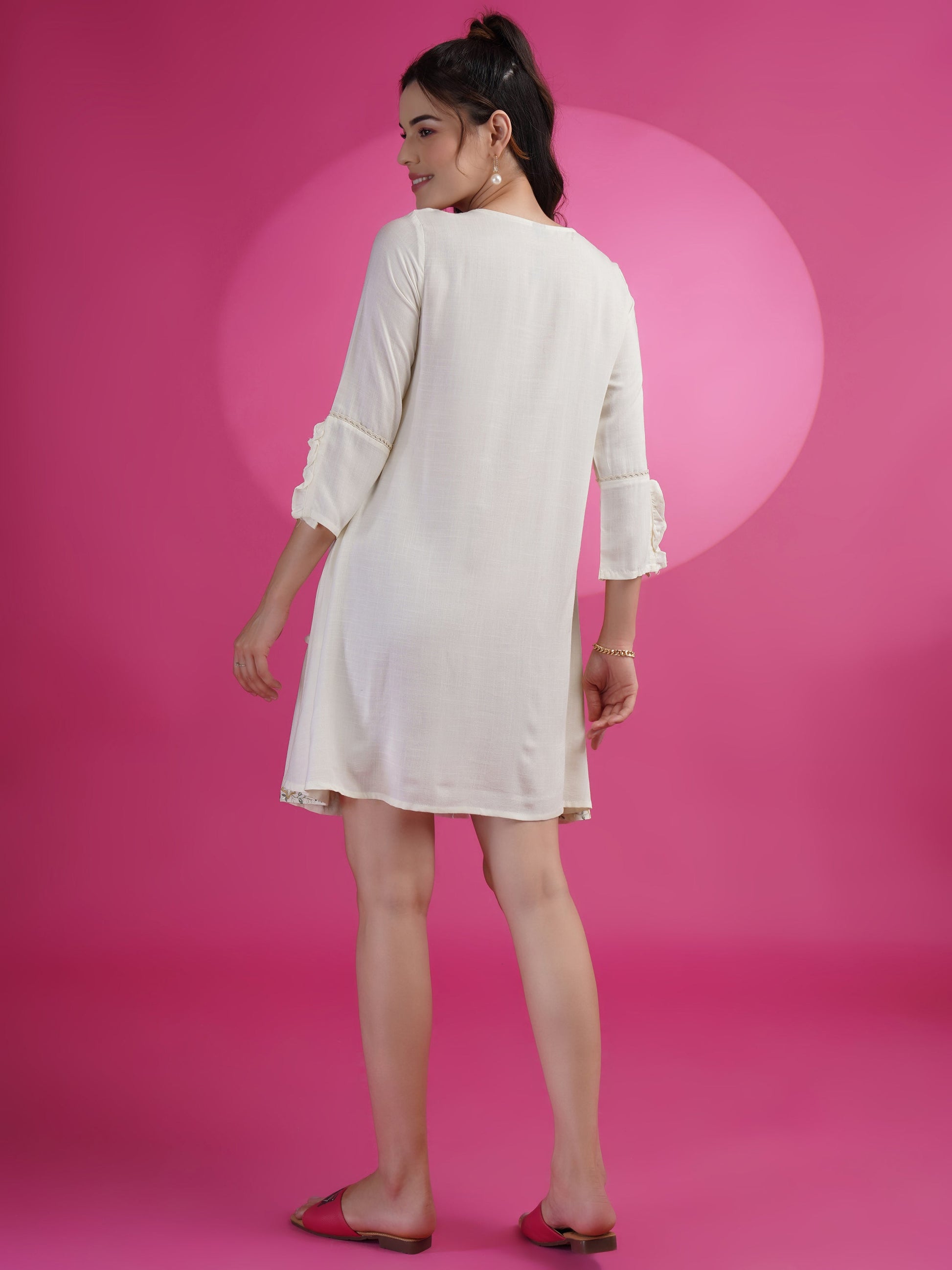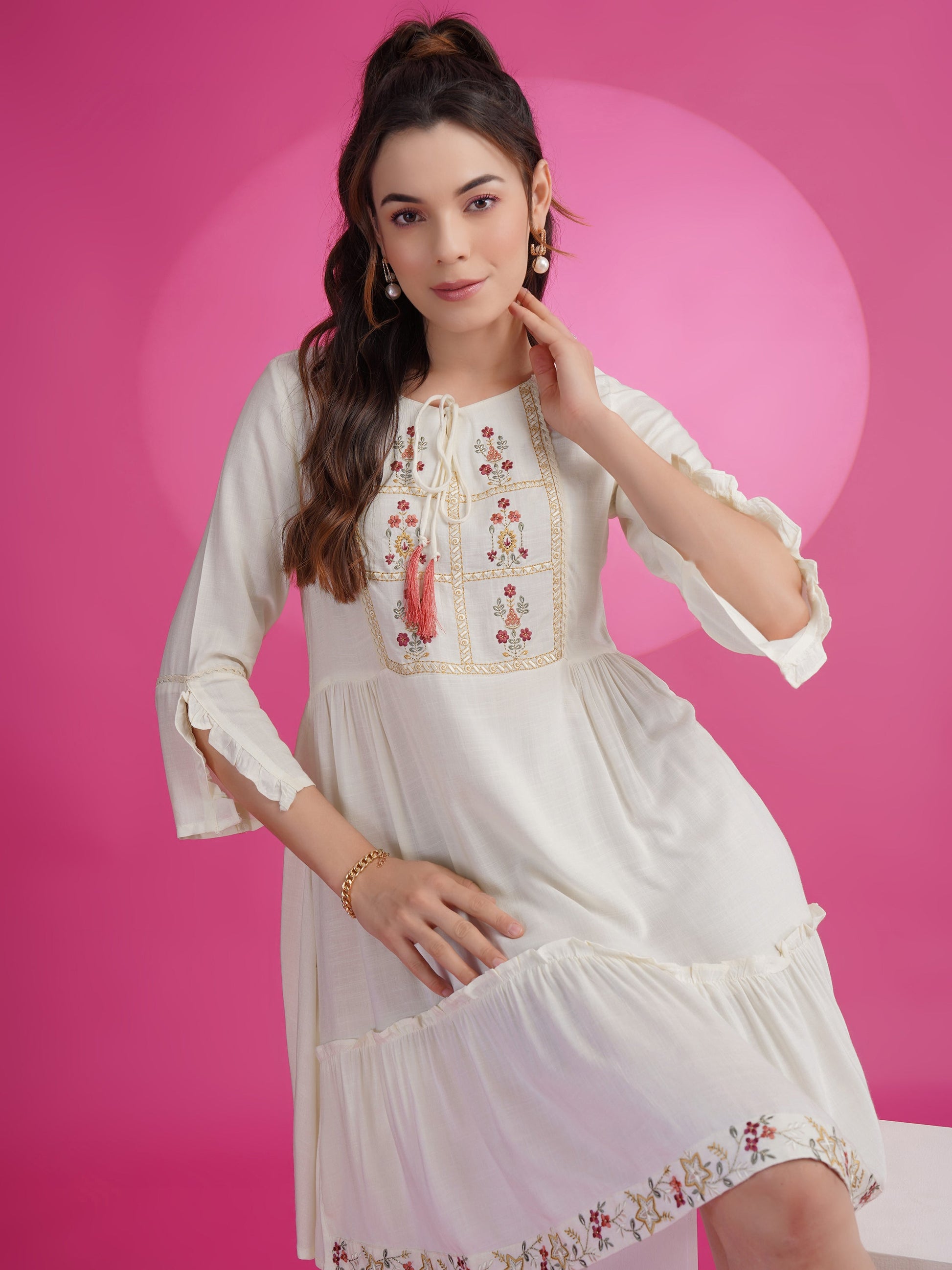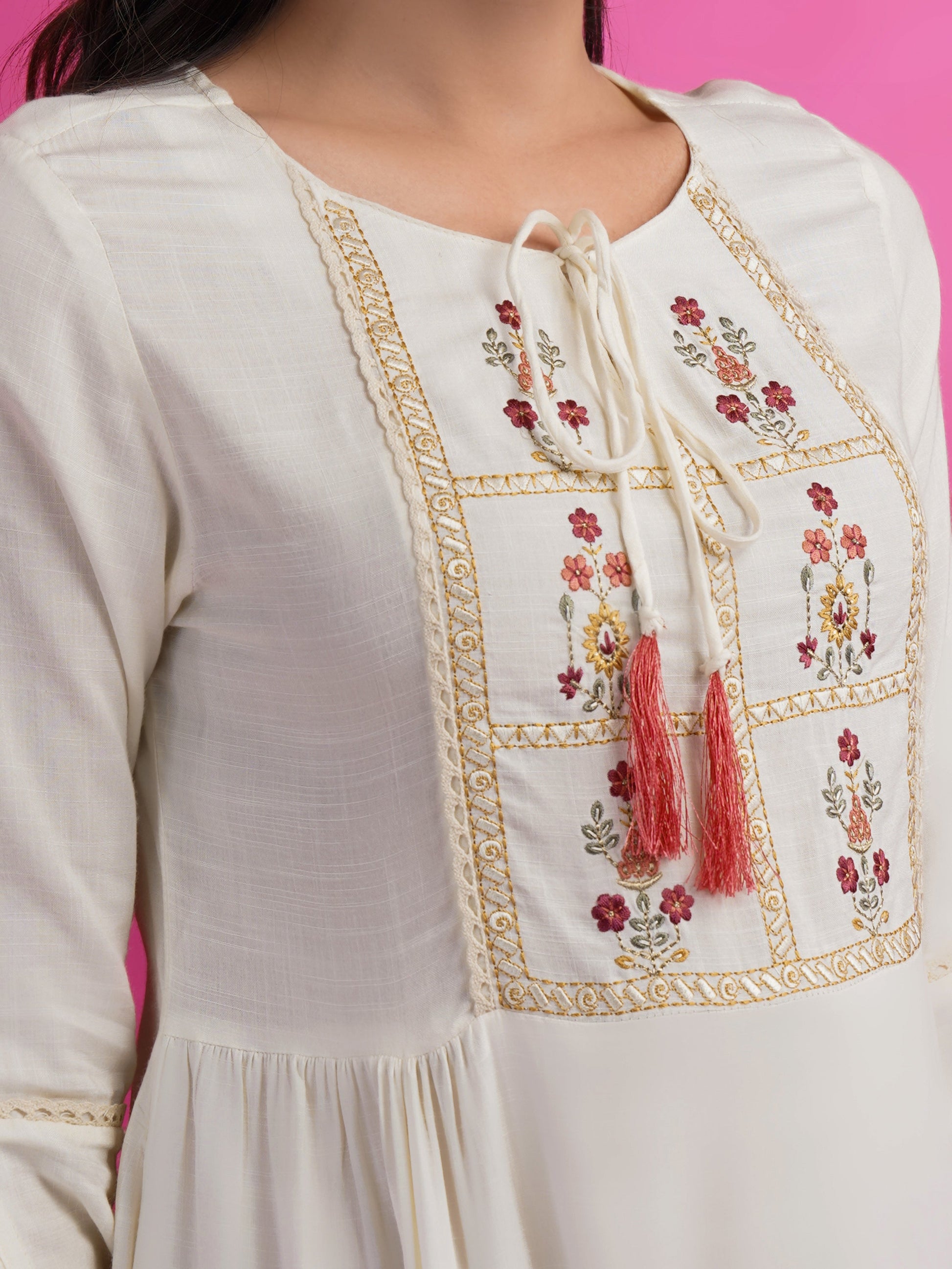 White Cotton Rayon Fit & Flare Embroidered Dress