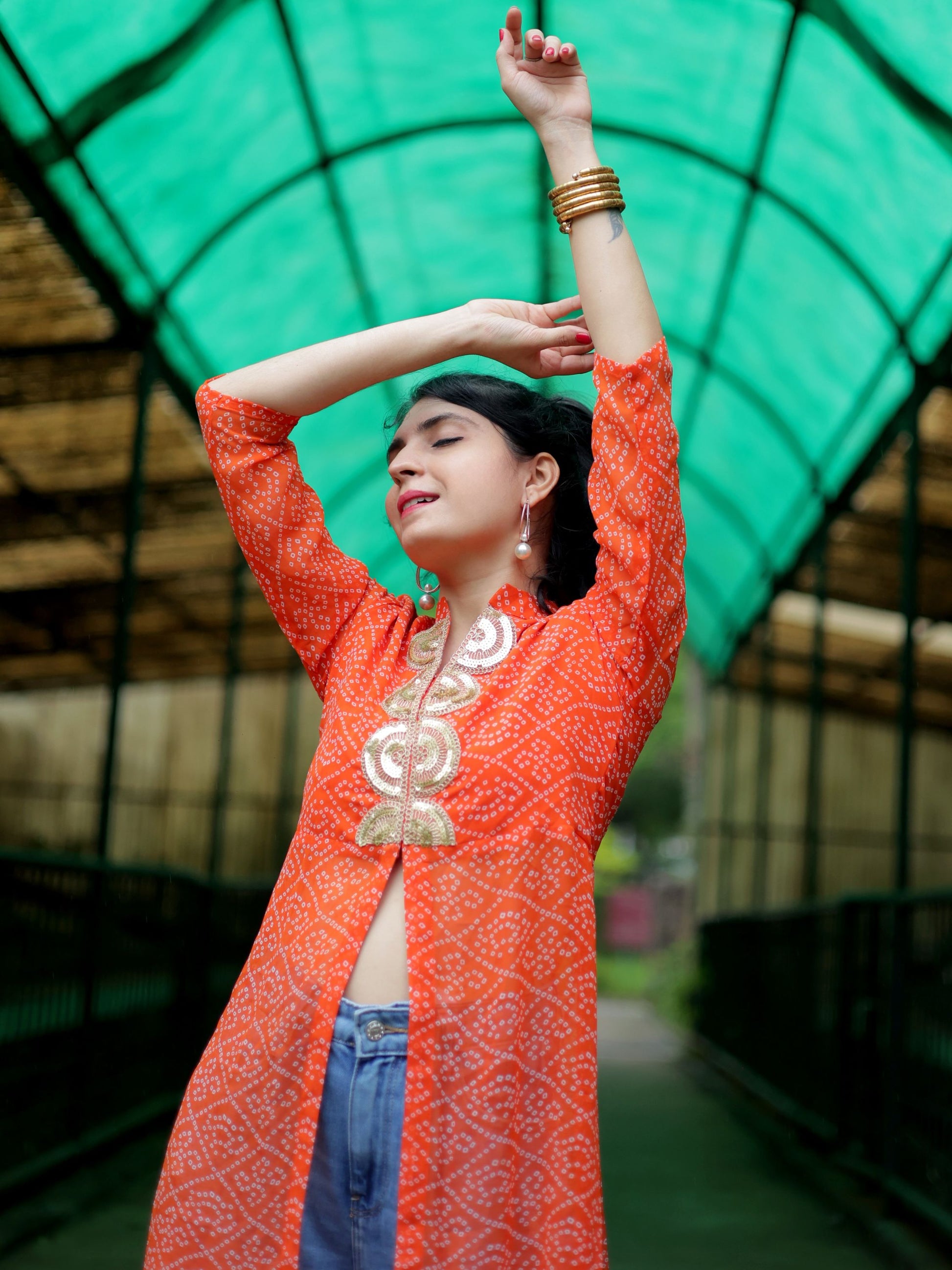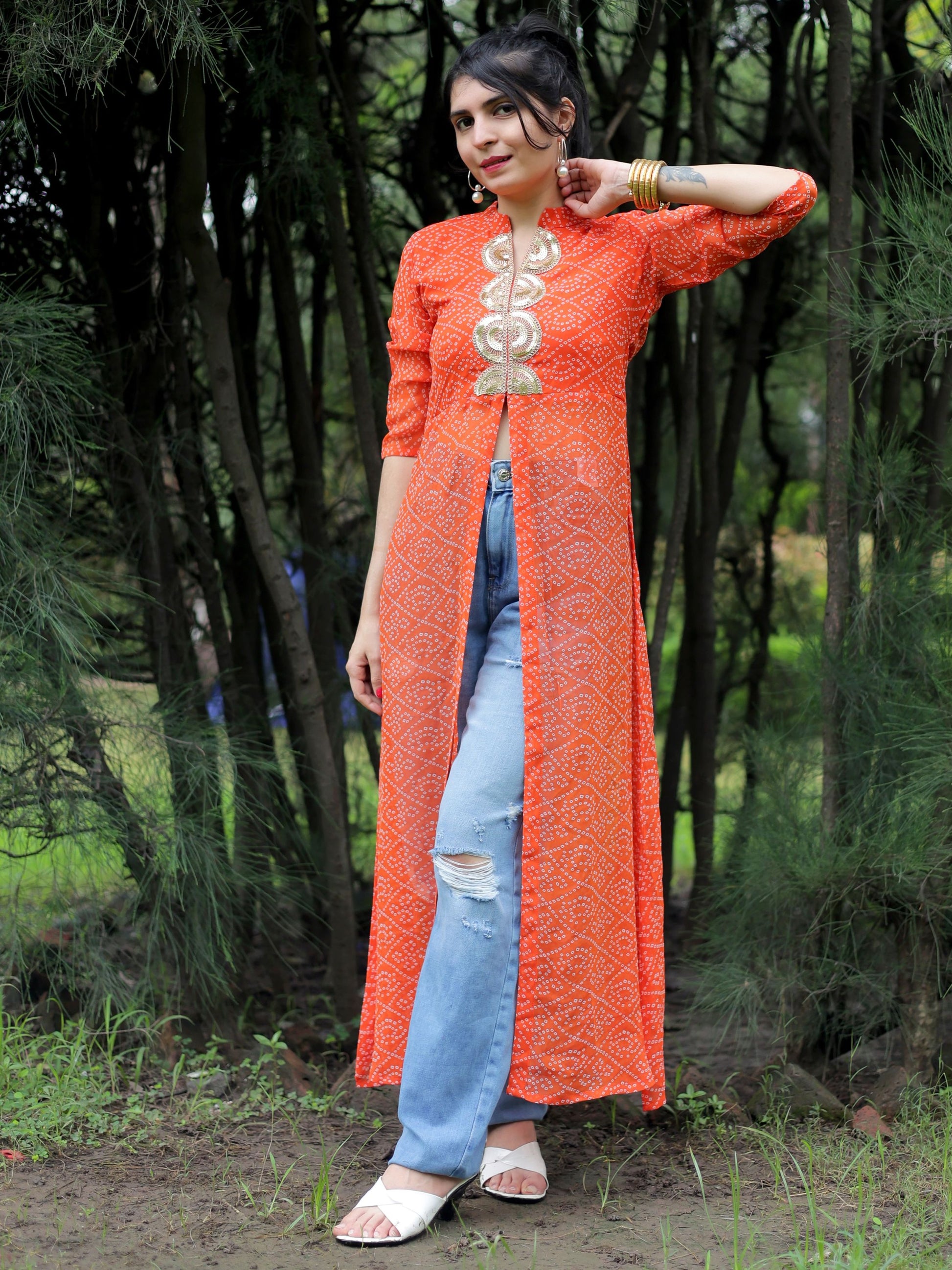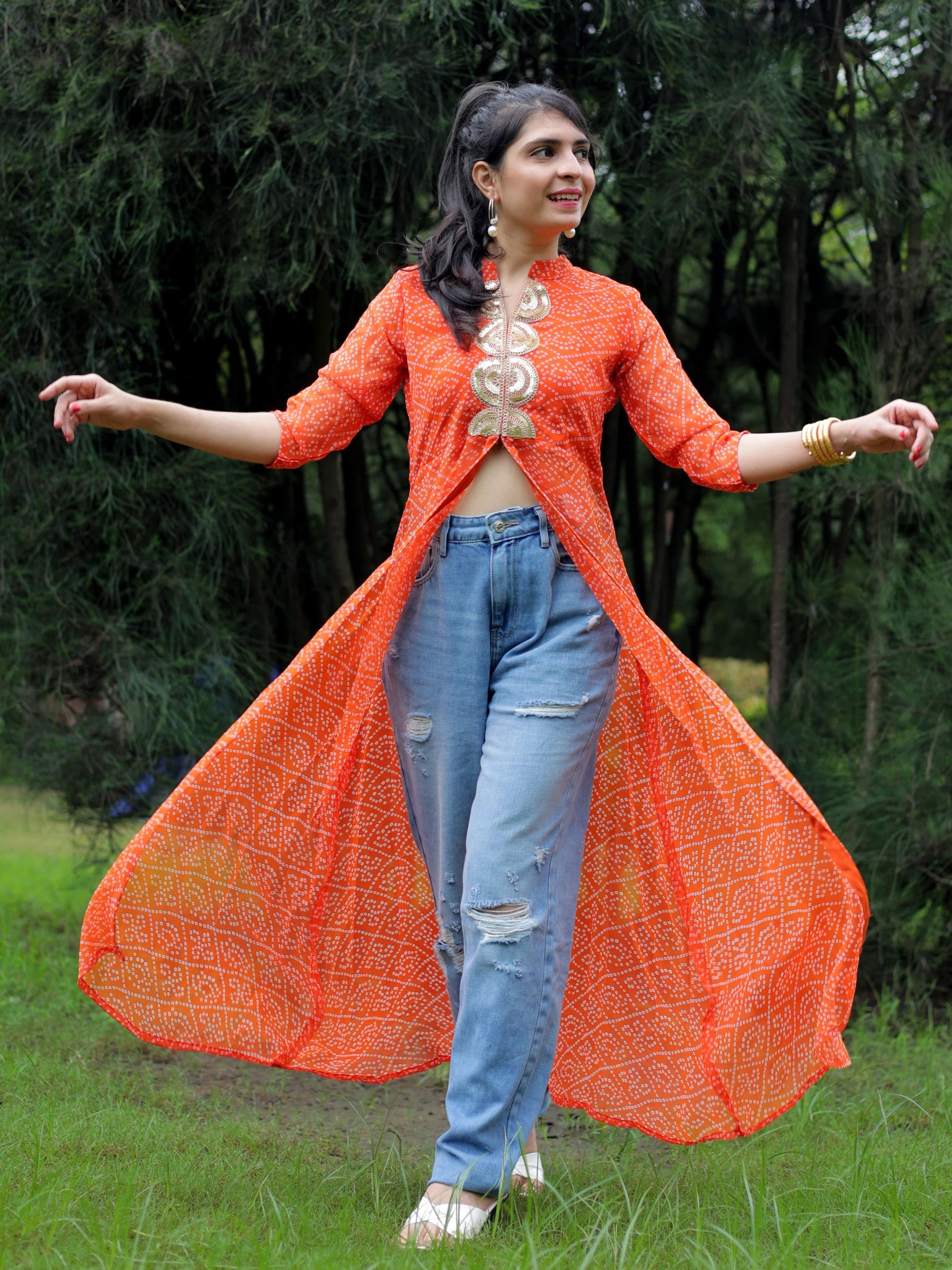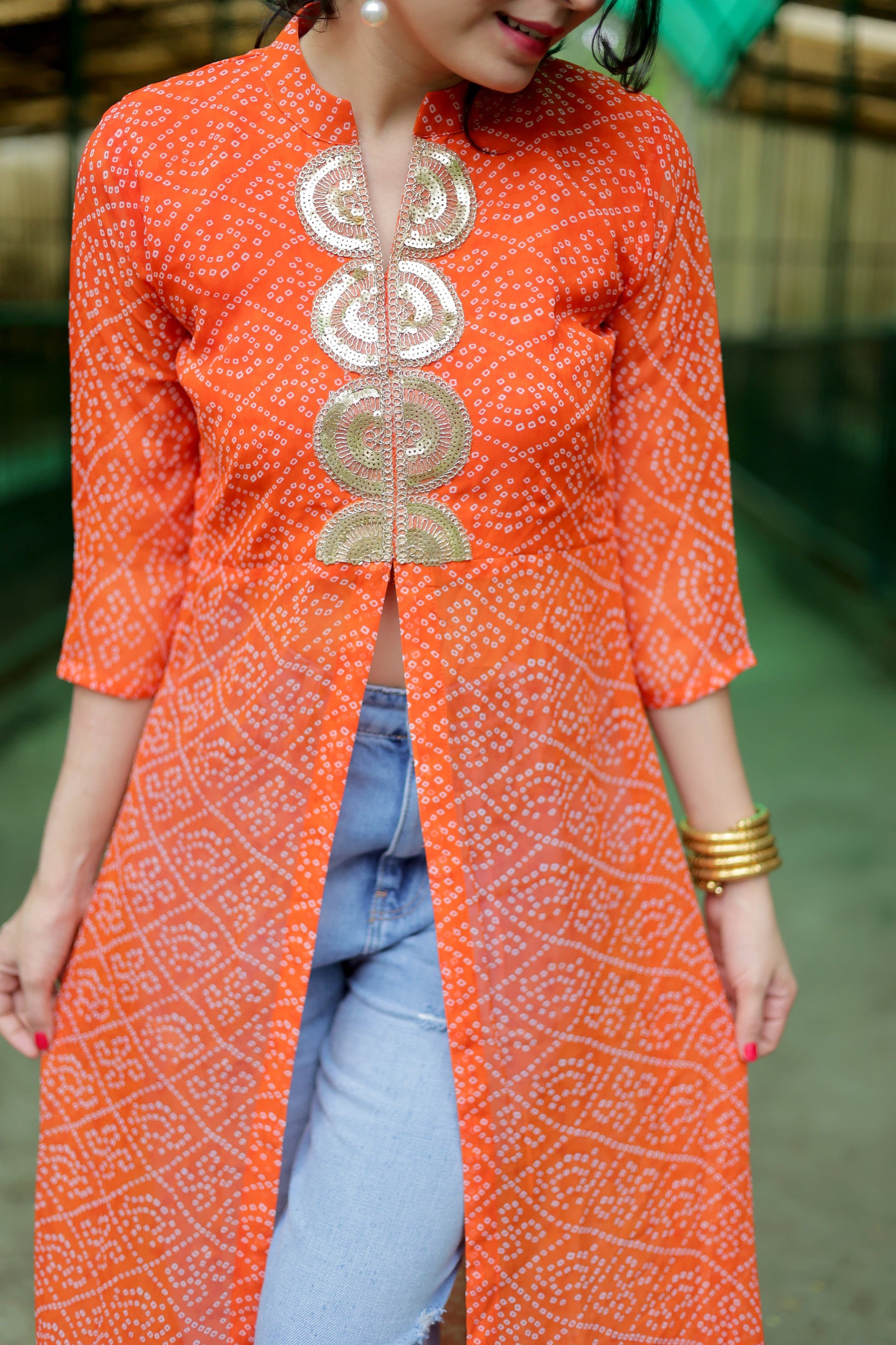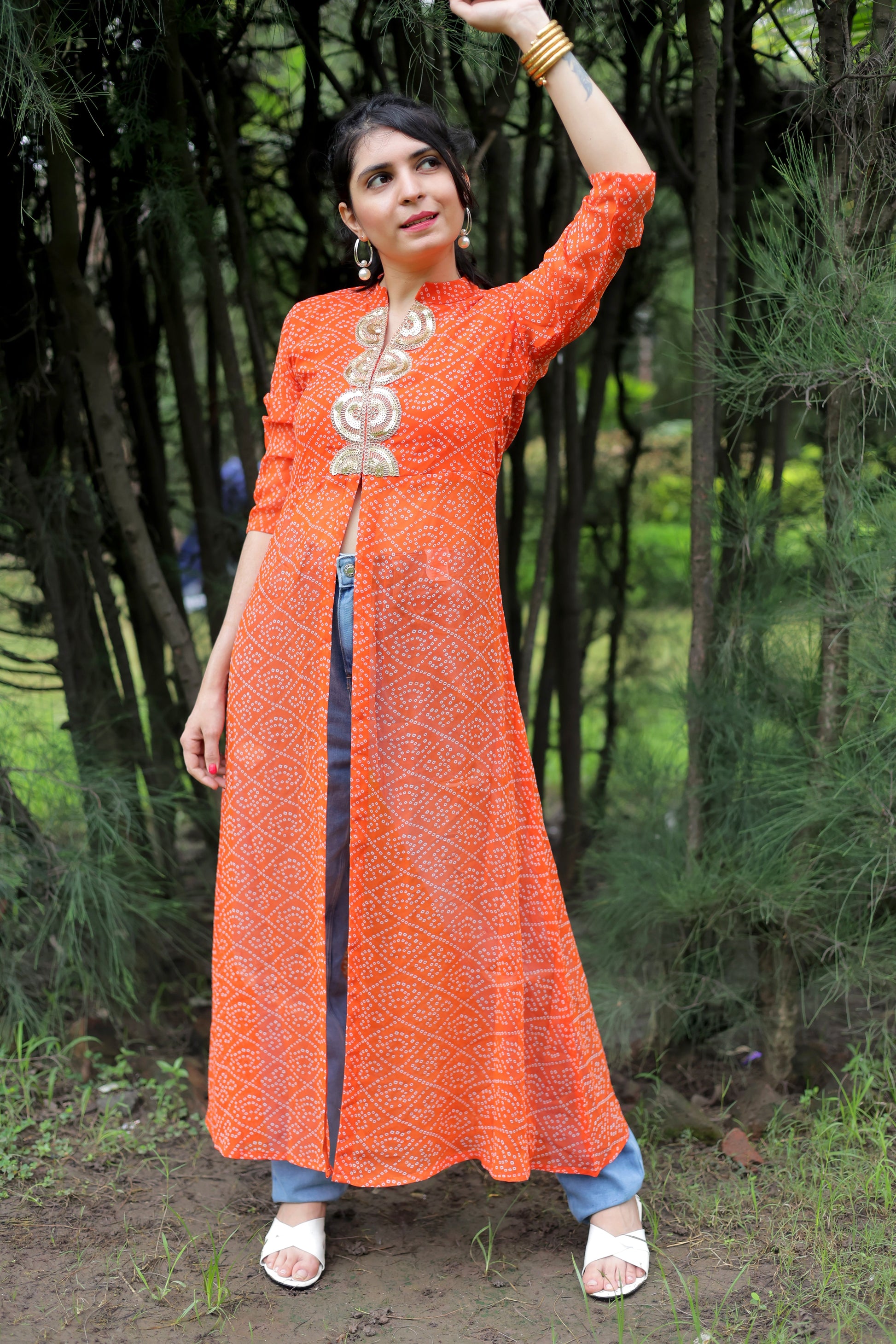 This Beautiful front Slit Kurta Made of Georgette material And Bandhani Type With V-Neck .This Kurti is blased on Festive wear this kurti and look pretty all festivals party and special ocassion.