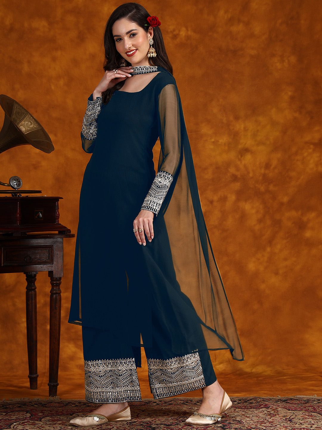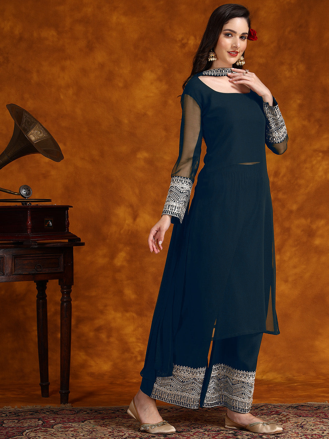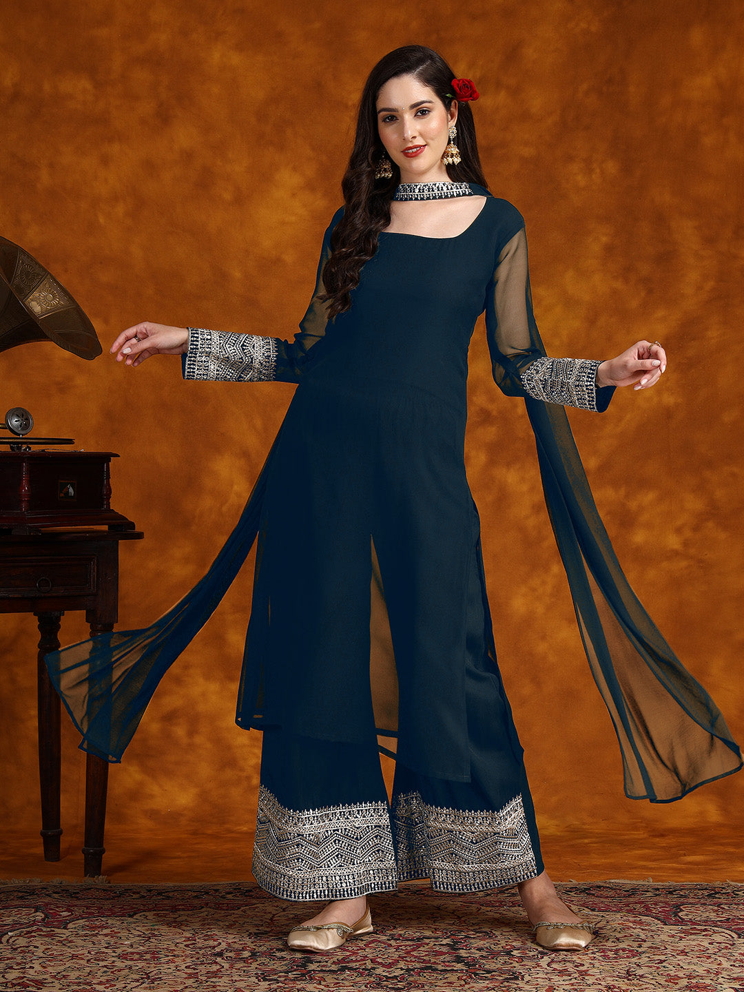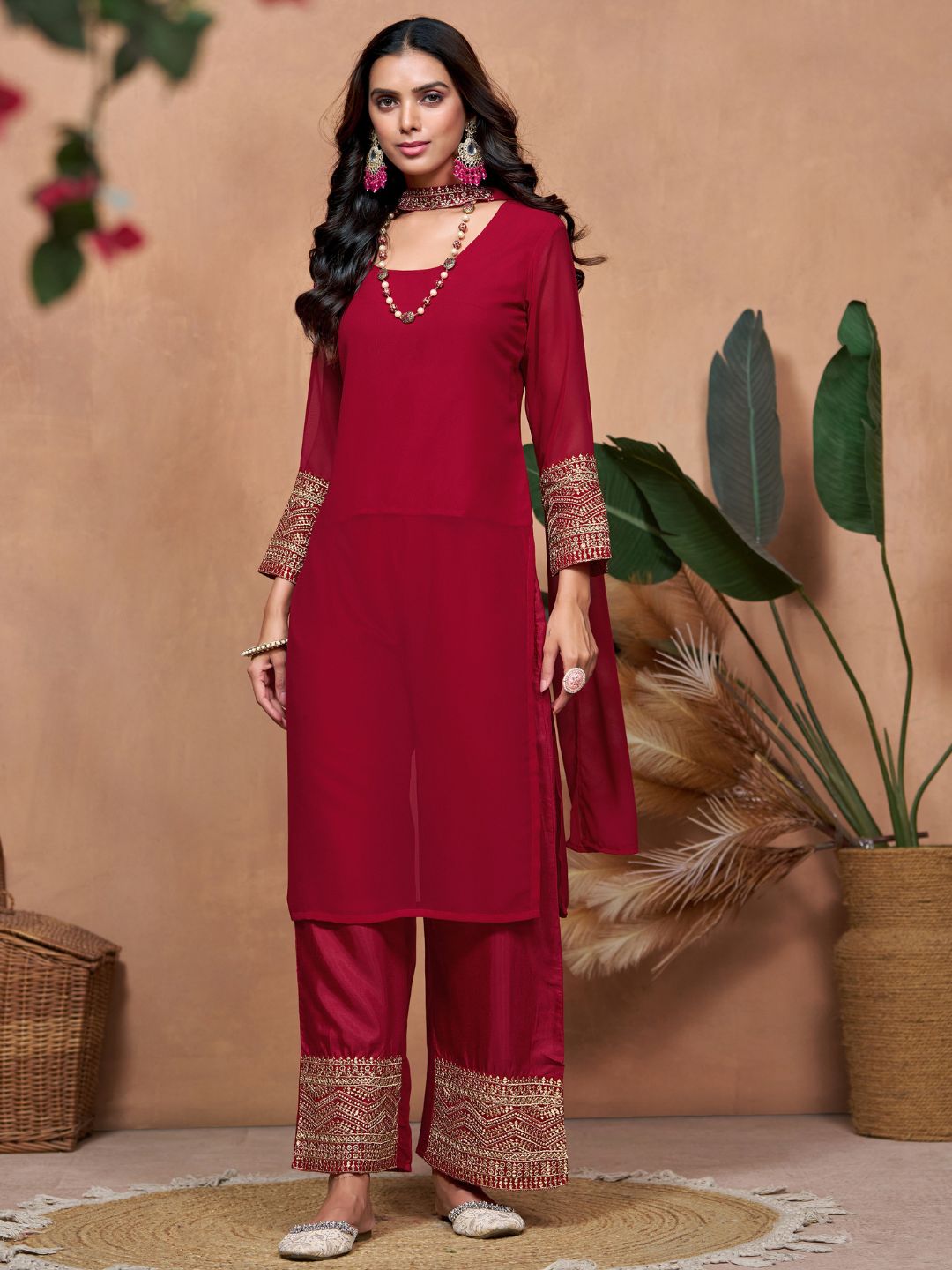 This Straight Kurta, made of Georgette material with Zari Lace Work and a Square Neck, is a perfect Indo Western Dress for women. This Straight Kurta, Palazzo, and Neckless Dupatta Set is designed for festive wear, making it an ideal choice to look pretty on all festivals, parties, and special occasions.