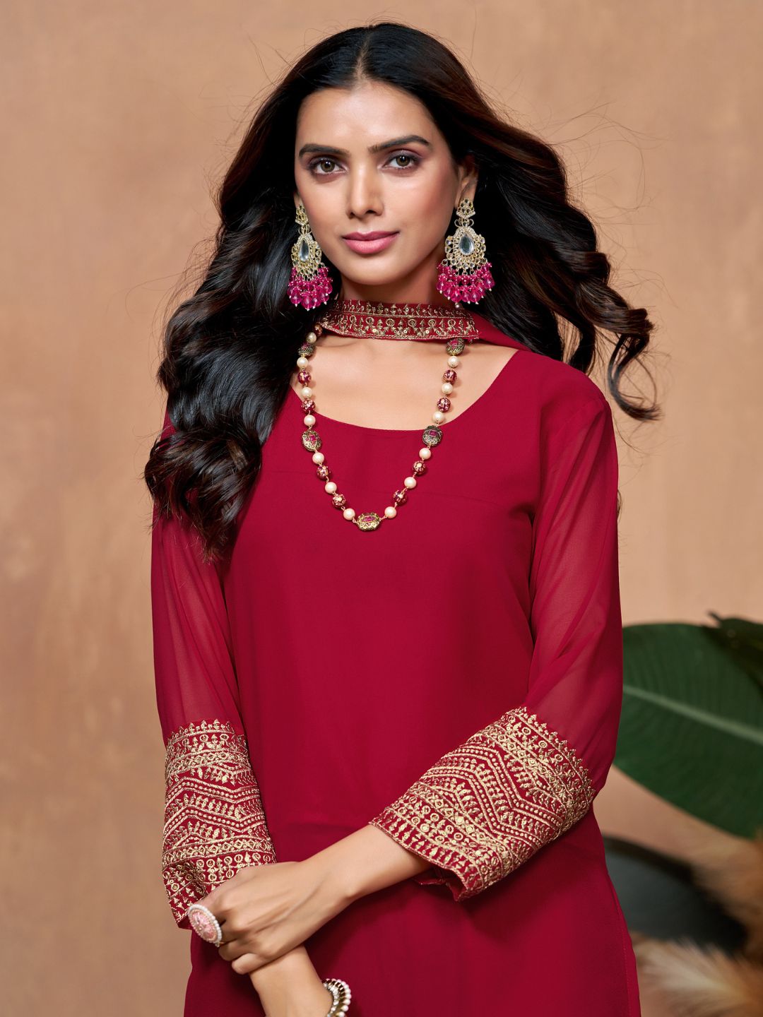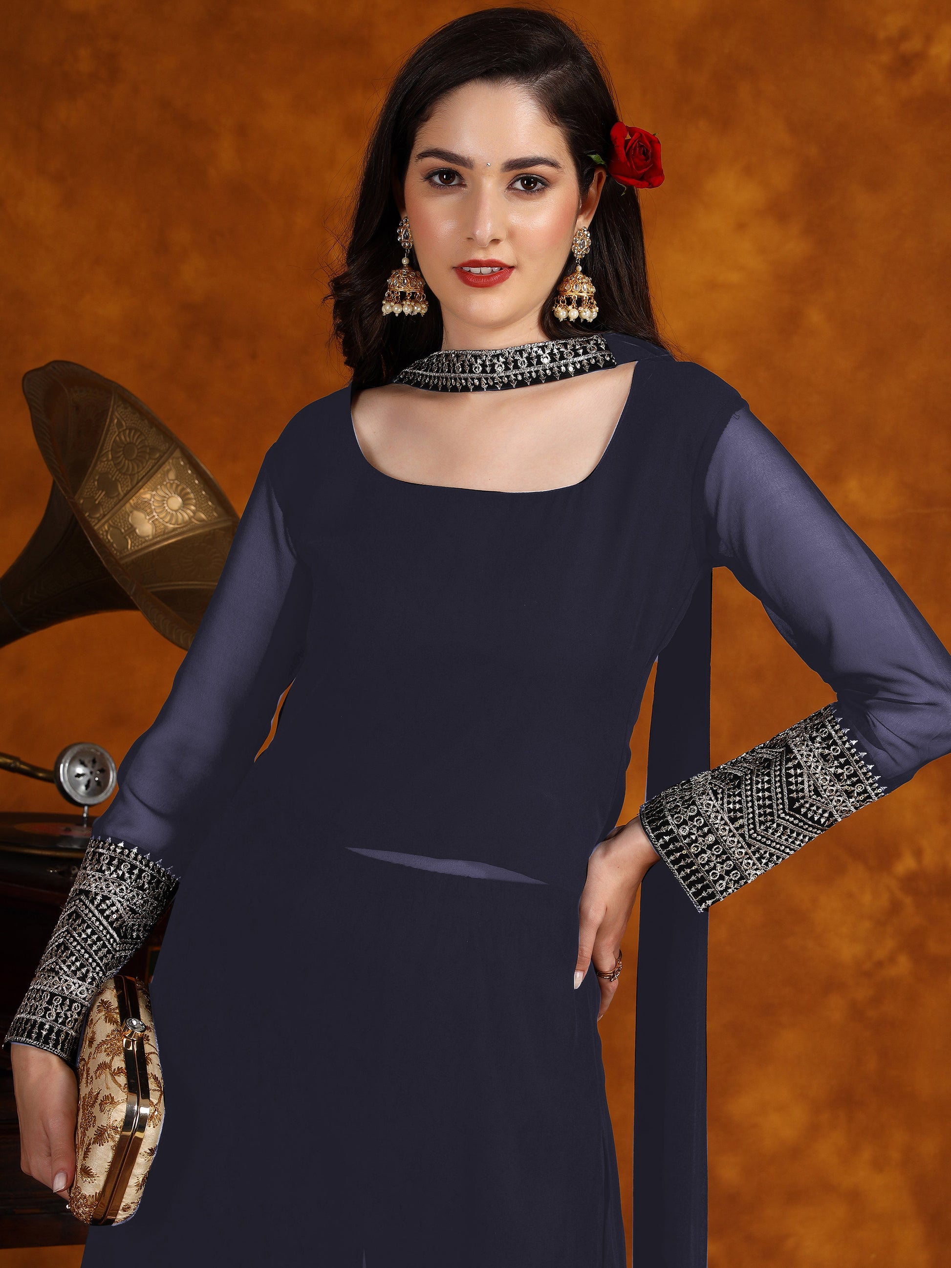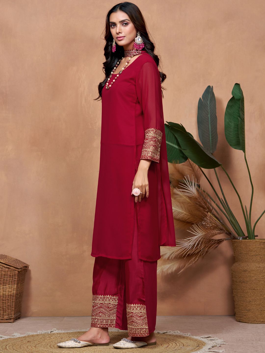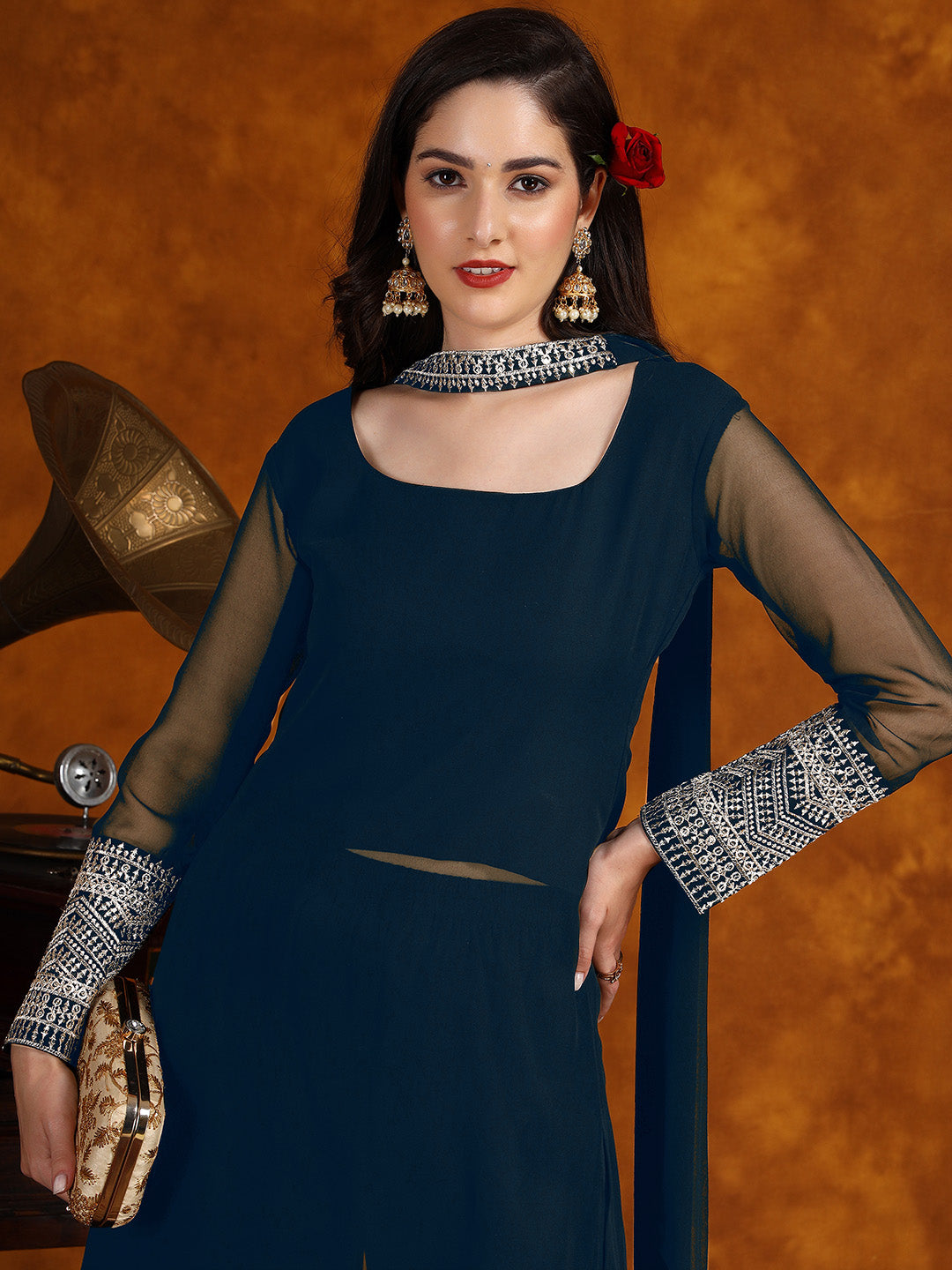 This Straight Kurta, made of Georgette material with Zari Lace Work and a Square Neck, is a perfect Indo Western Dress for women. This Straight Kurta, Palazzo, and Neckless Dupatta Set is designed for festive wear, making it an ideal choice to look pretty on all festivals, parties, and special occasions.