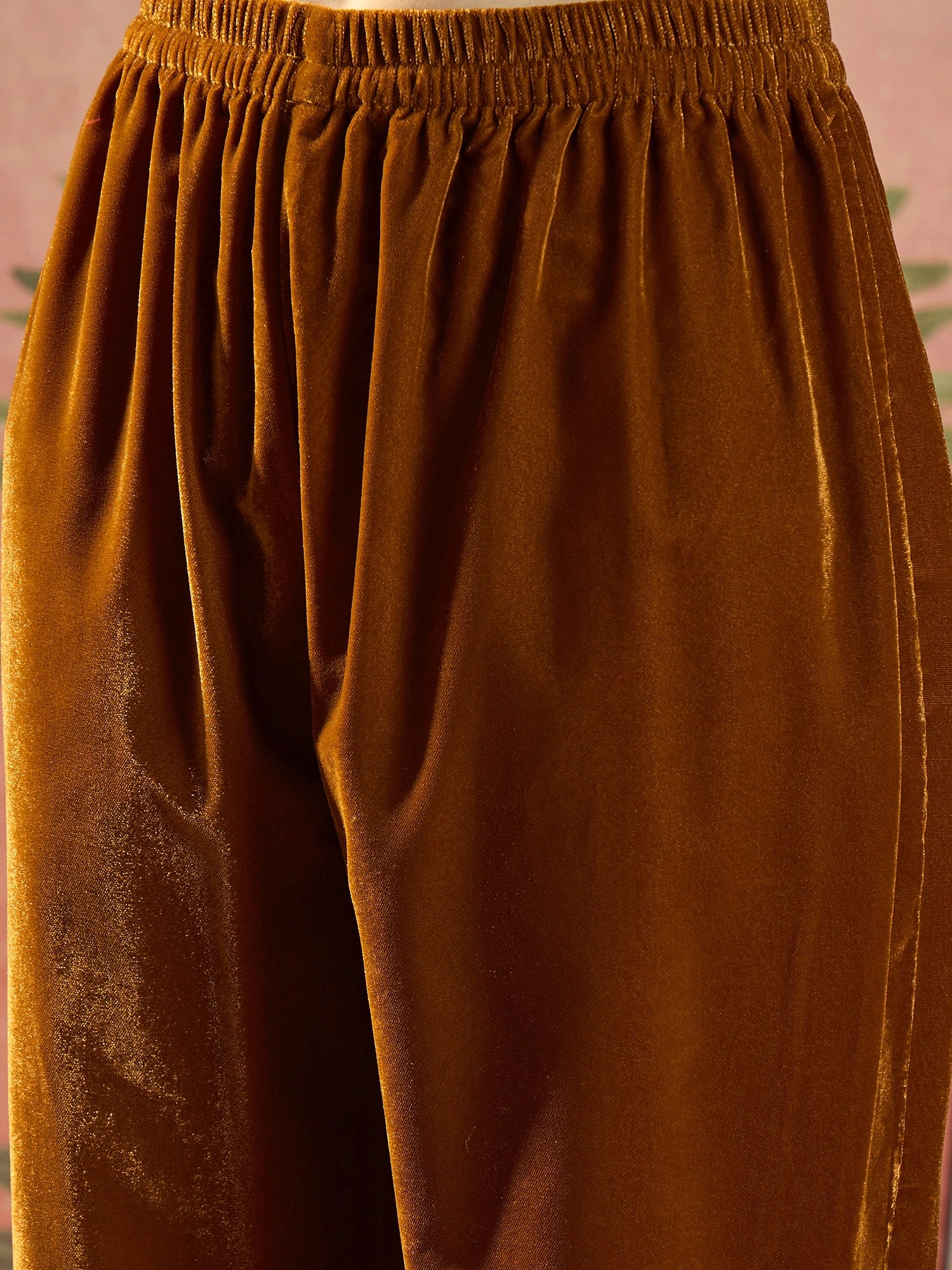 Gold Velvet Embroidery Straight Kurta Pant With Dupatta Set