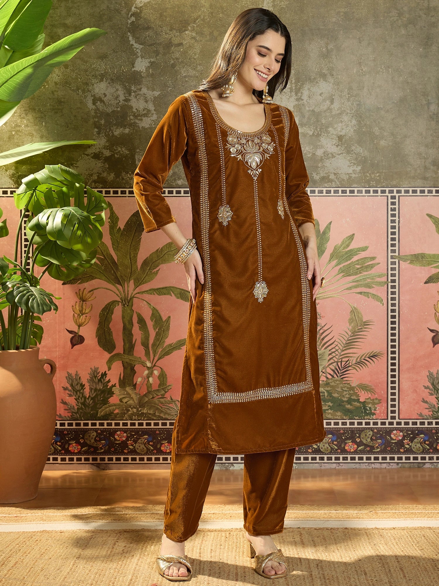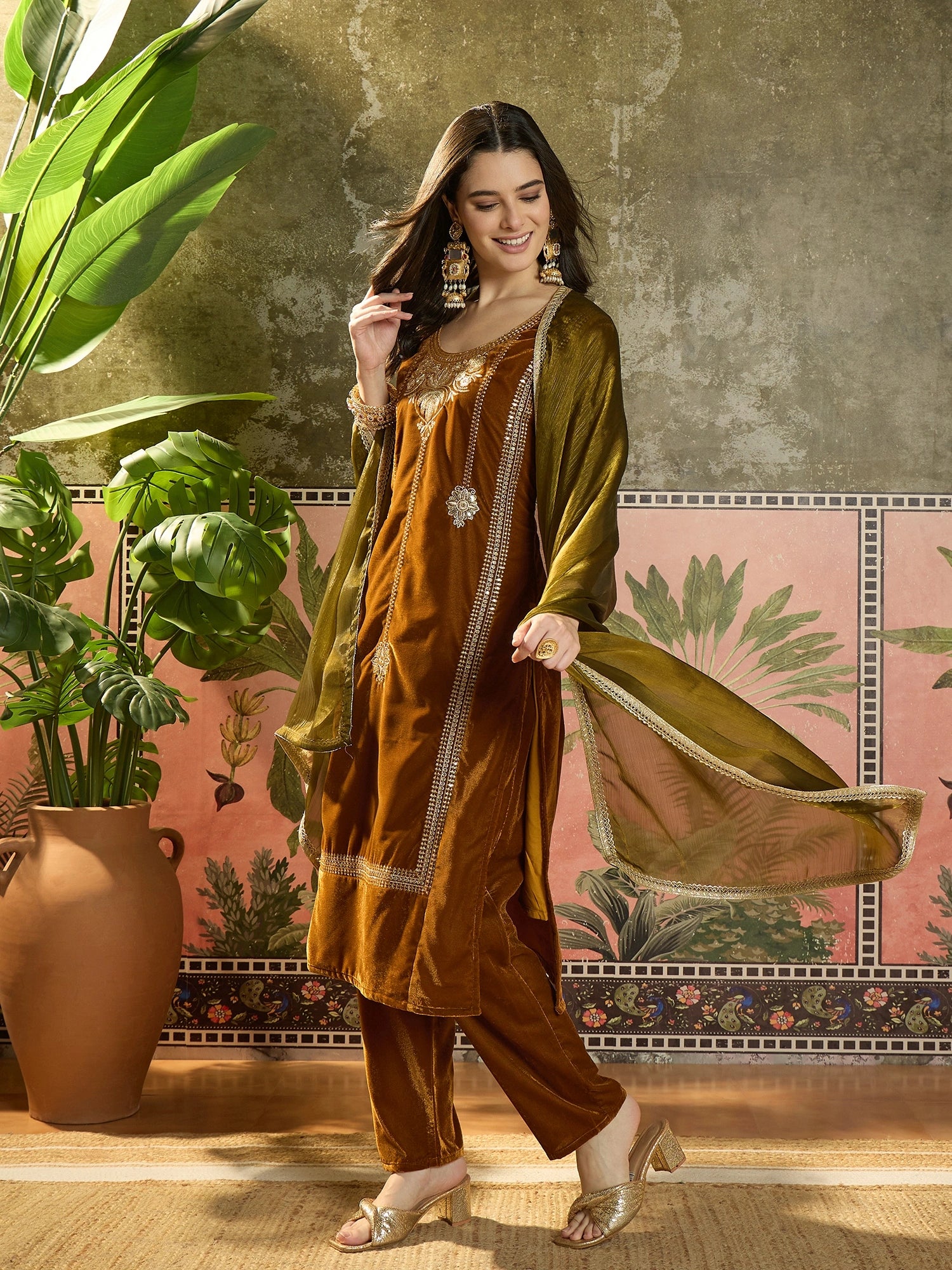 Stay elegant and cozy this season with this stunning Gold velvet kurta set. The straight-fit kurta features intricate embroidery work on the neckline and panel, adding a rich and festive touch. Paired with matching pants and a contrasting silk-finish dupatta, this outfit beautifully blends traditional charm with modern comfort. Perfect for winter occasions, festive celebrations, family functions, and party wear. Soft velvet fabric ensures warmth, while detailed embellishments create a luxurious look.
