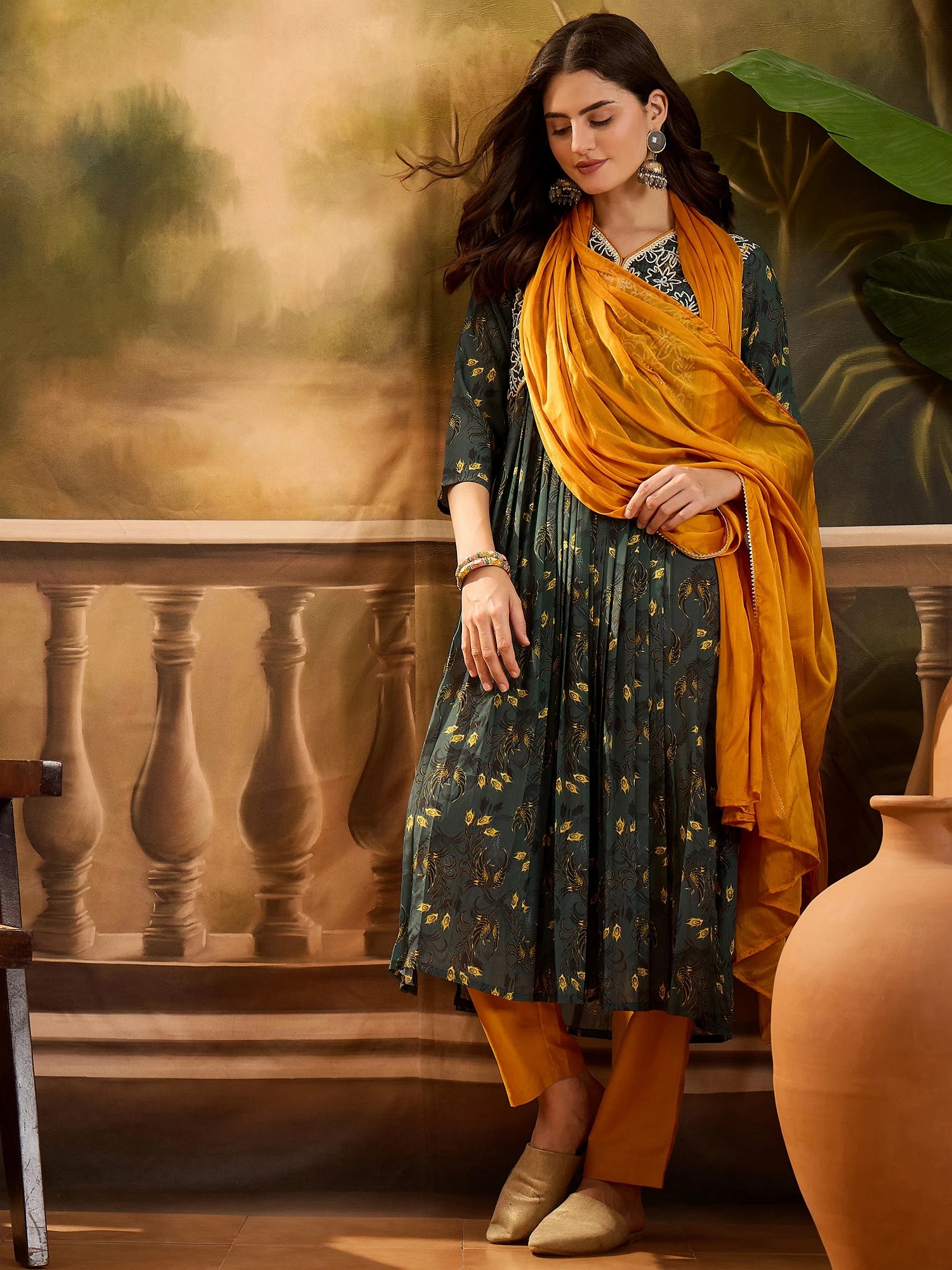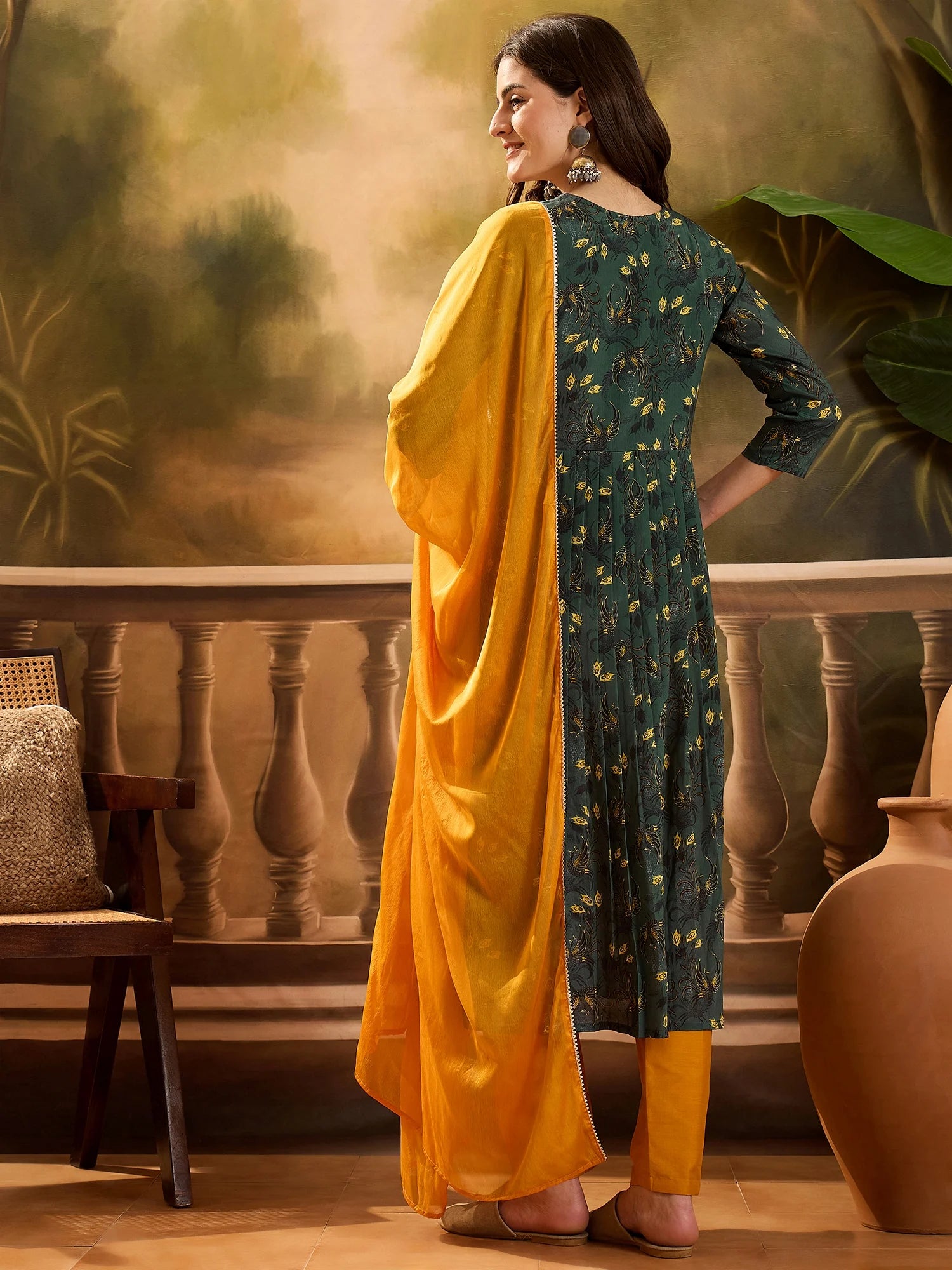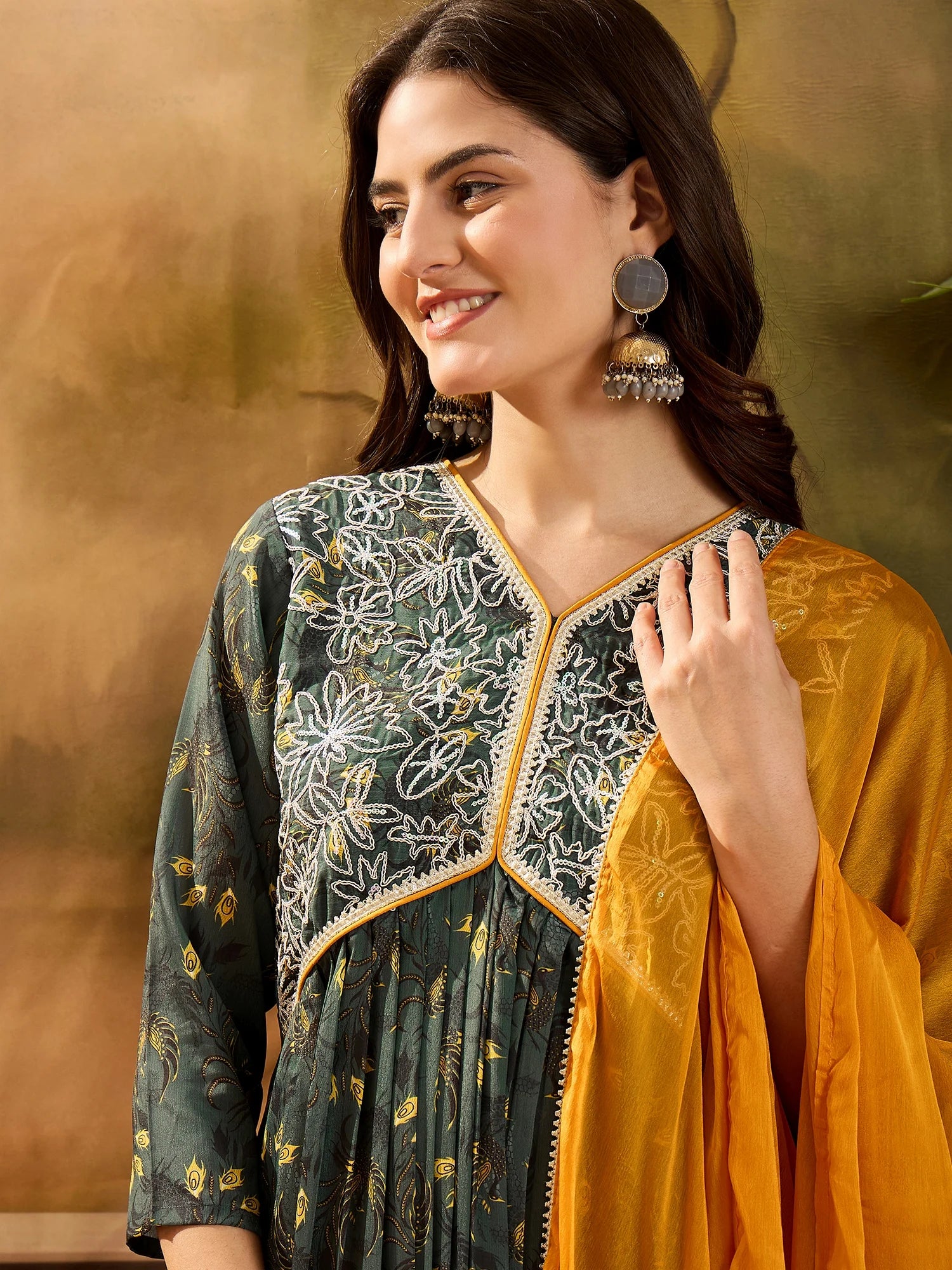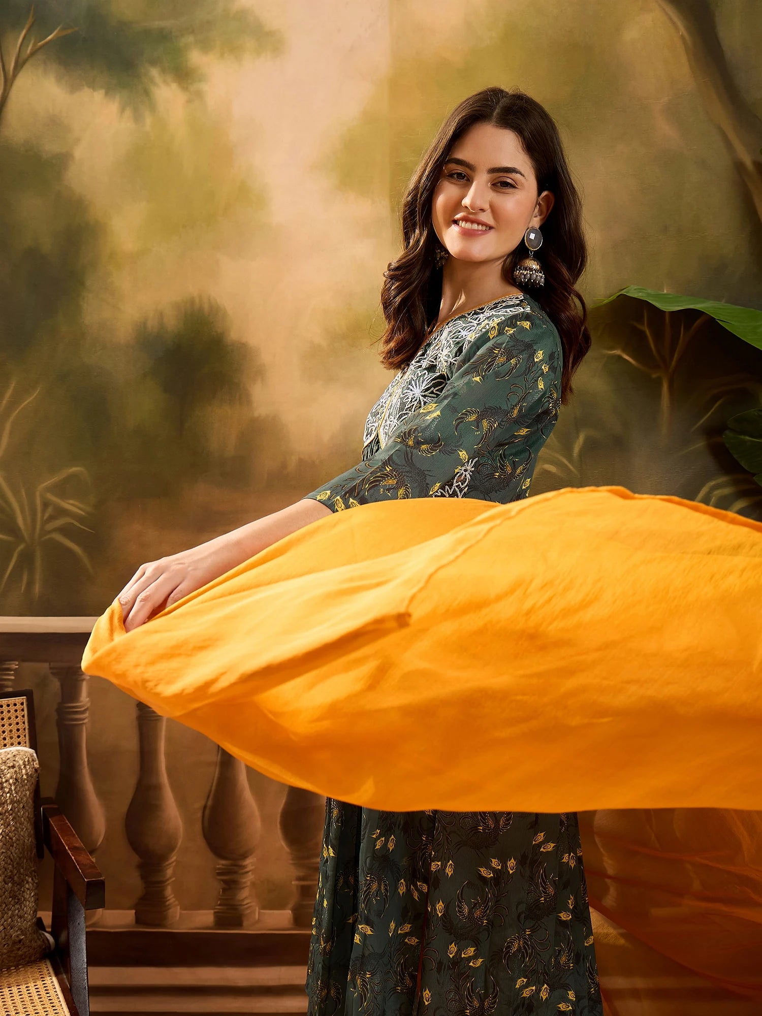 Green Chinon Floral Print and Yoke Embroidery Alia Cut Kurta Pant and Dupatta Set