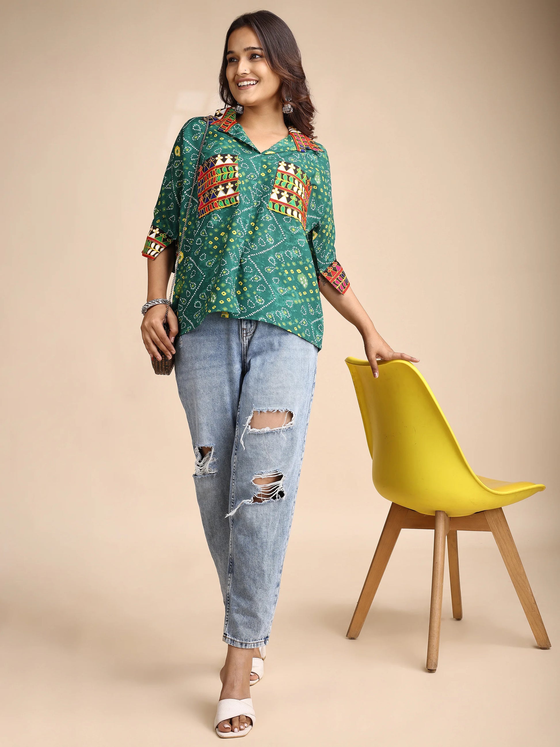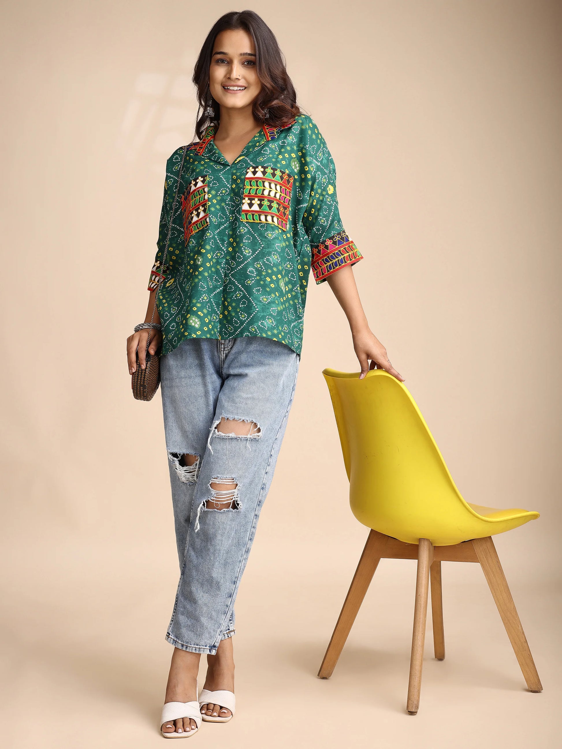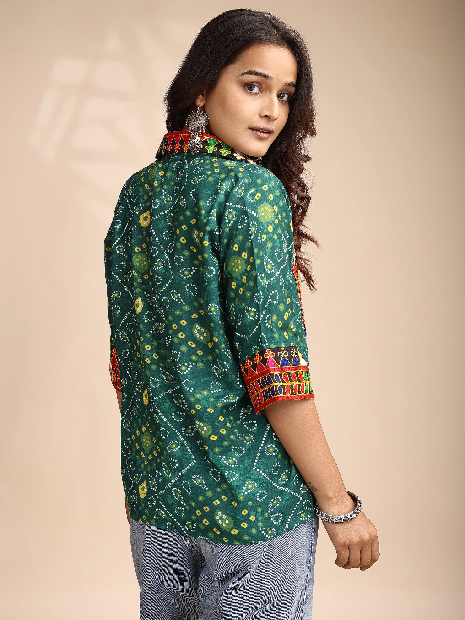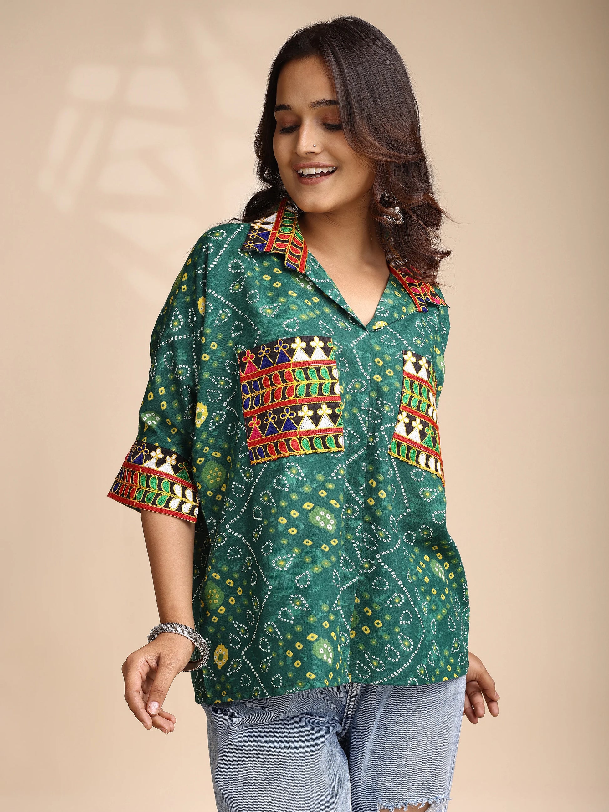 Green Cotton Blend Bandhani print and Embroidered Relex fit Pocket Boxy Shirt Style Top