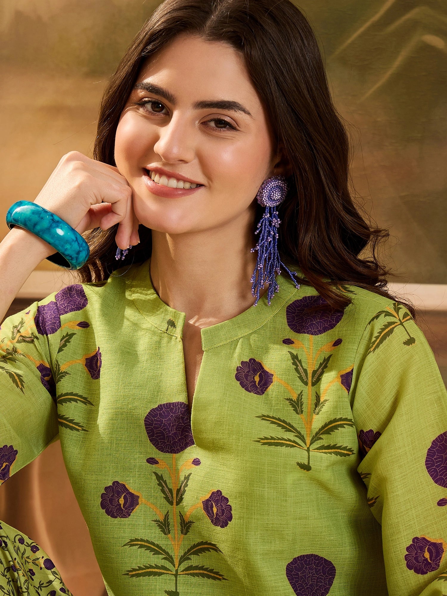 Green Linen Floral Print Summer Wear Straight Short Kurti With Afghani Pant Set