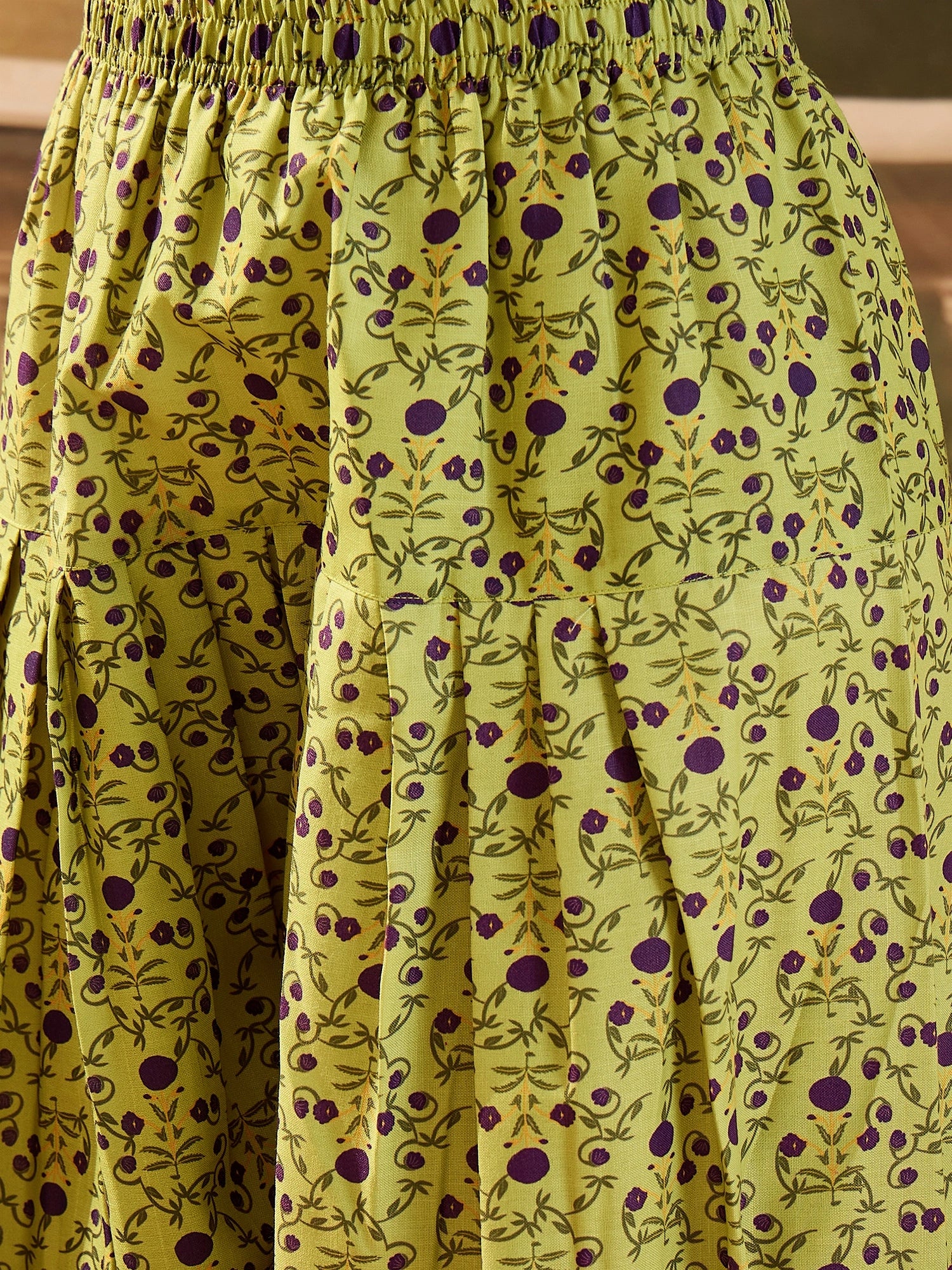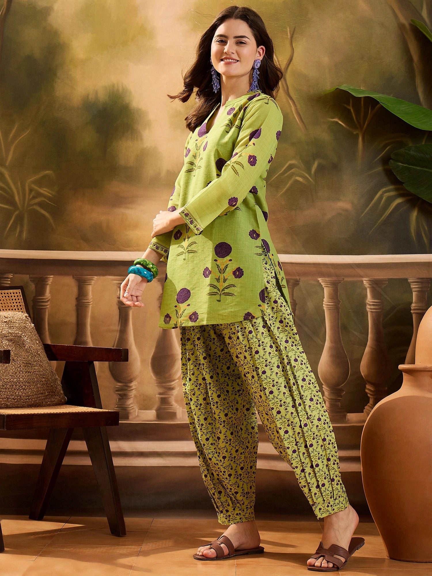 Refresh your wardrobe with this Digital Floral Print Green Co-ords, featuring a Three-Quarter Bell Sleeves Kurti with an Straight hem and matching wide-leg Afghani.The striking Green and purple floral print on a deep Multicolor Prints adds a bold touch, perfect for casual outings or semi-formal occasions. Made from lightweight fabric, this floral co-ord set offers all-day comfort while keeping you stylish and trendy. Ideal for those who want a blend of modern ethnic fashion and comfort.