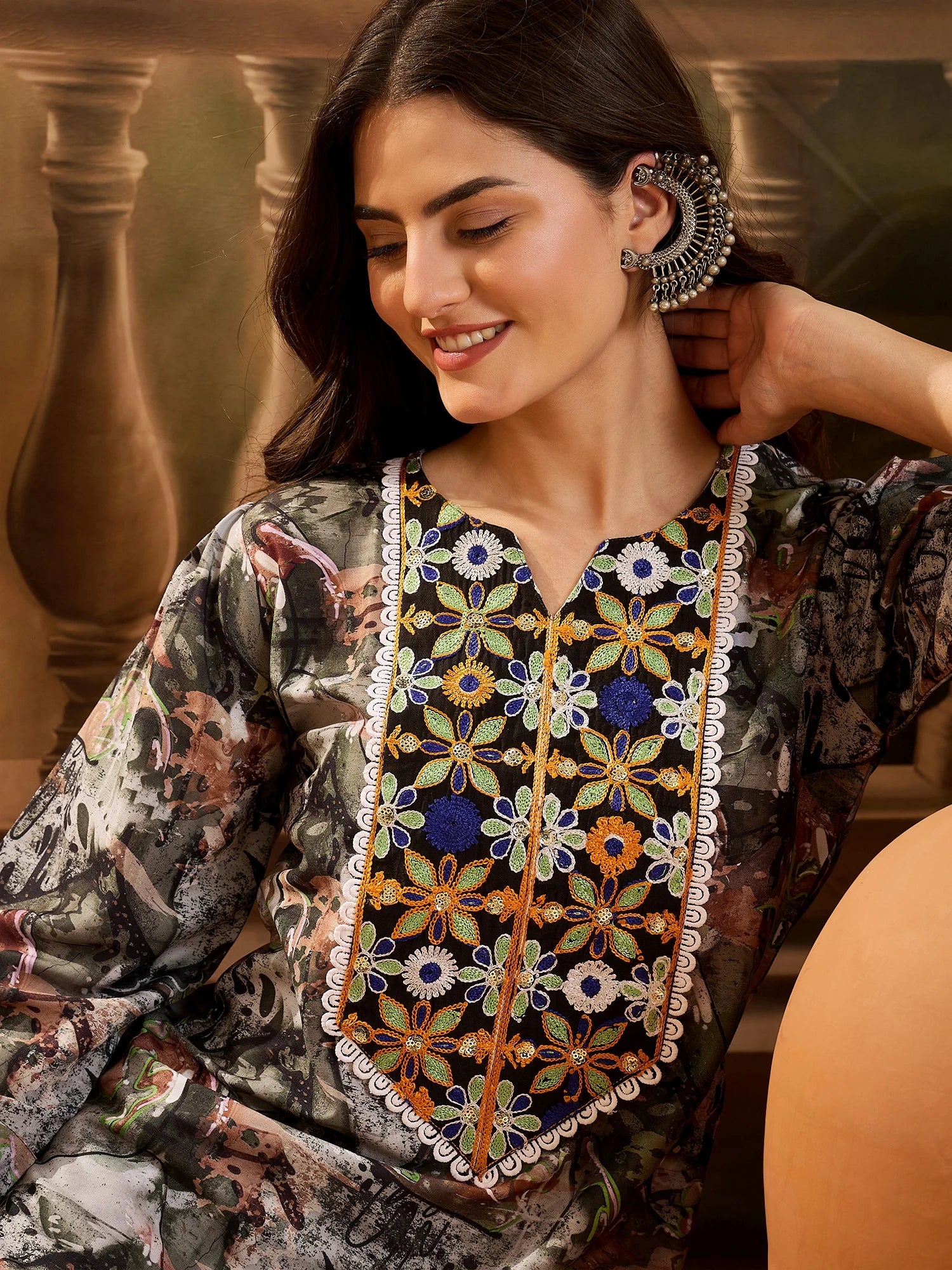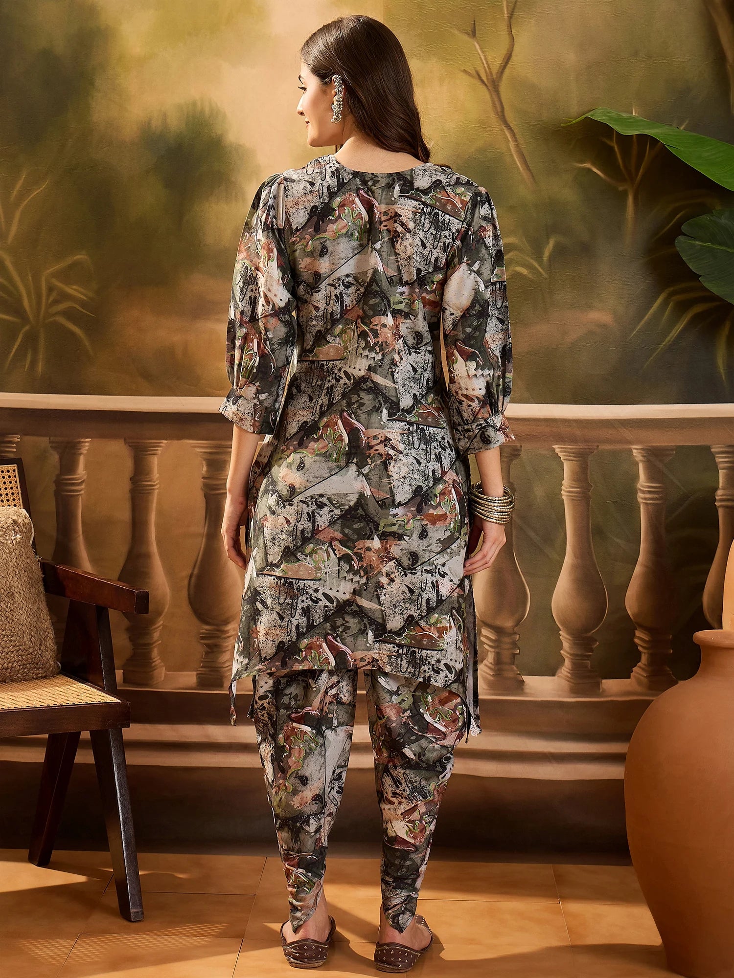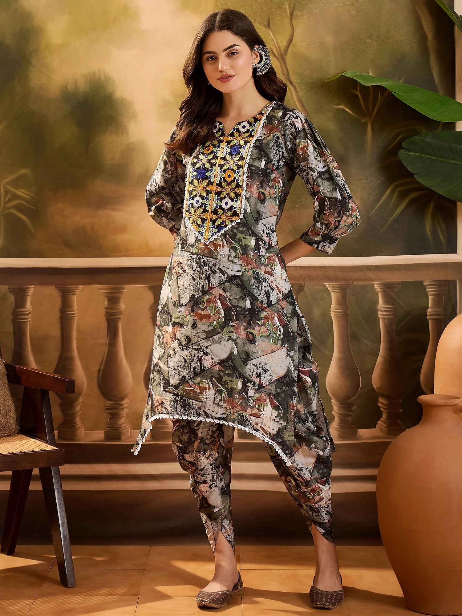 Add a chic twist to your ethnic style with this Silk Blend Kurta Set featuring vibrant digital prints and intricate embroidery on the yoke. The kurta is designed in a trendy high-low C-cut hemline, offering a modern silhouette, paired perfectly with a matching dhoti pant for a stylish fusion look. Made from soft and breathable fabric, this set ensures comfort without compromising on elegance. Ideal for festive occasions, casual gatherings, and party wear styling.