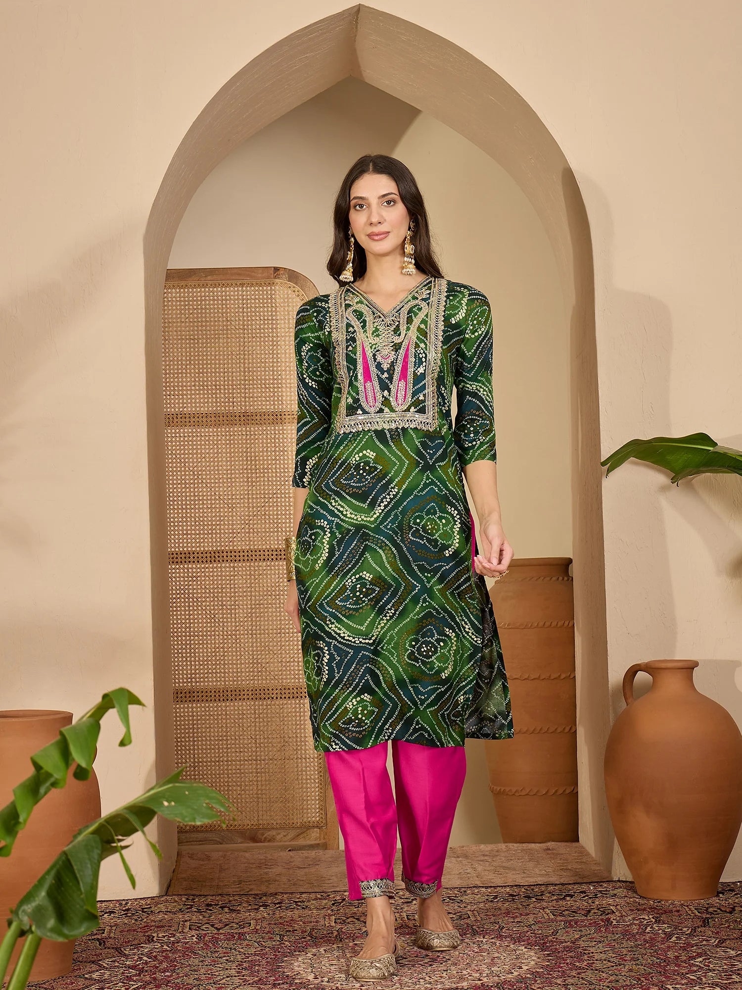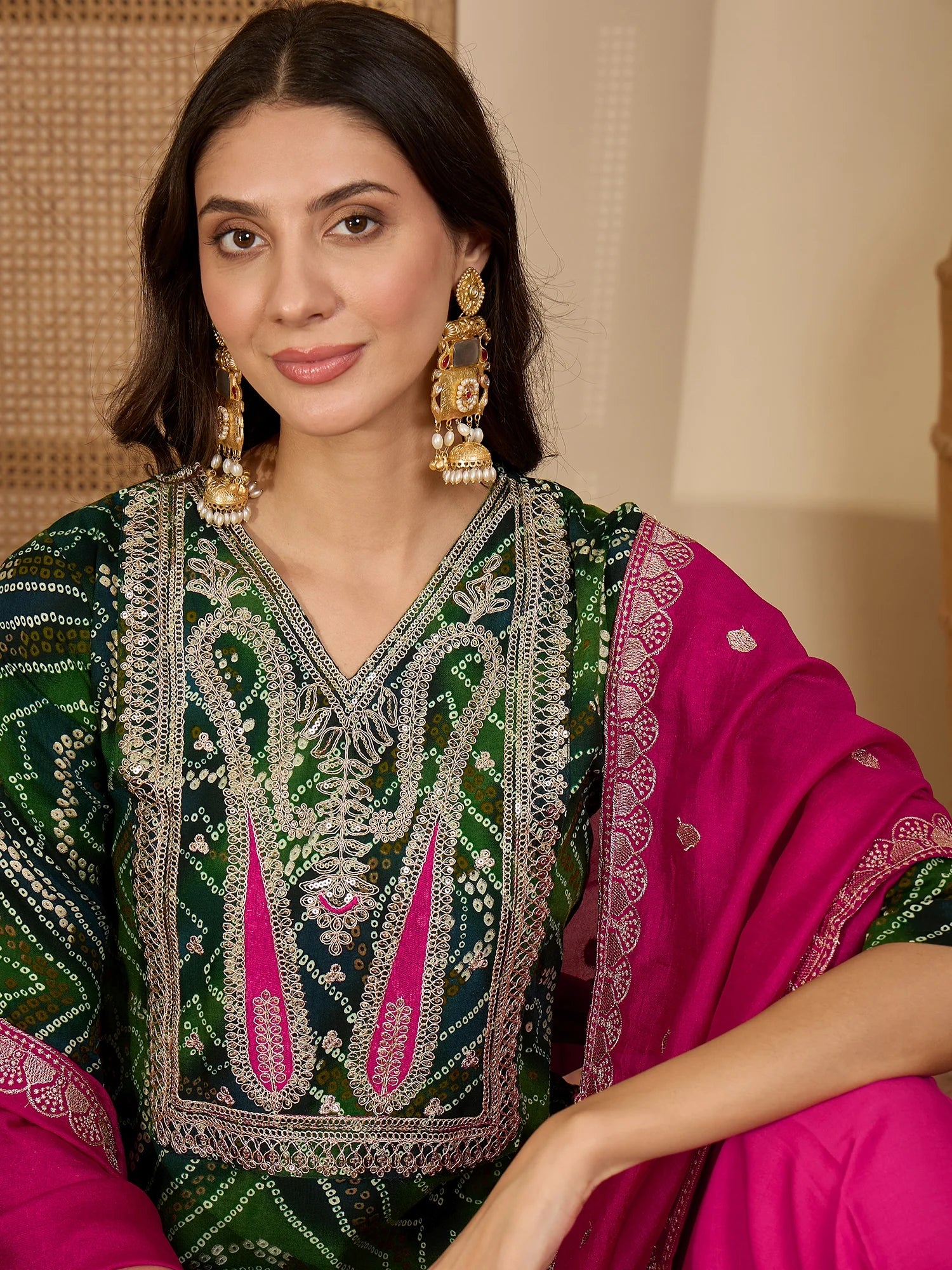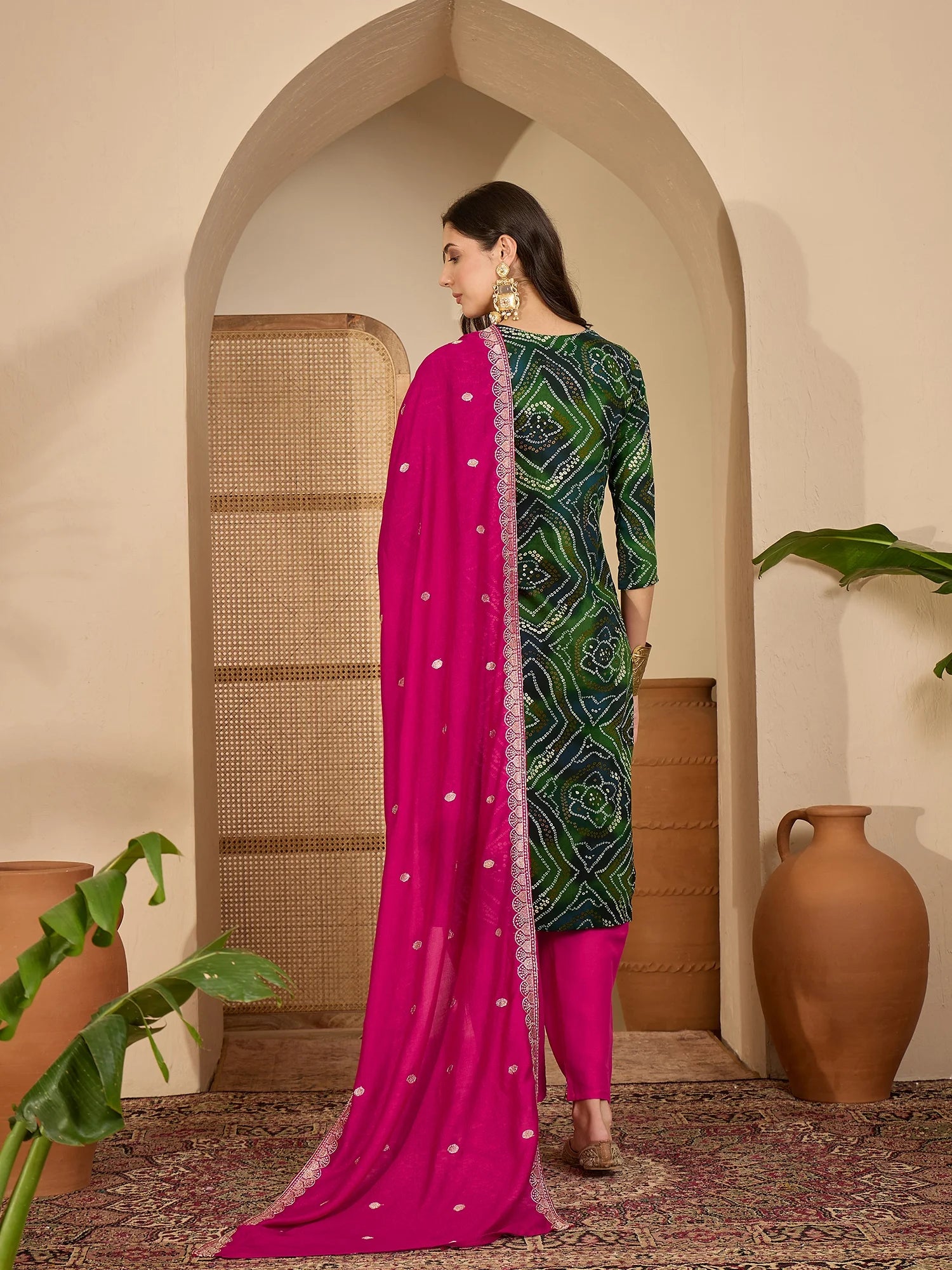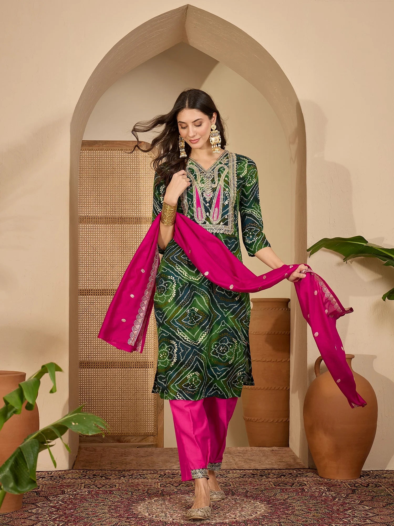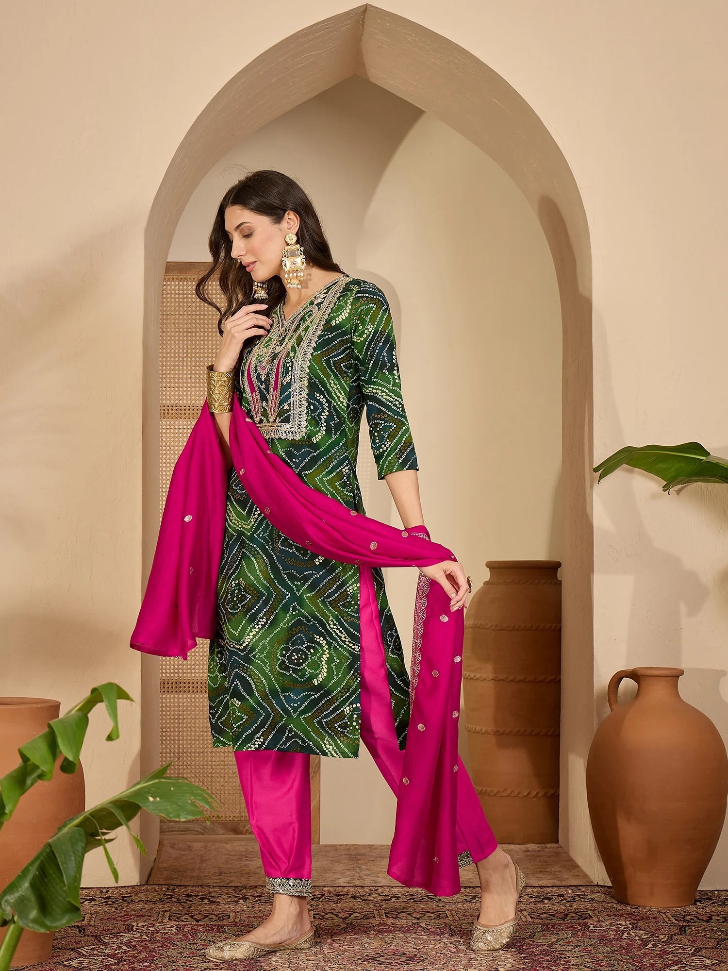 Green Rayon Bandhani Print and Embroidered Kurta Salwar and Dupatta Set