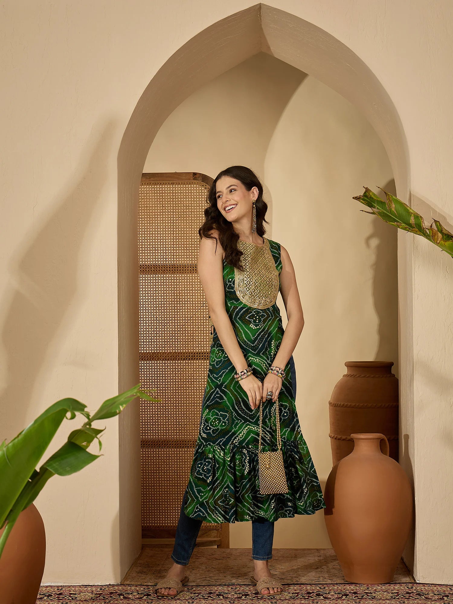 Green Rayon Bandhani Print & Yoke Embroidery Sleeveless Kurta