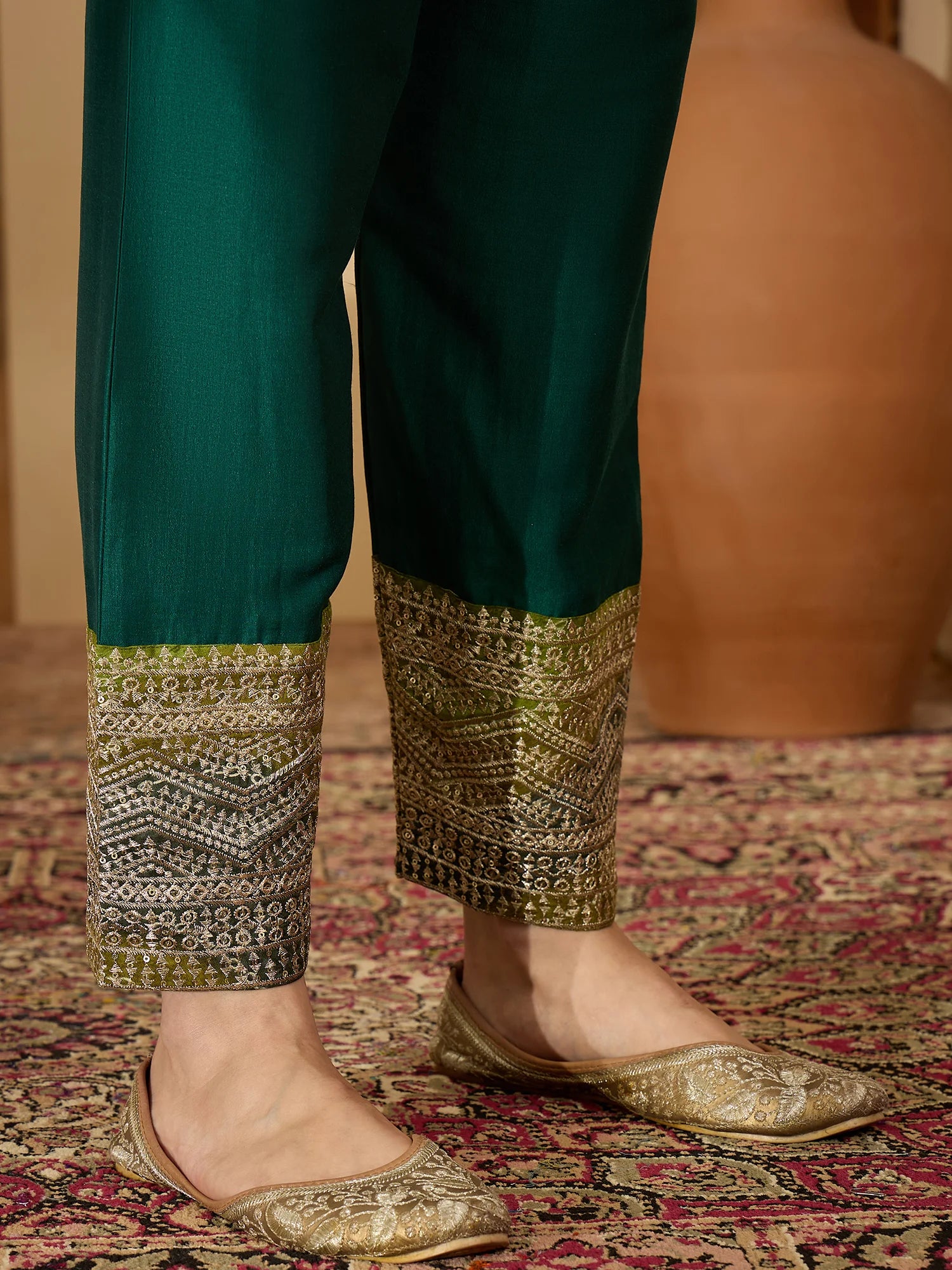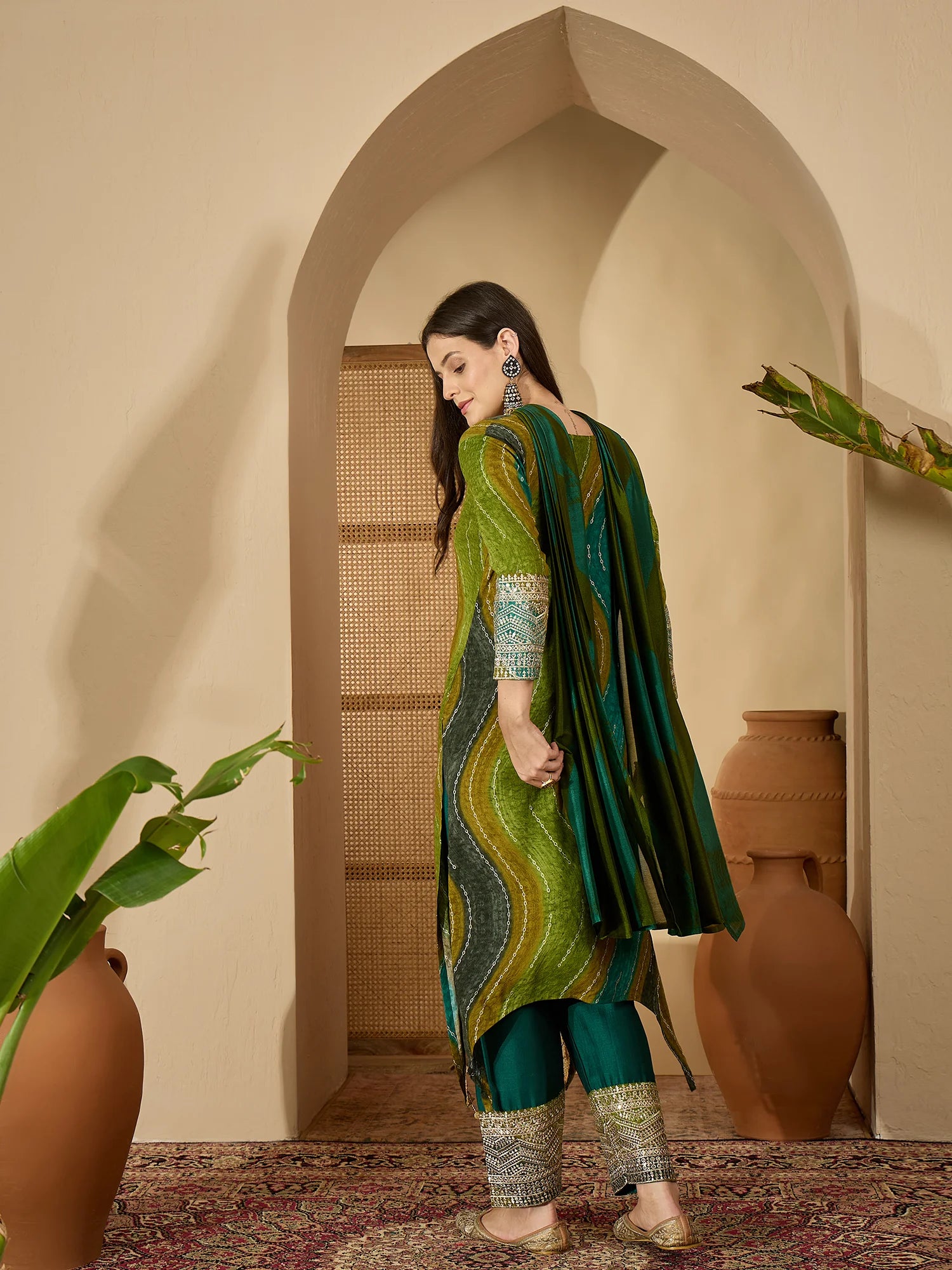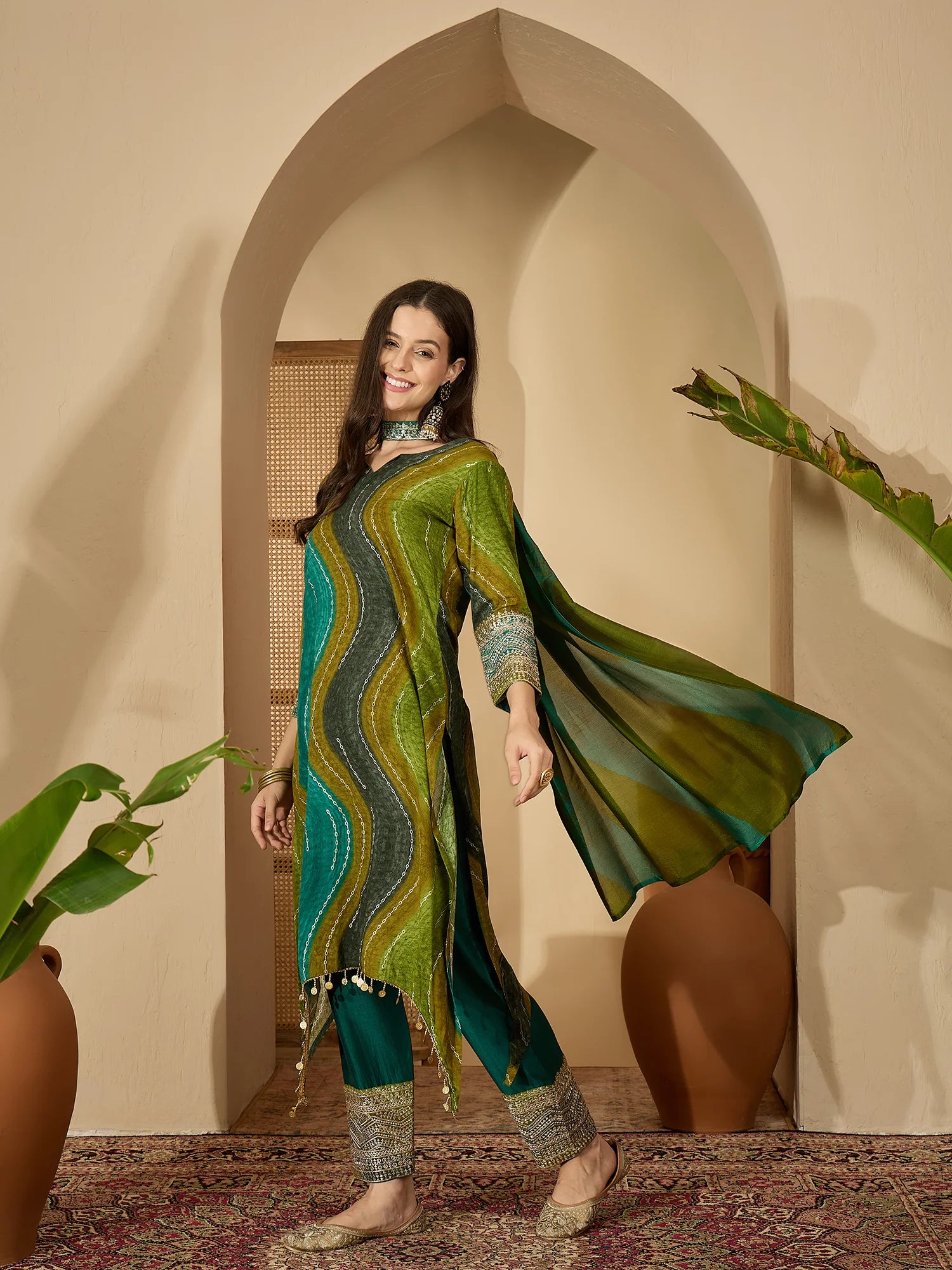 This Green designer kurta set features wavy Leheriya prints and delicate embellishments for a stylish festive look. The long kurta is paired with contrast pants, making it a perfect salwar suit for weddings, parties, and cultural celebrations. Crafted in soft fabric with intricate detailing, this Indian ethnic wear offers both comfort and elegance. A vibrant kurta set that adds charm to any festive wardrobe.