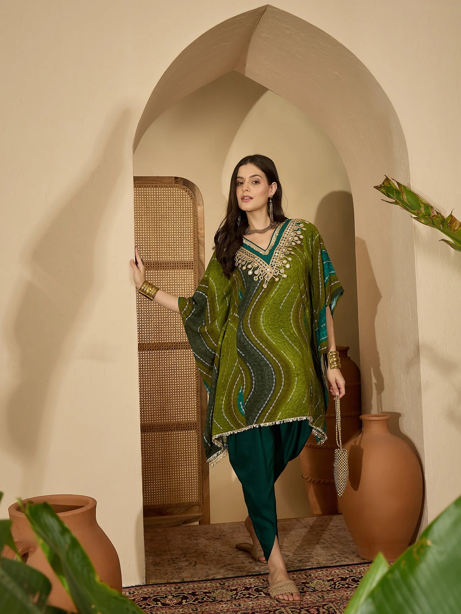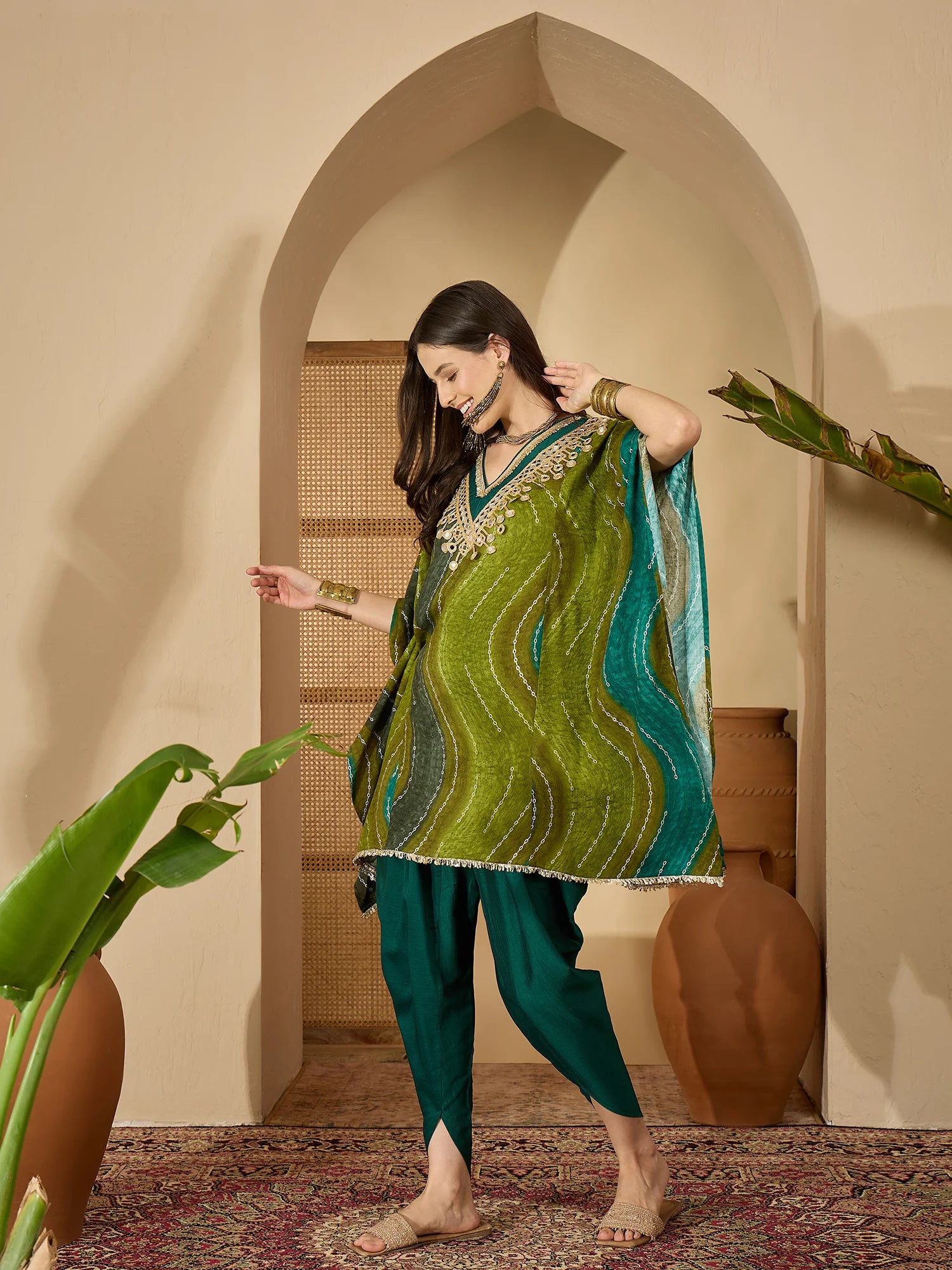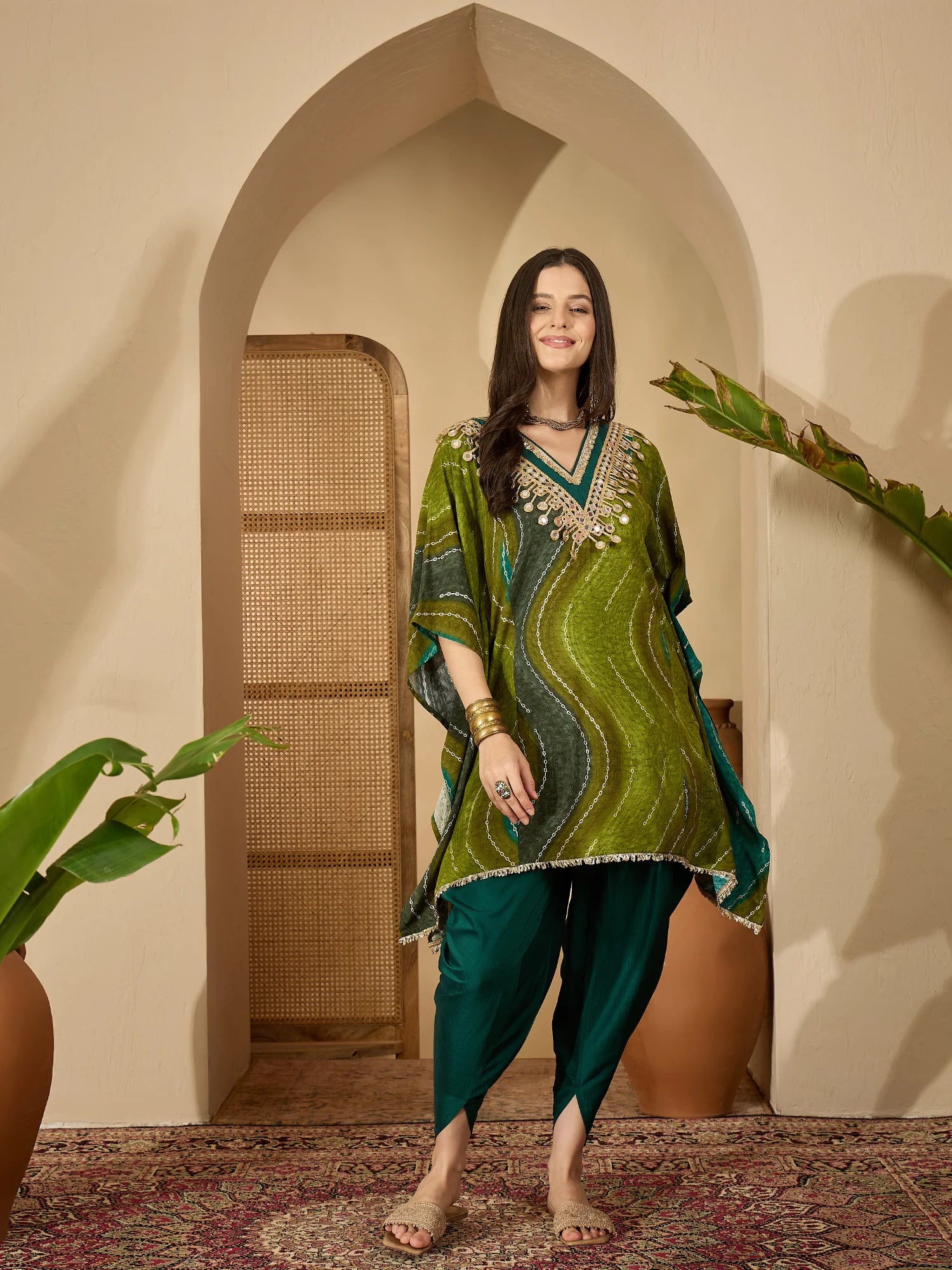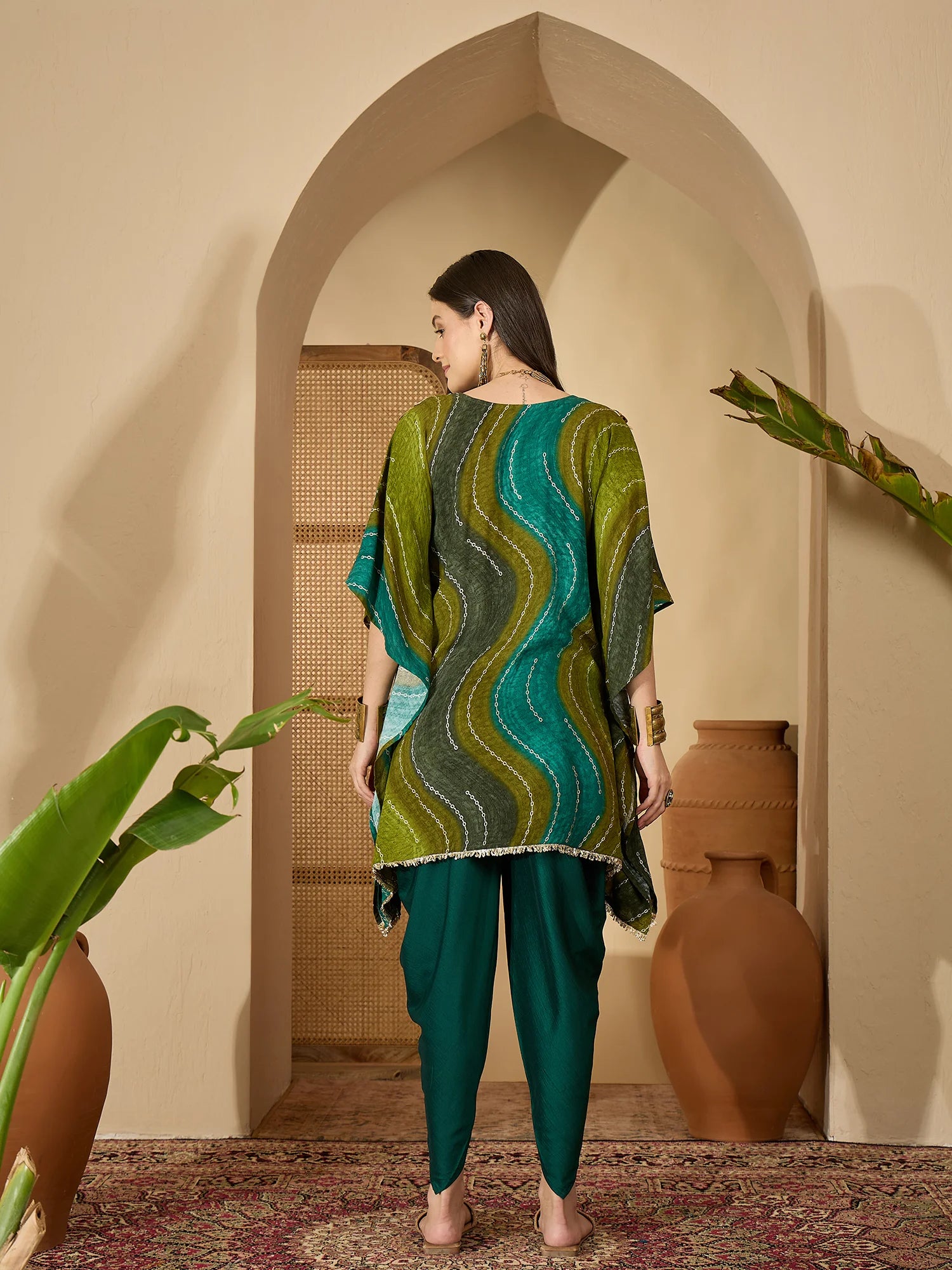 Green Viscose Rayon Leheriya Print Kaftan Kurta with Dhoti Pant Set