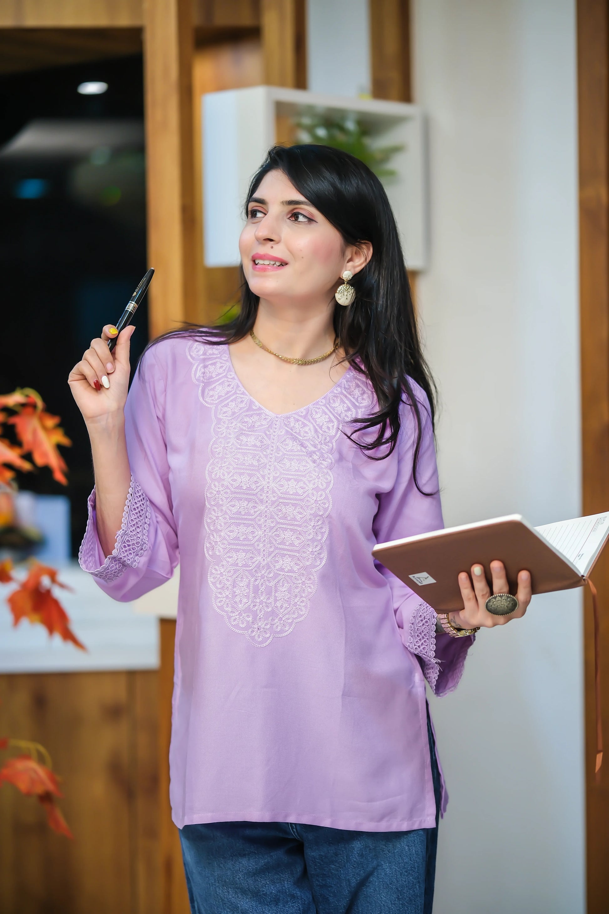 Lavender Rayon Thread Embroidery Straight Short Kurti Tunic Top
