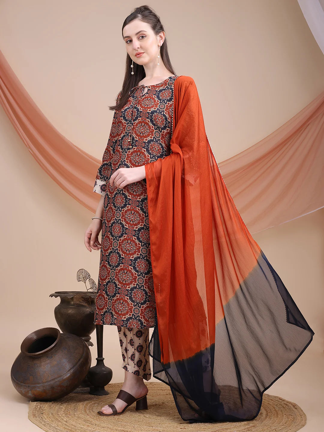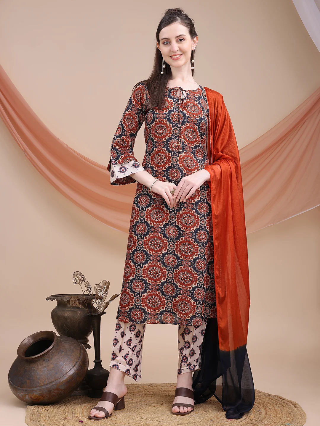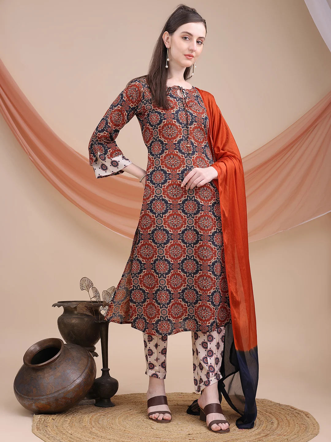 Maroon Cotton Blend Ajrak Print A-line Kurta Salwar With Dupatta