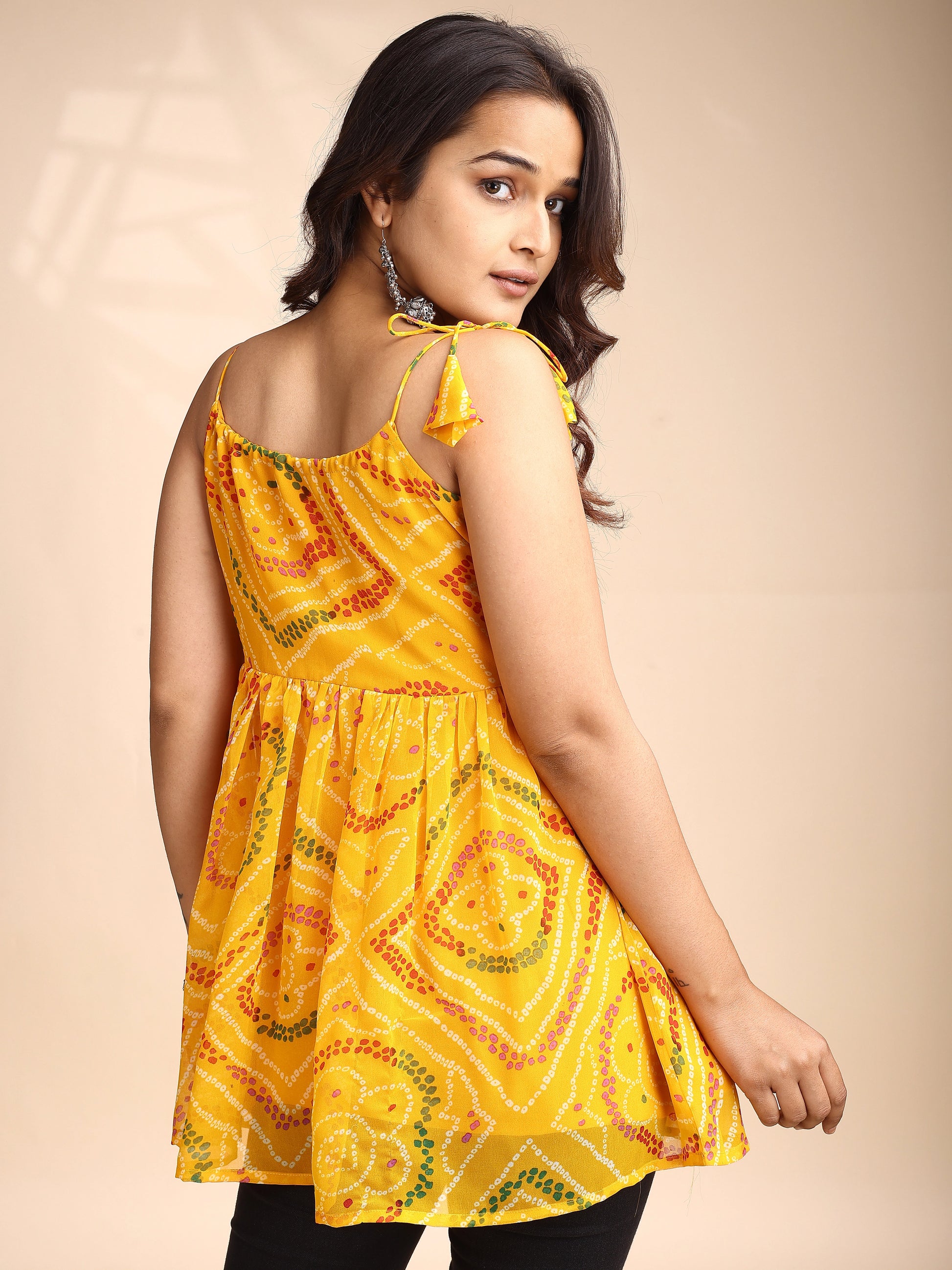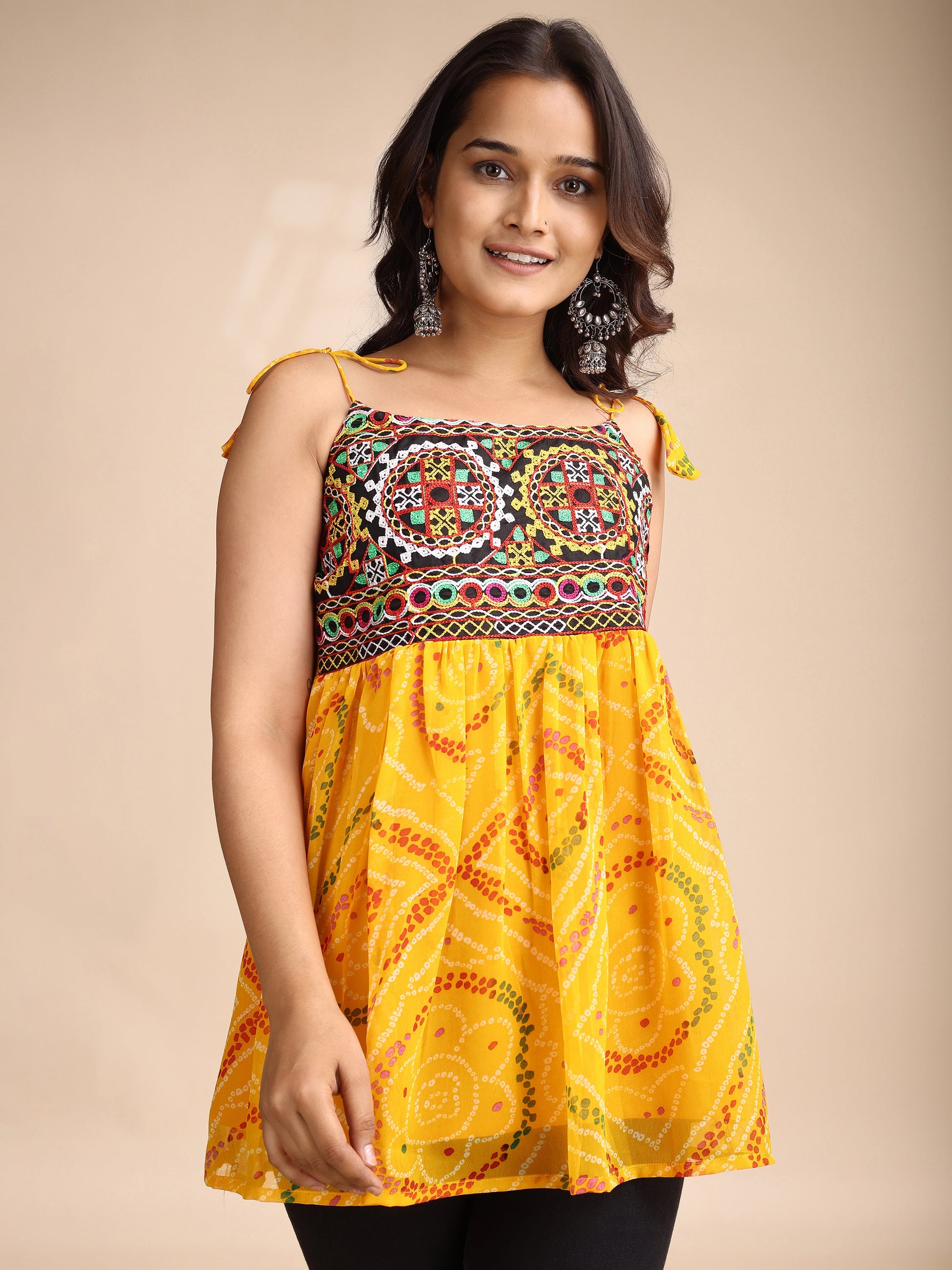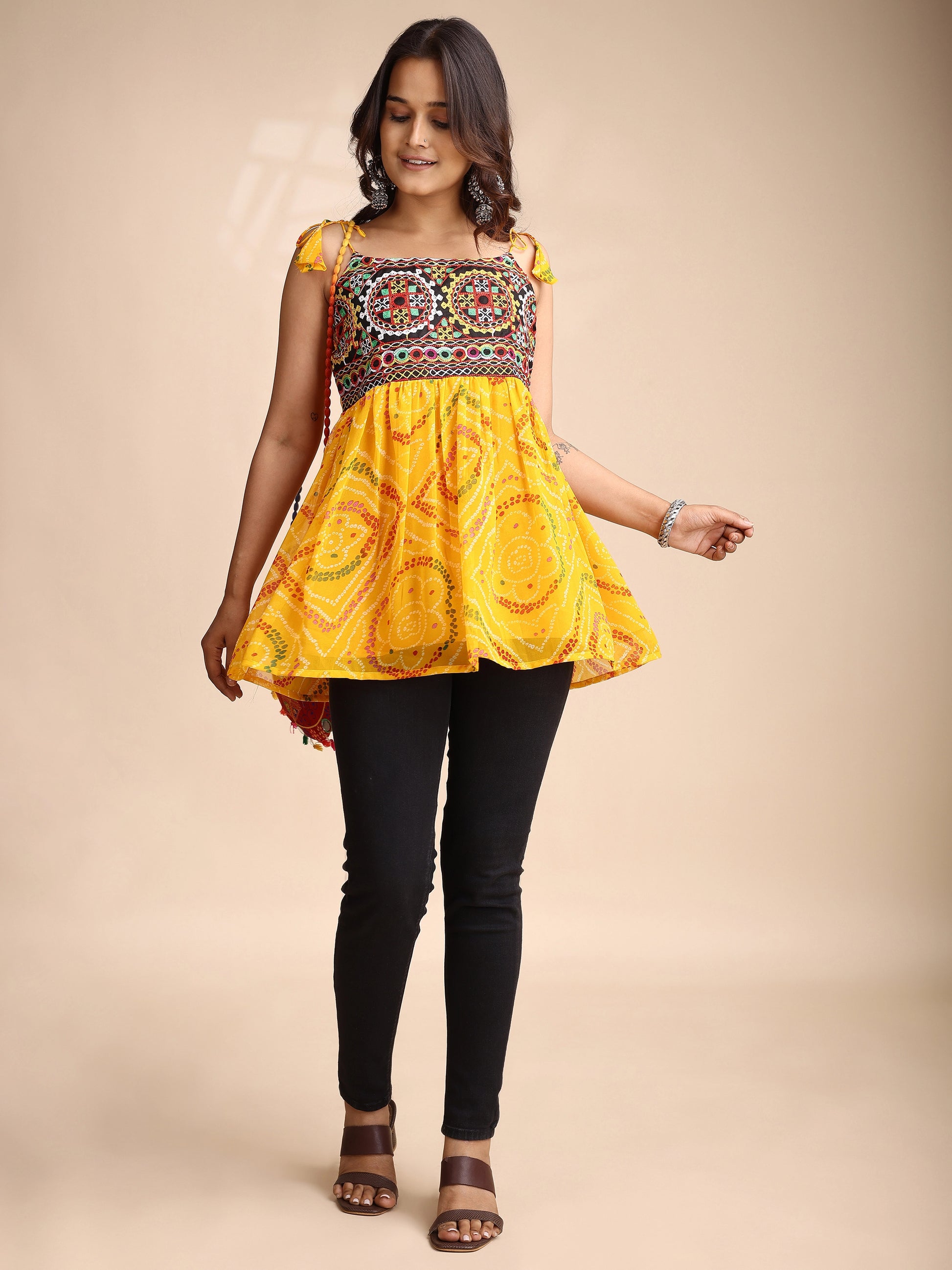 Mustard Georgette Bandhani Shoulder Knot Flared Navratri Special Short Kurti