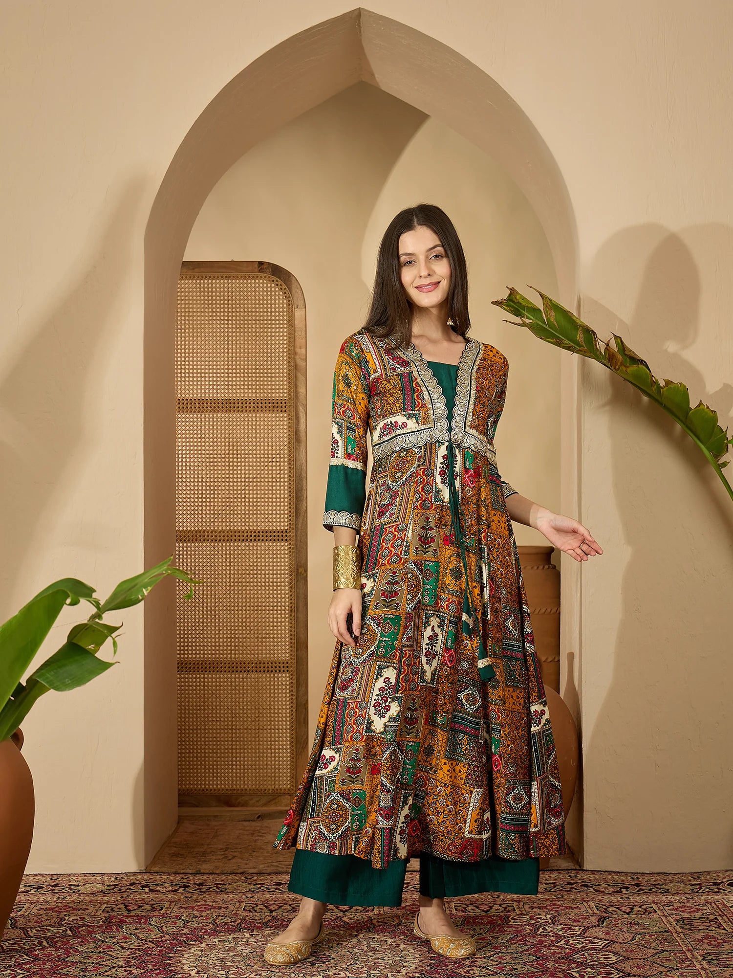 Add a royal touch to your festive look with this women’s viscose rayon embroidered Anarkali kurta palazzo with dupatta set. Designed with rich ethnic motifs and intricate embroidery, this outfit blends traditional elegance with modern grace. The flowy Anarkali silhouette and golden dupatta make it perfect for weddings, festive celebrations, and cultural occasions. A must-have ethnic set for women that promises effortless style and comfort.