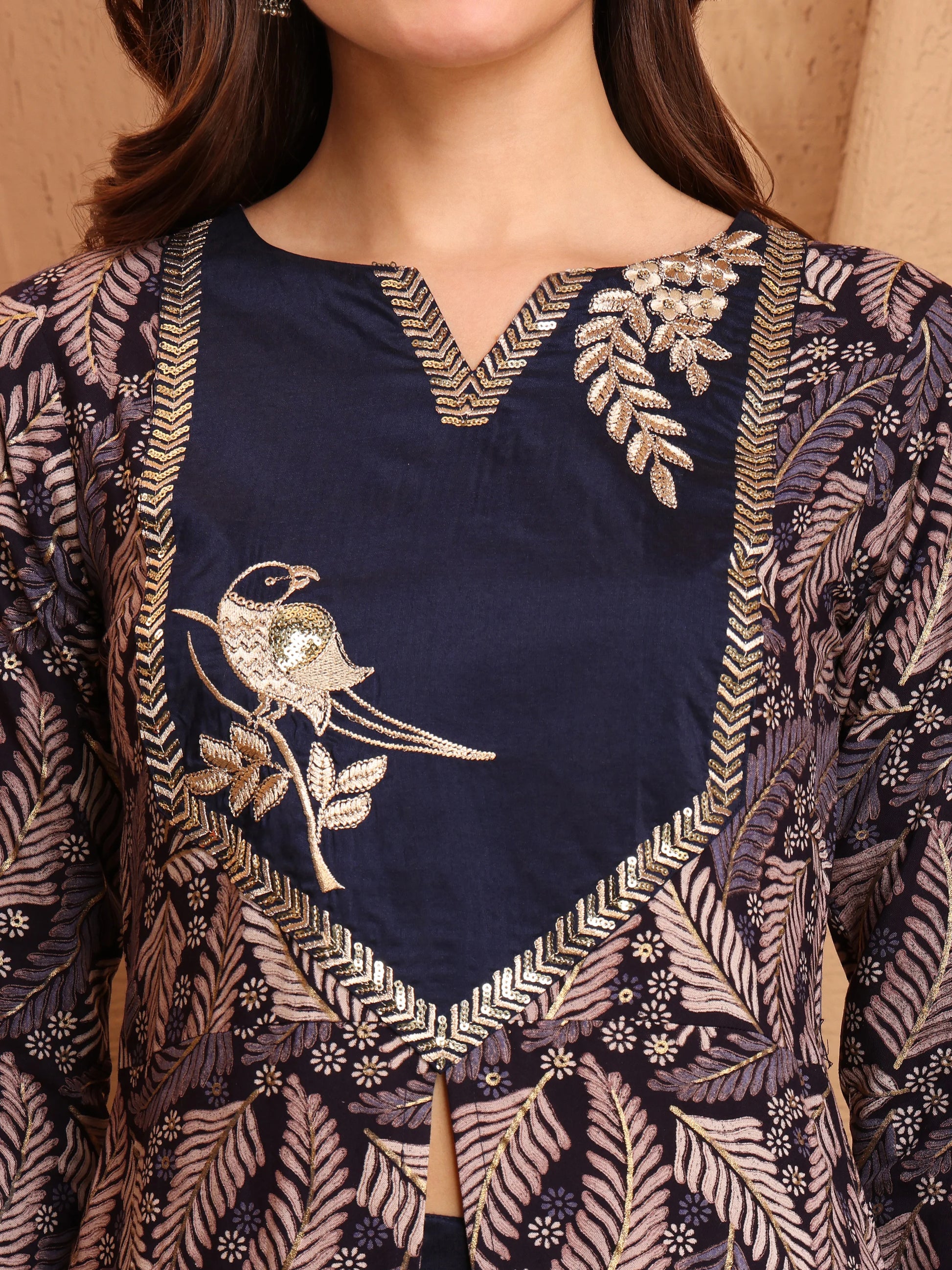 Navy Viscose Rayon Embroidered A-line front Slit Coord Set