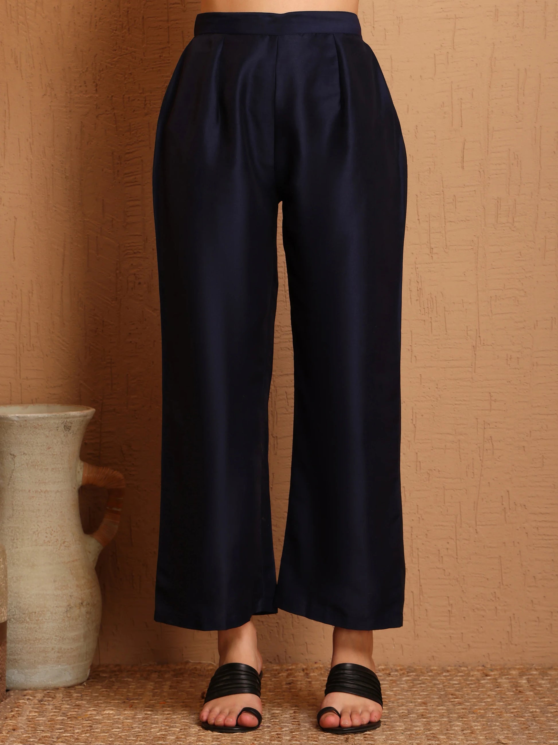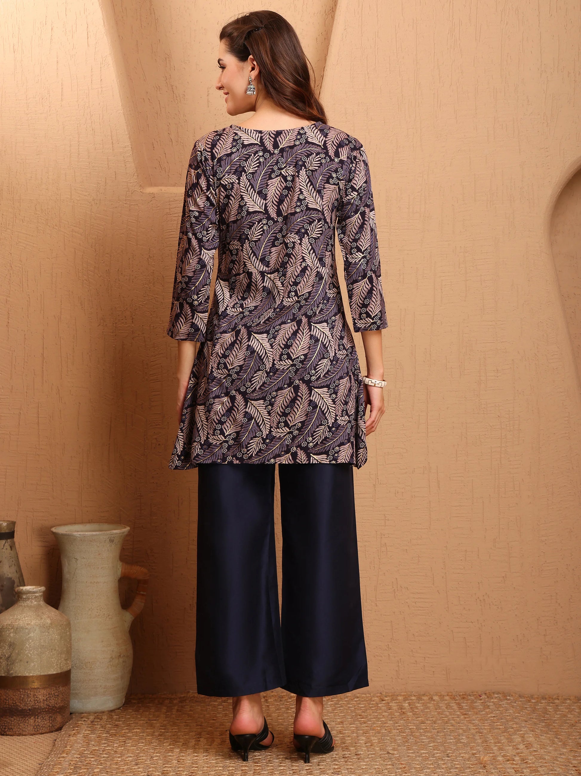 Refresh your wardrobe with this Embroidered Navy Co-ords, featuring a Three-Quarter Sleeves Kurta with an front Slit and matching wide-leg Pant.The striking Navy and Multicolor floral Design adds a bold touch, perfect for casual outings or semi-formal occasions. Made from lightweight fabric, this Embroidered co-ord set offers all-day comfort while keeping you stylish and trendy. Ideal for those who want a blend of modern ethnic fashion and comfort.