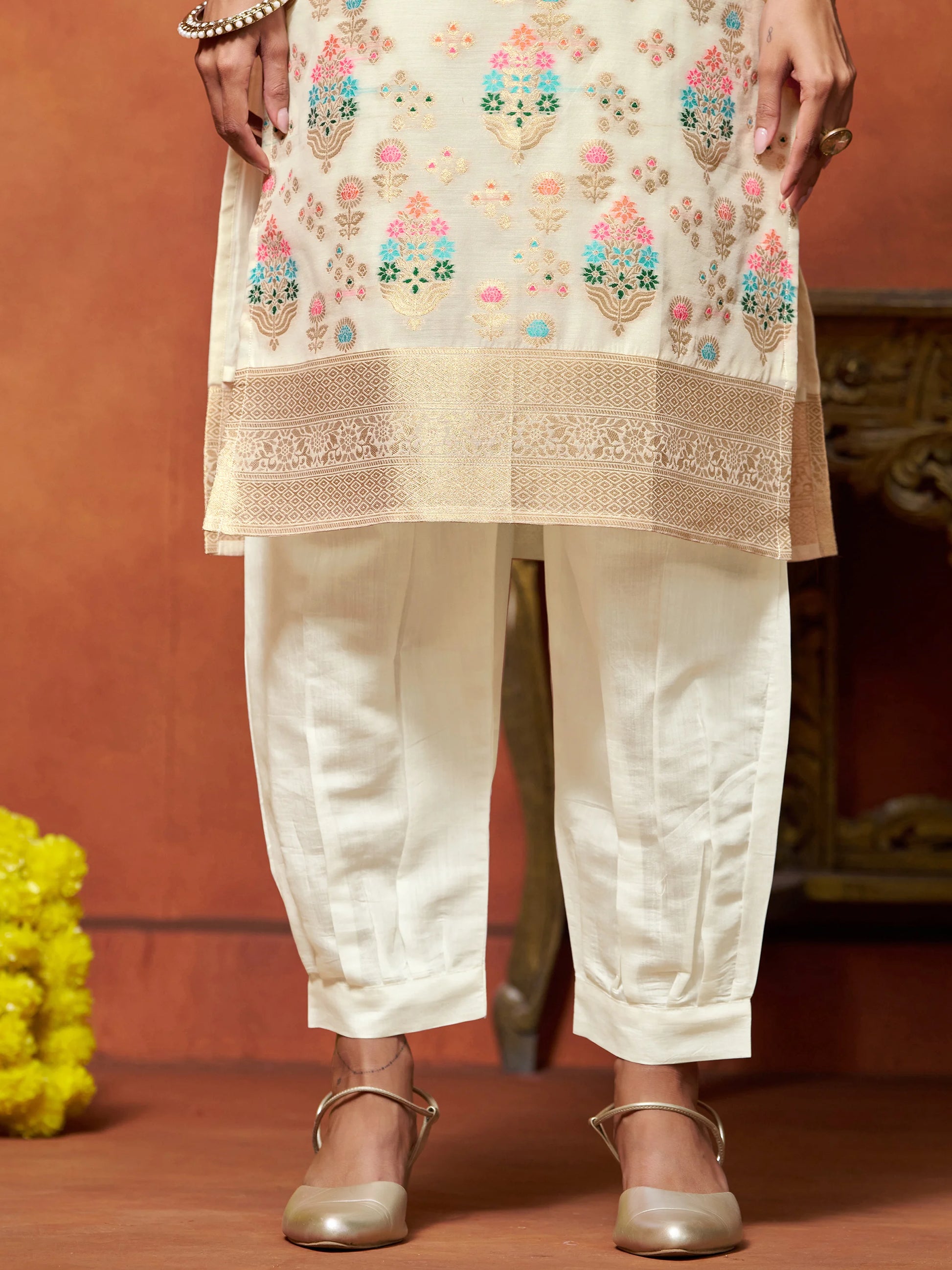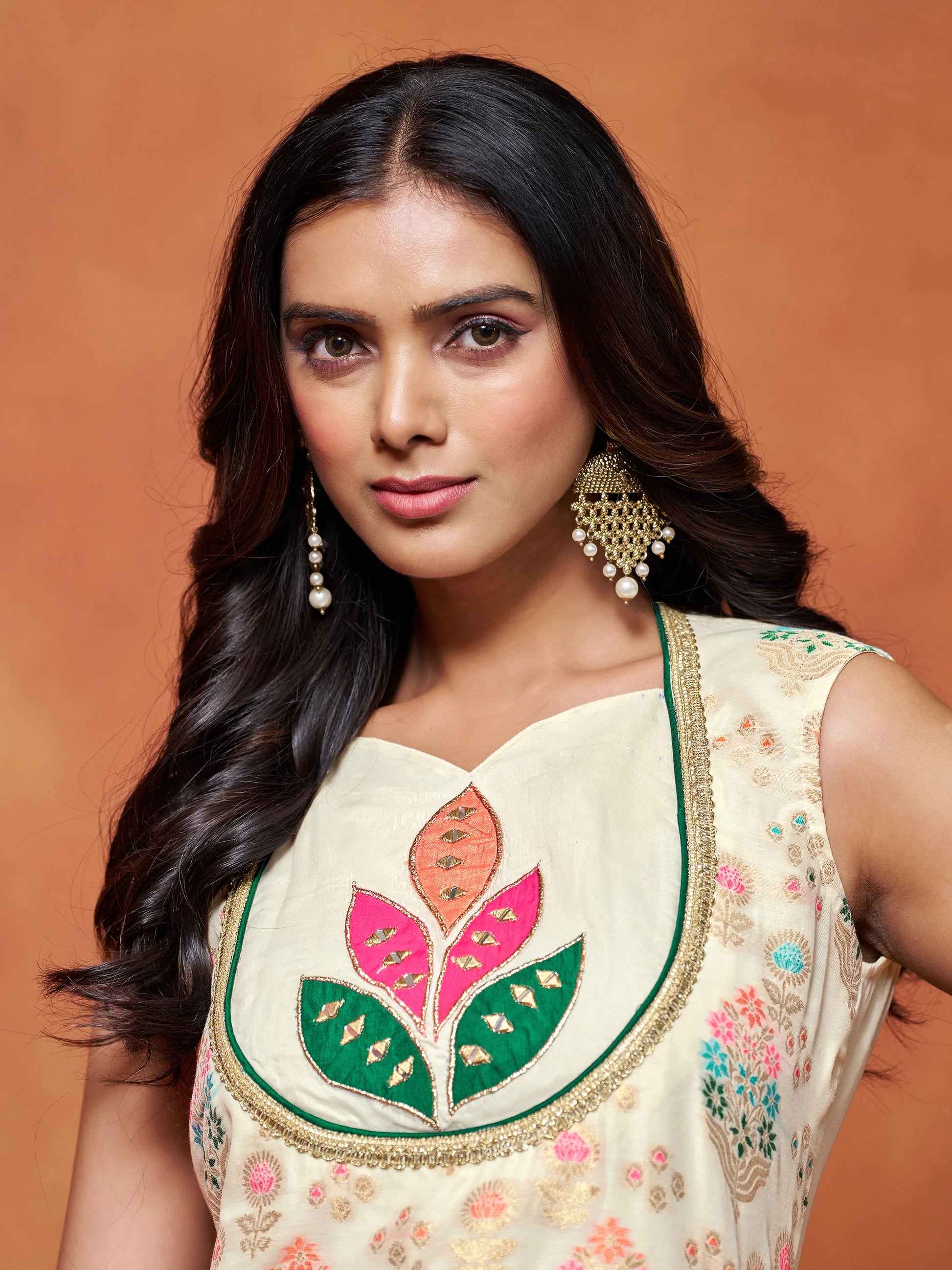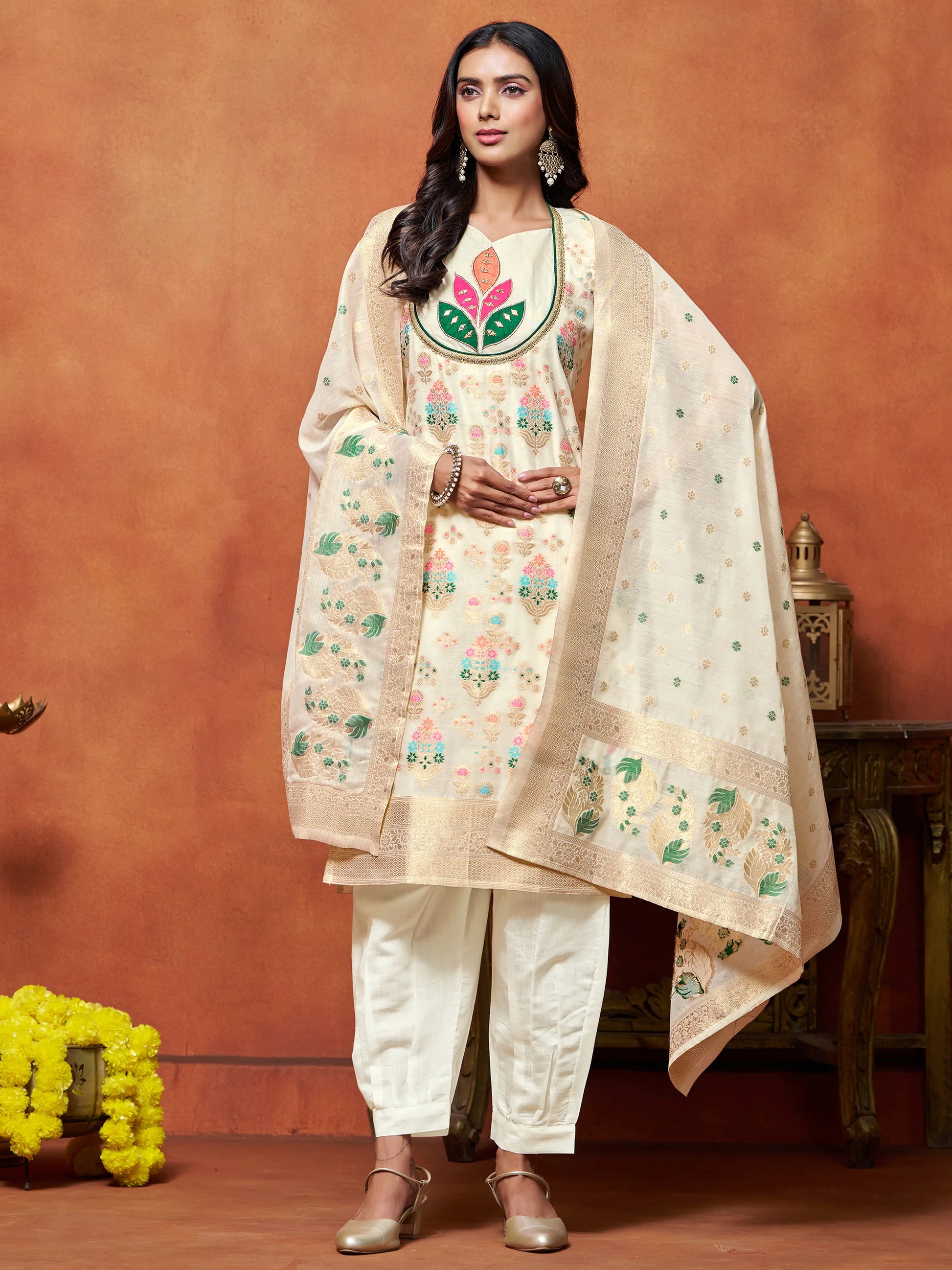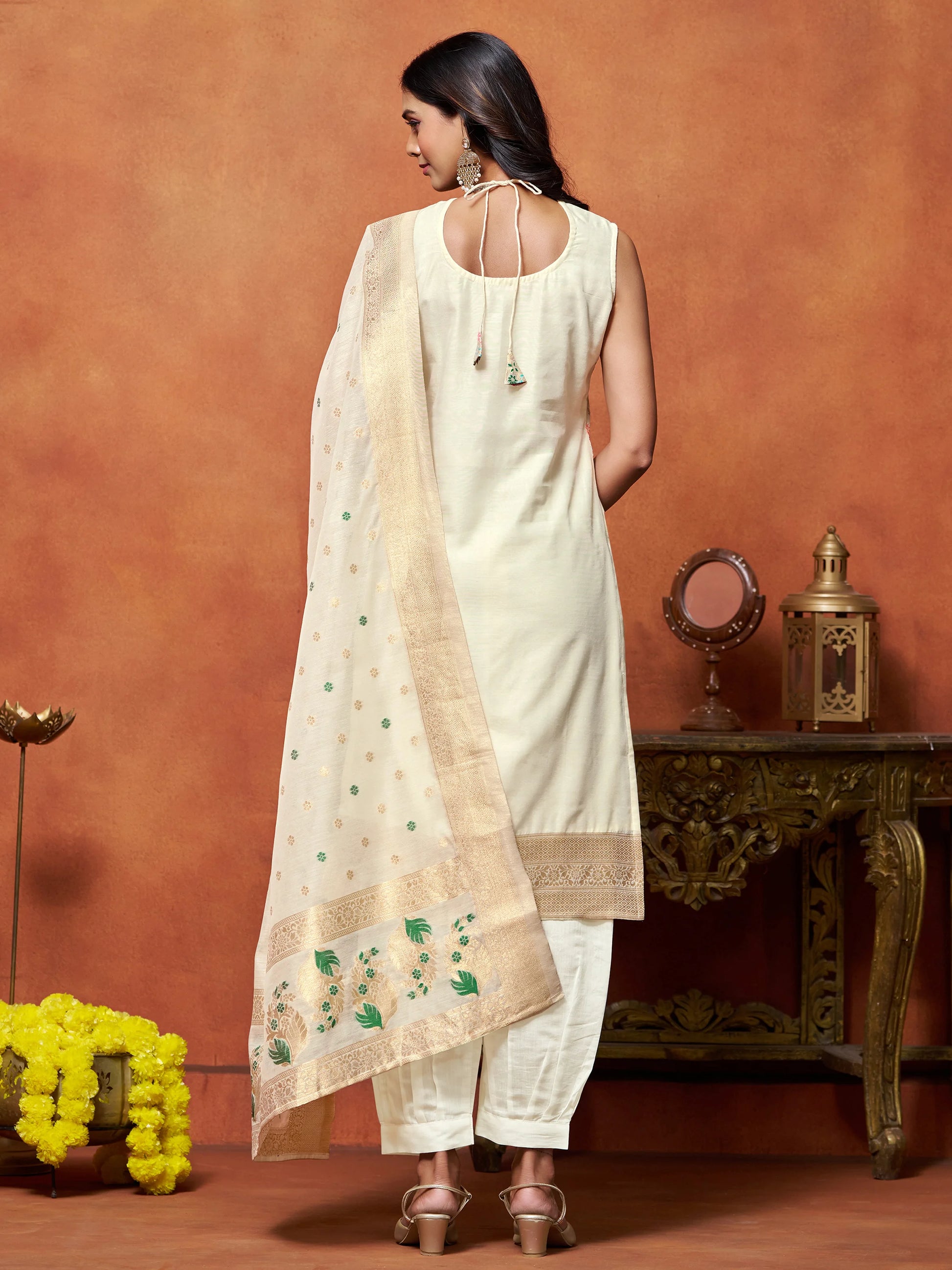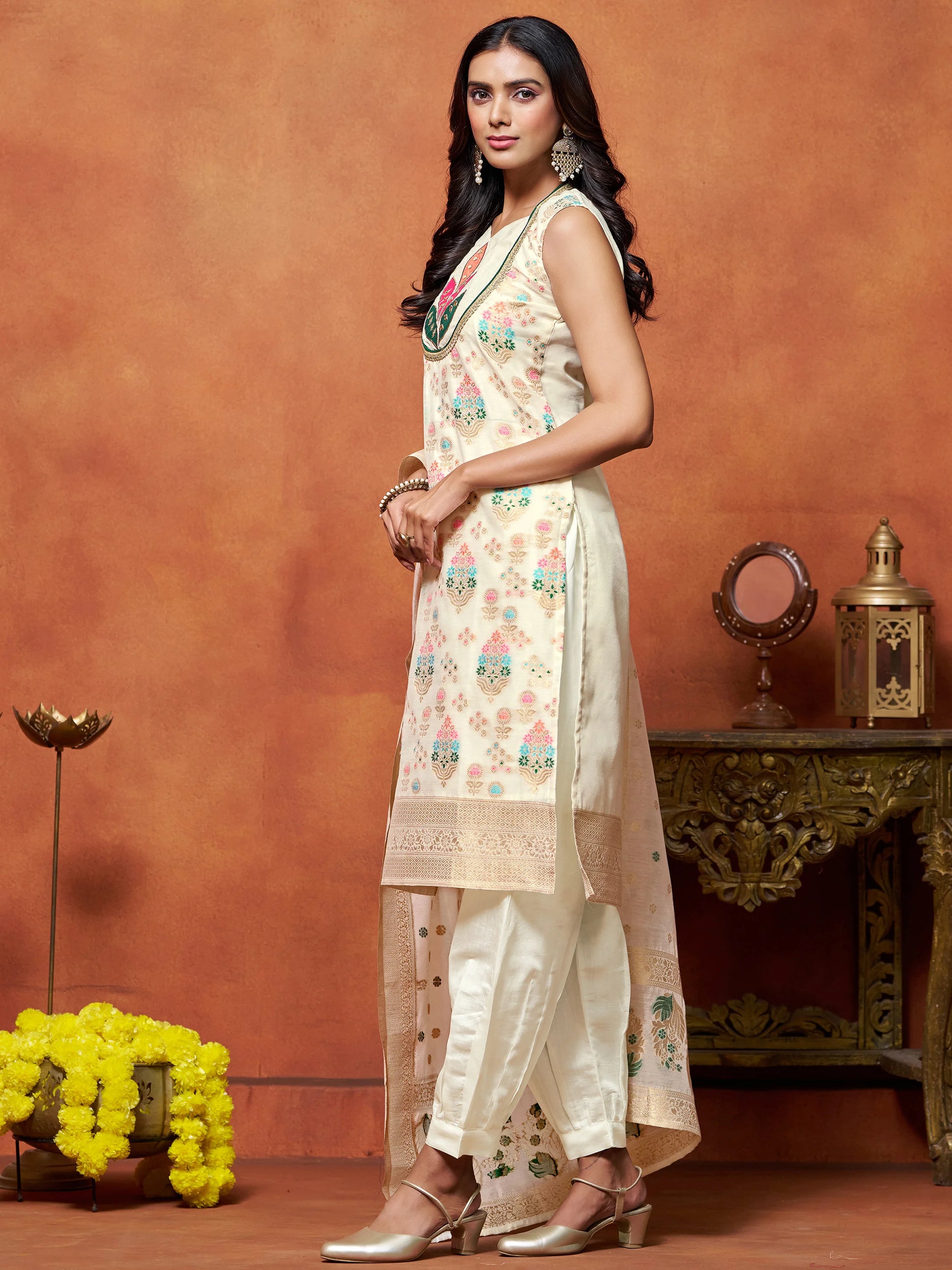 Embrace timeless elegance with this graceful Off white chanderi silk woven Embroidered Kurta Set. The sleeveless kurta is crafted from a soft, breathable fabric and adorned with intricate floral thread embroidery in vibrant hues of multicolor. A bold applique floral motif at the neckline adds a striking focal point, blending traditional craftsmanship with modern flair.