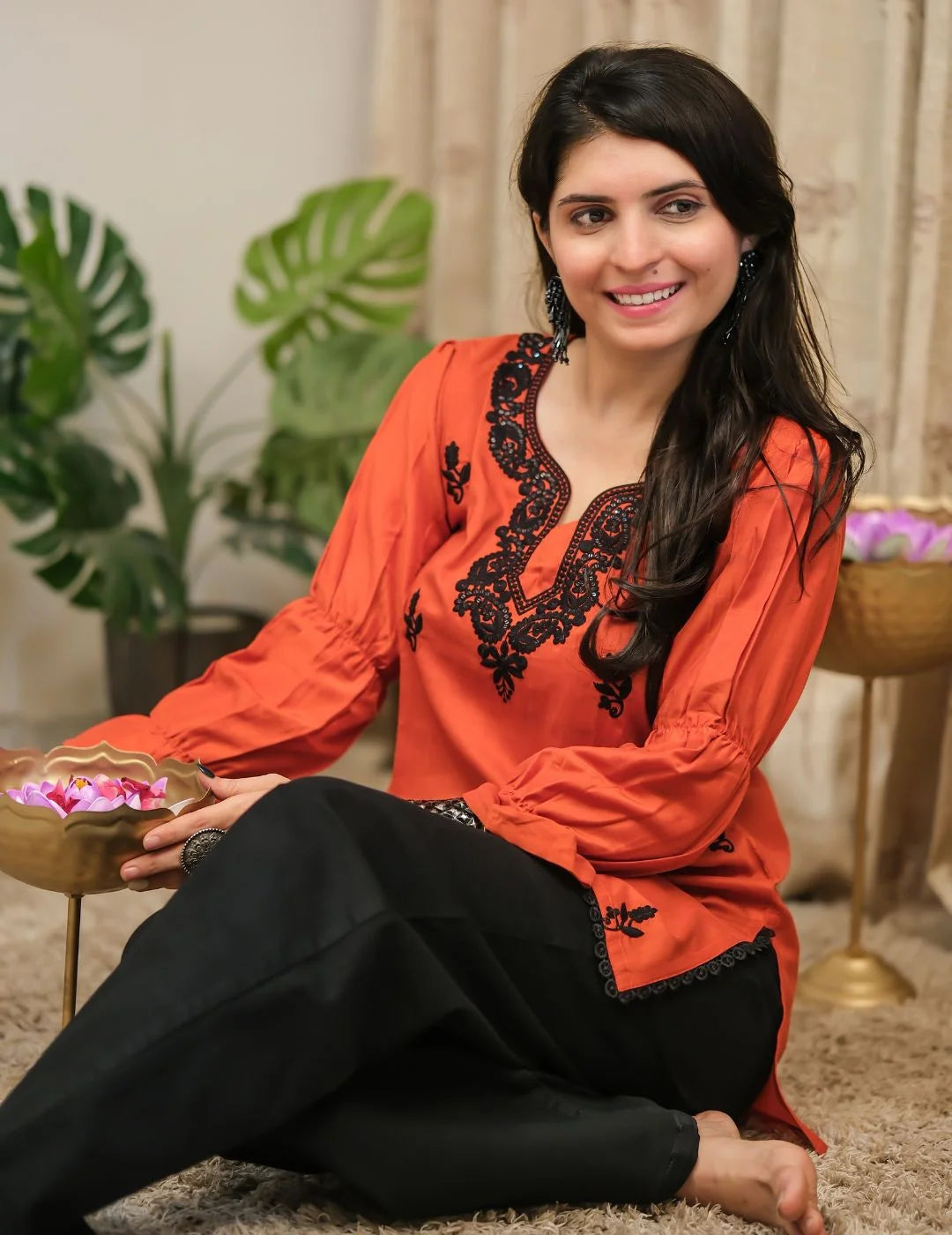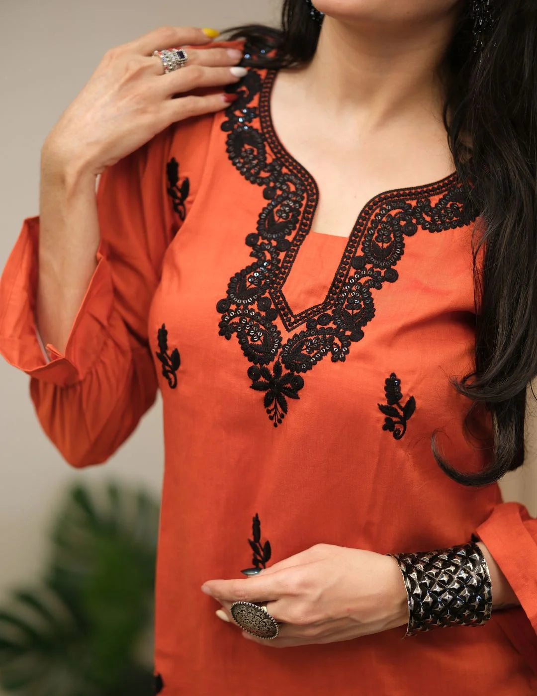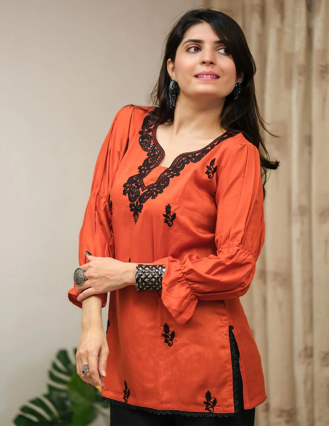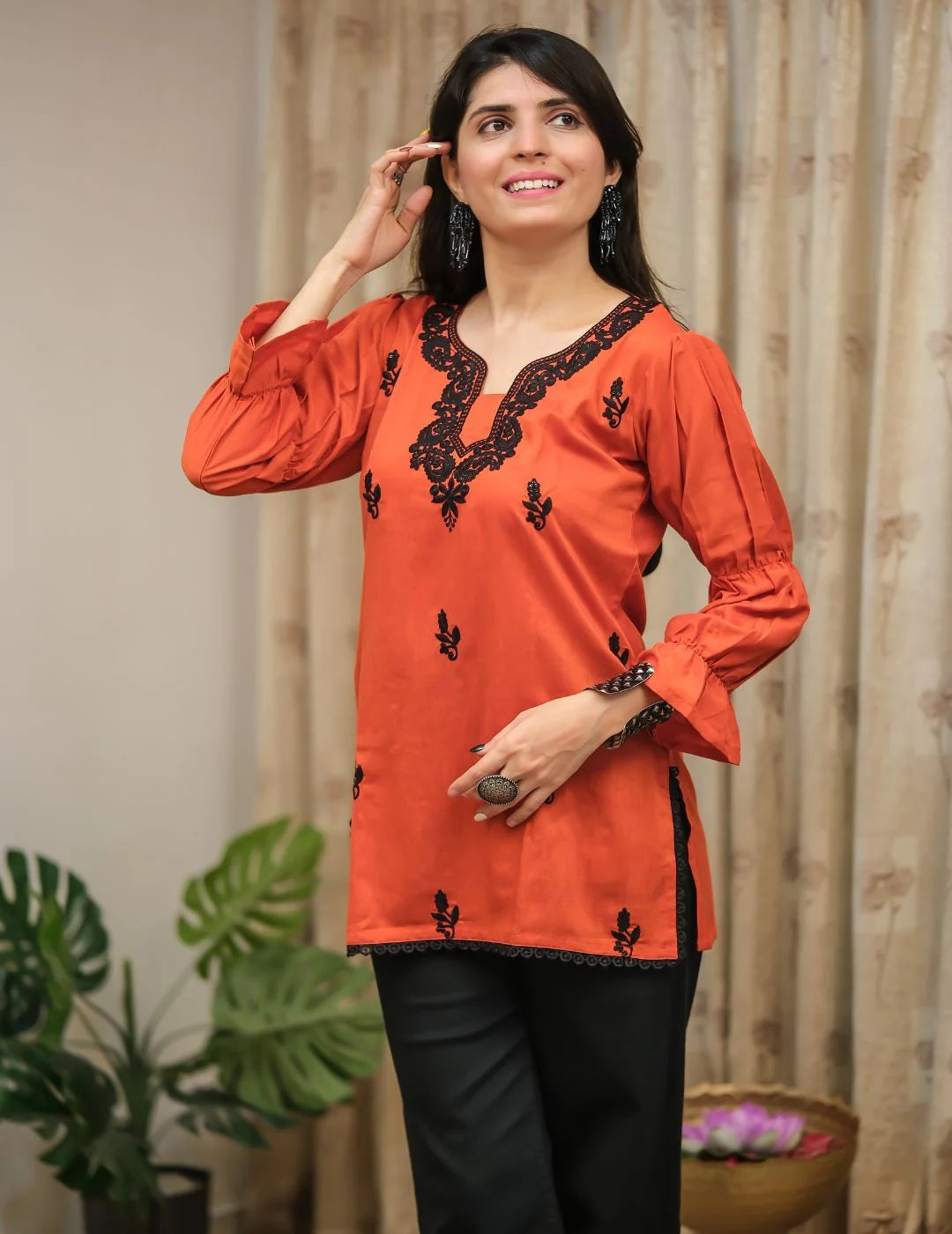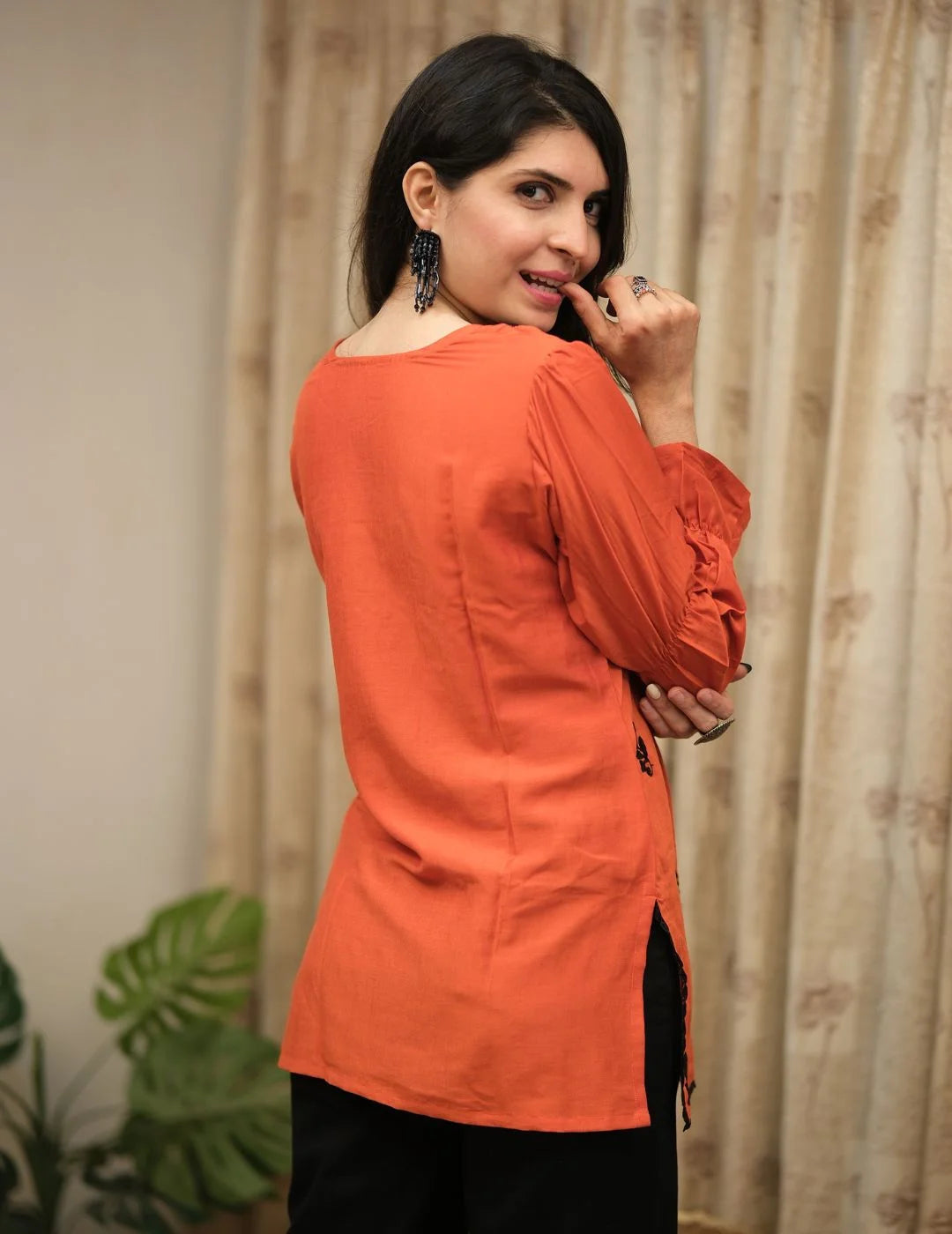 Orange Cotton Silk Embroidered Straight Short Kurti