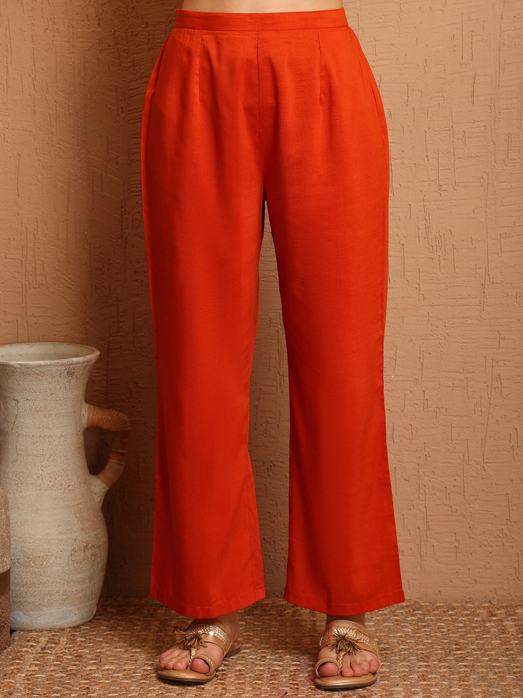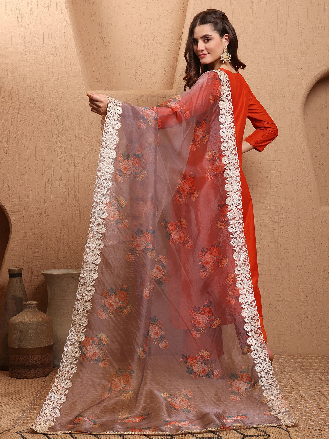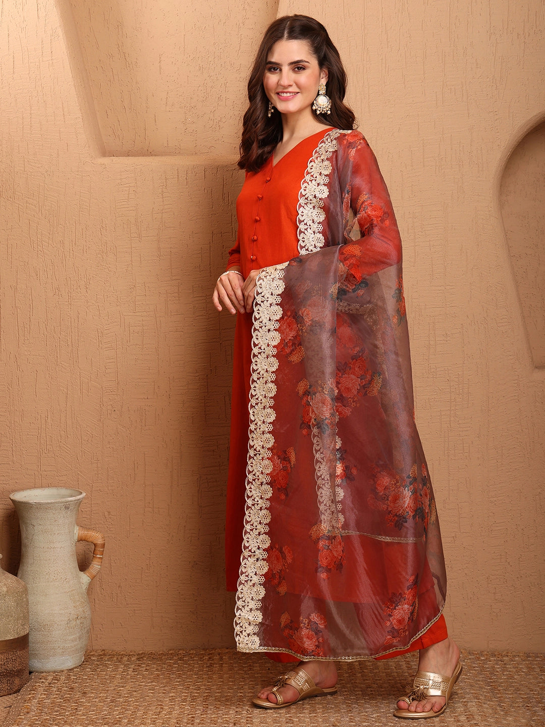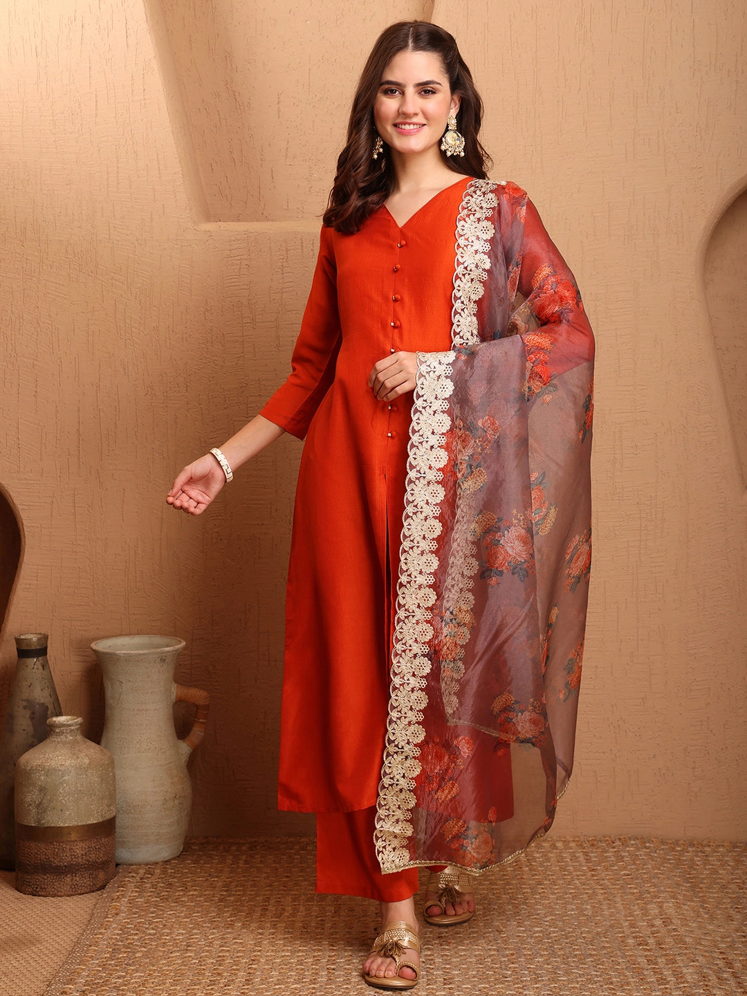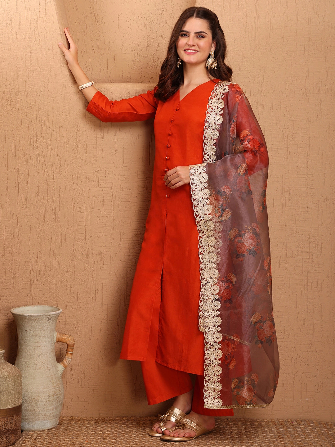 Orange Cotton Silk Solid Hight Front Slit A-Line Kurta Palazzo With Organza Dupatta Set