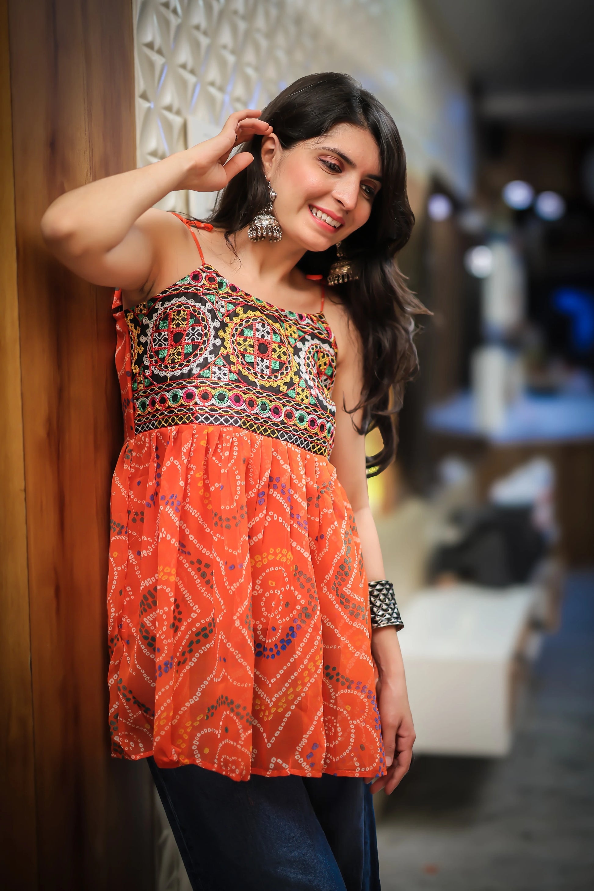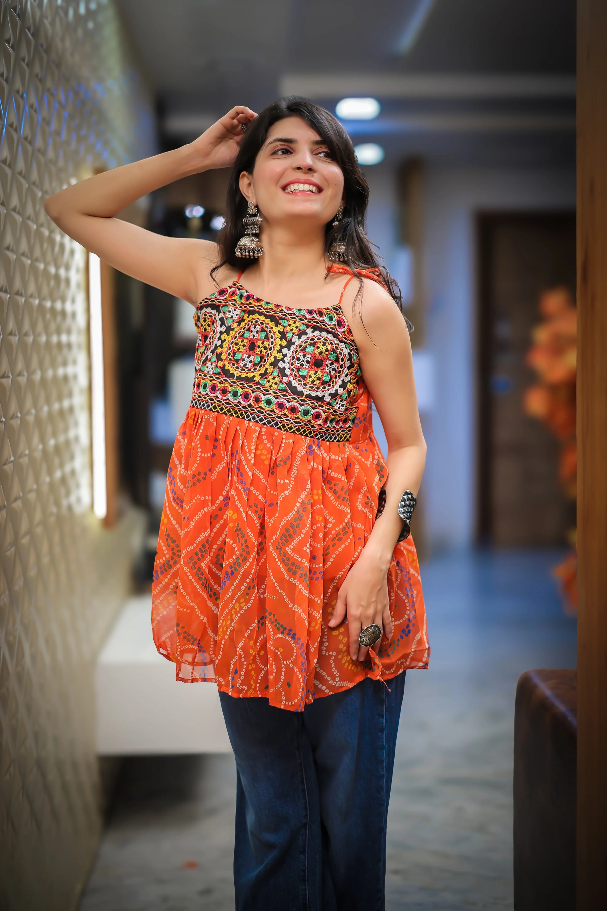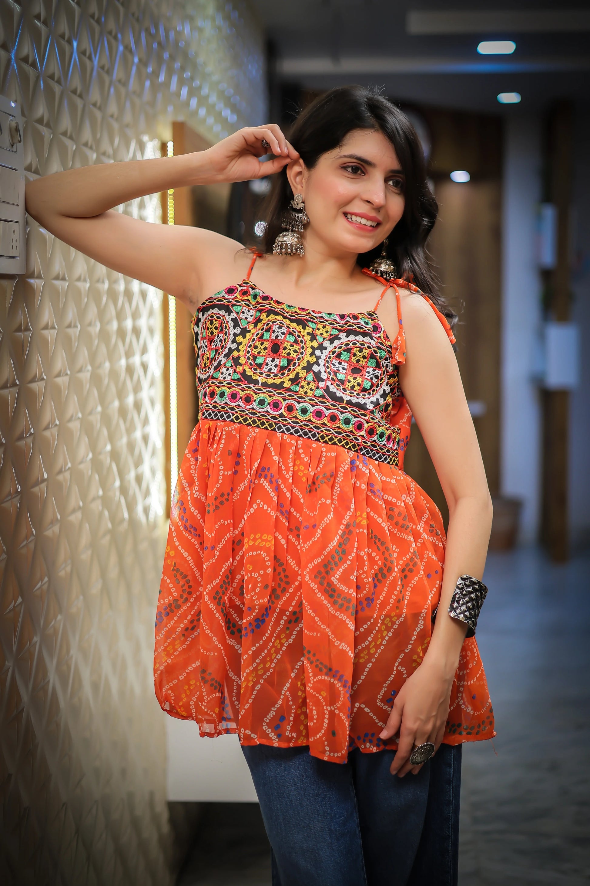 Orange bandhani top with intricate threadwork on the yoke and vivid ethnic patterns throughout. Designed with an A-line flared cut and adjustable tie-up shoulders for effortless style and comfort. Perfect for Navratri, festive gatherings, or everyday ethnic-casual outfits. Easily styled with denim or ethnic bottoms for a trendy fusion ensemble.