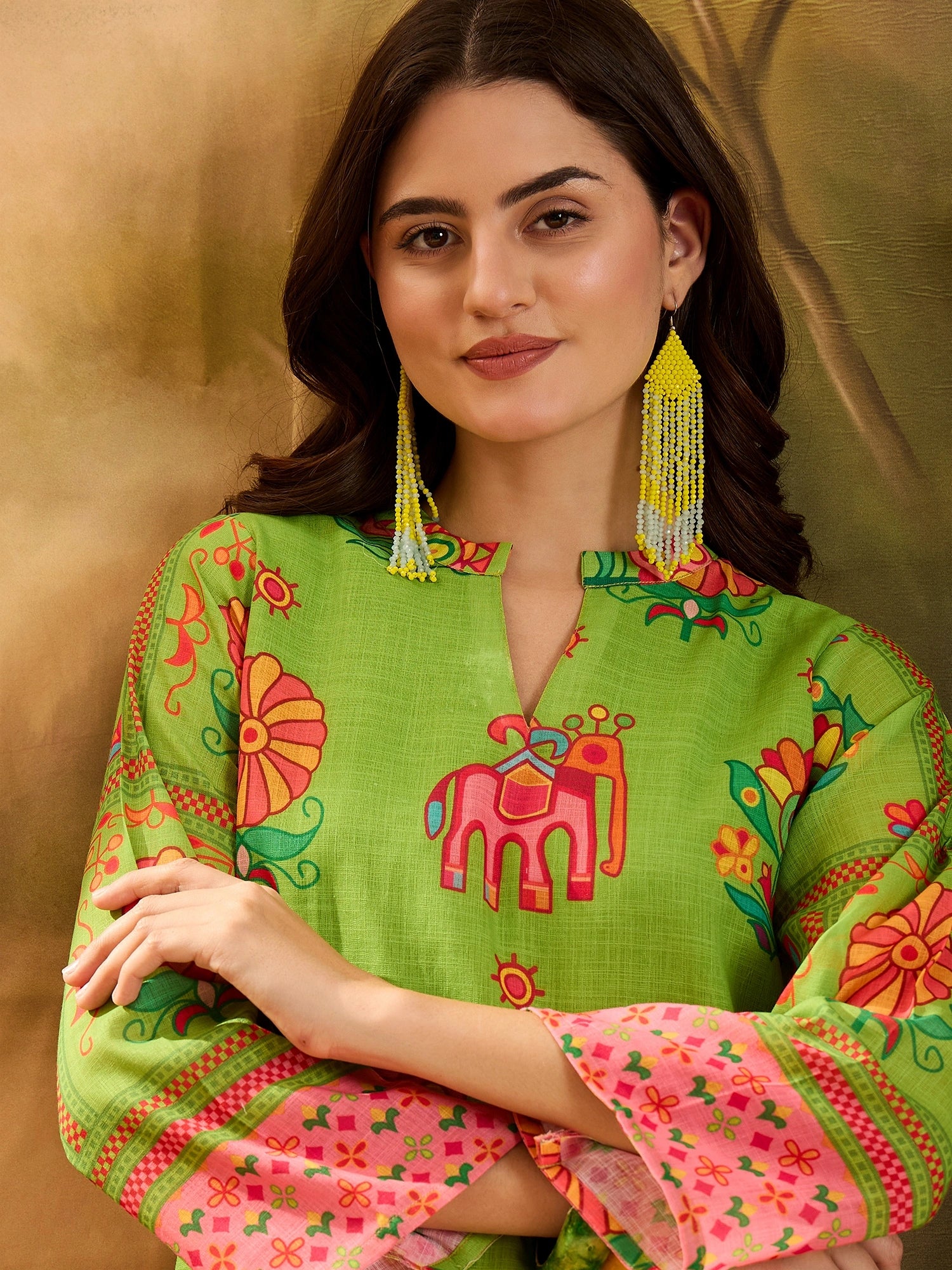 Parrot Green Linen Floral Print Summer Wear Straight Kurta With Afghani Pant Set