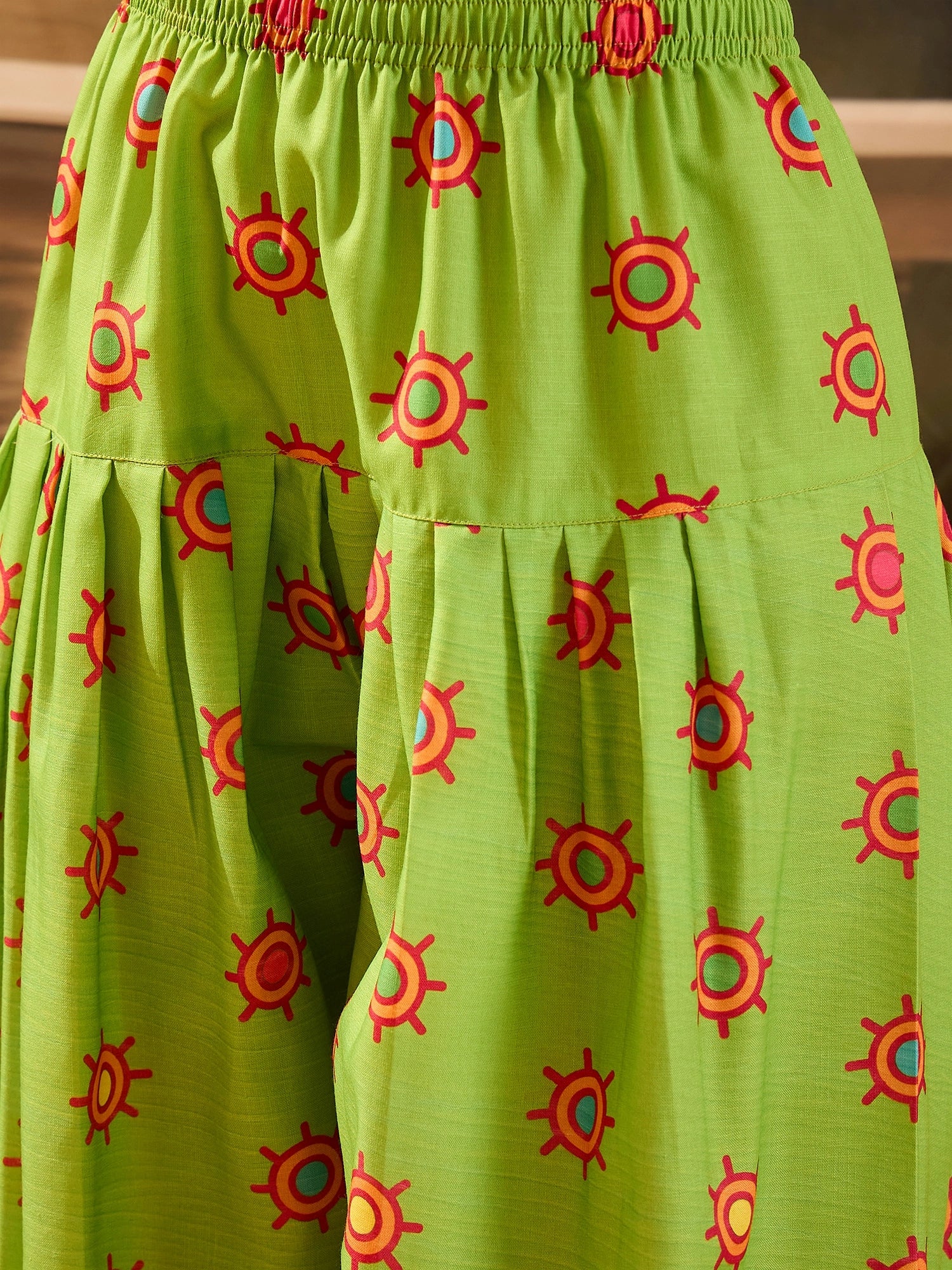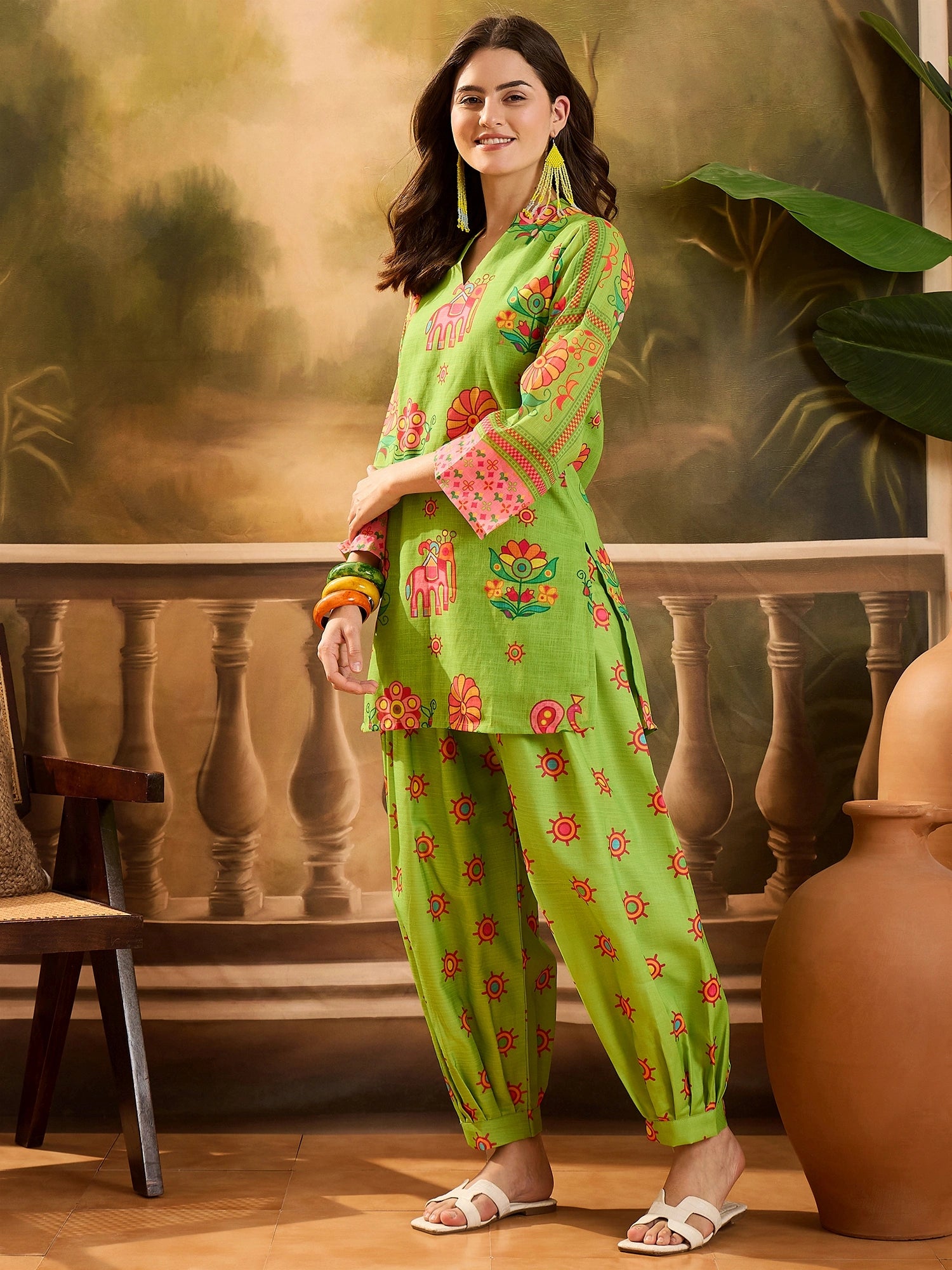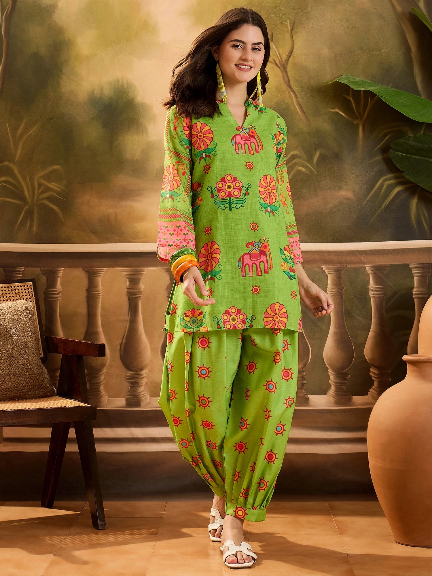 Refresh your wardrobe with this Digital Floral Print Parrot Green Co-ords, featuring a Three-Quarter Bell Sleeves Kurti with an Straight hem and matching wide-leg Afghani.The striking Green floral print on a deep Multicolor Prints adds a bold touch, perfect for casual outings or semi-formal occasions. Made from lightweight fabric, this floral co-ord set offers all-day comfort while keeping you stylish and trendy. Ideal for those who want a blend of modern ethnic fashion and comfort.