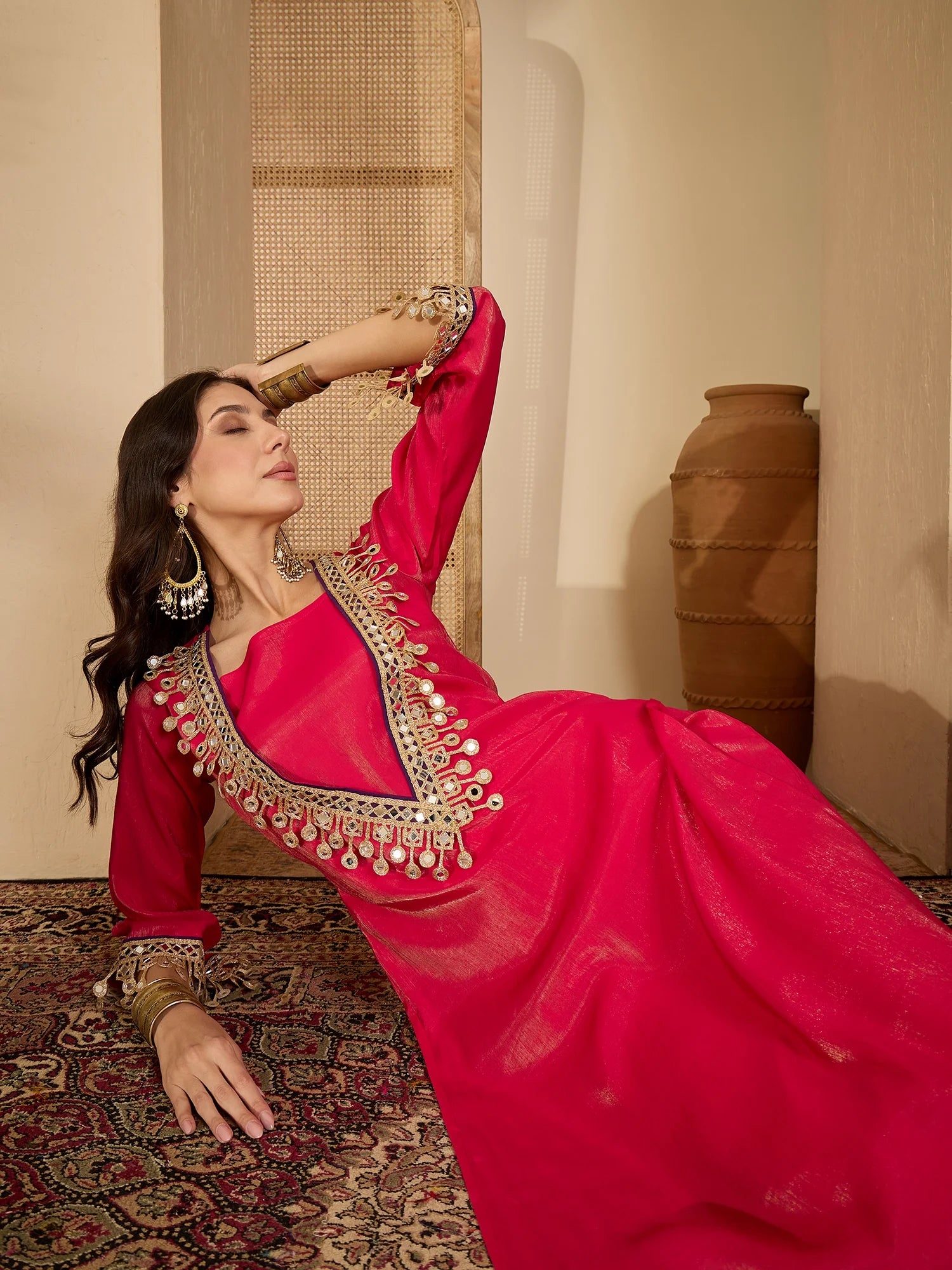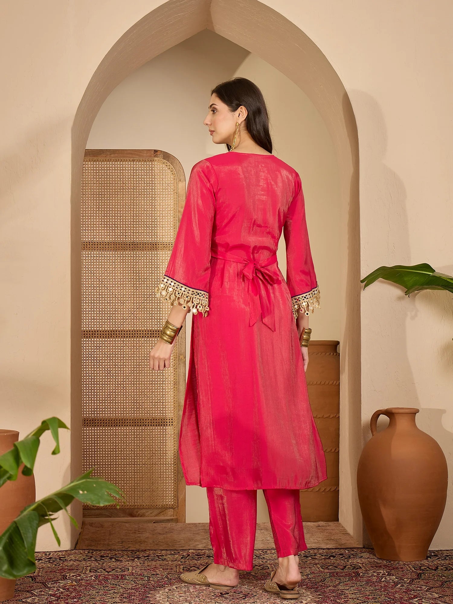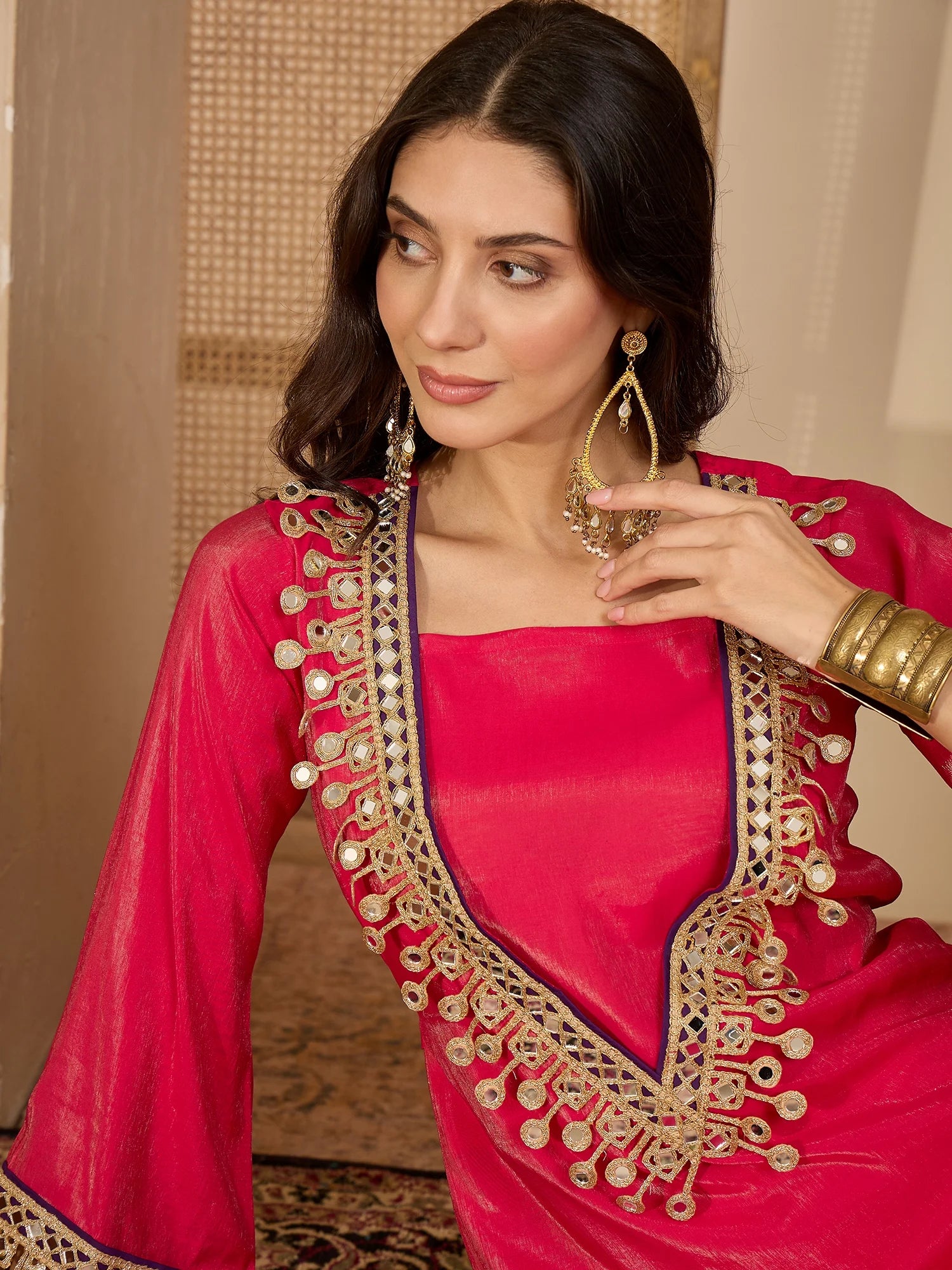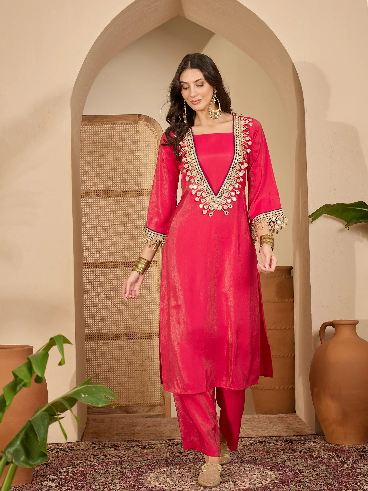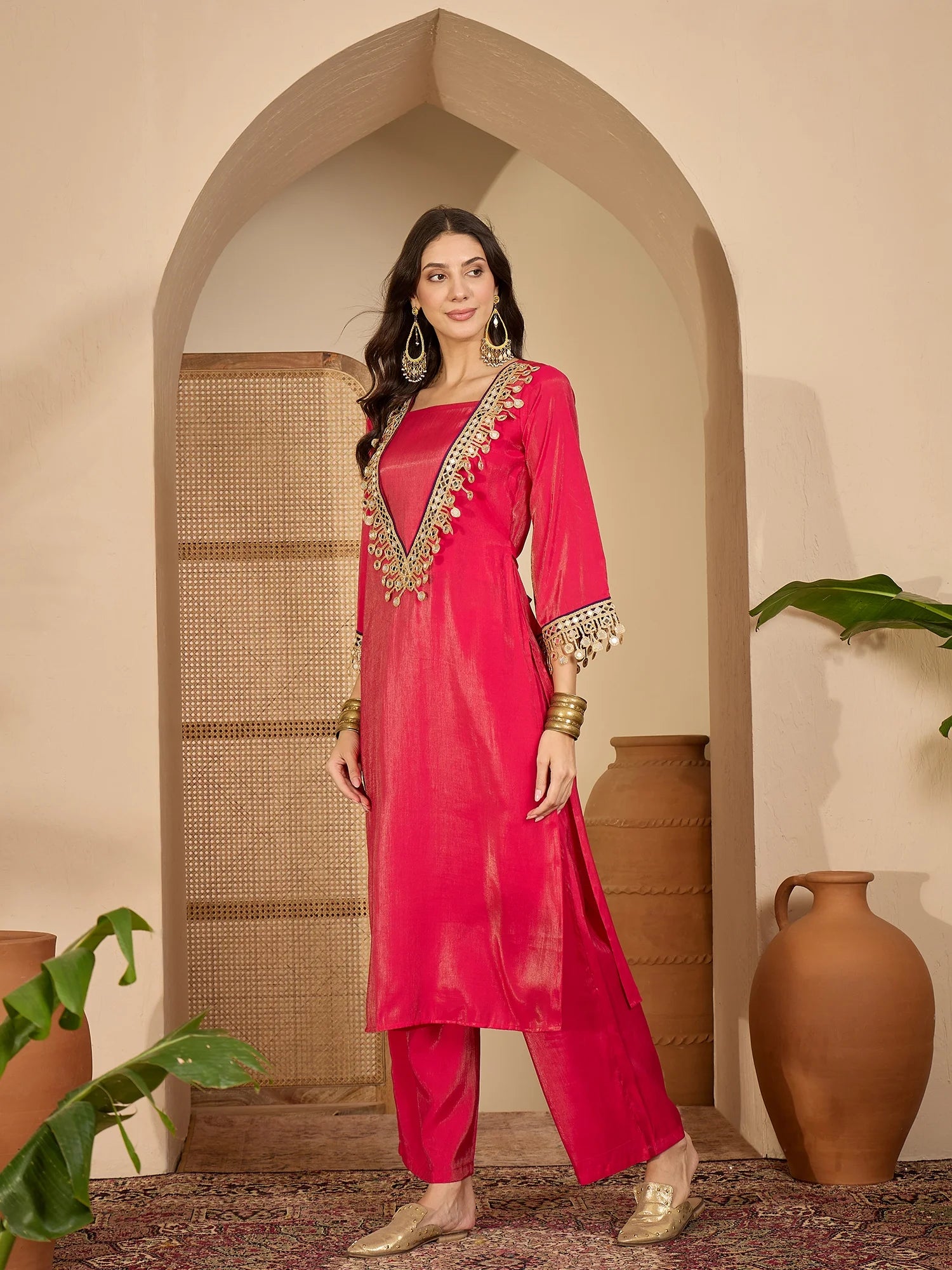 Step into elegance with the Silk Blend Embroidered Kurta Palazzo Set, a perfect blend of sophistication and style. This fully stitched ready-to-wear ensemble features a gracefully Straight Kurta with a fancy V- Neck Embroidered design, Bell Sleeves. Paired with a beautifully statement jewellery and a pair of juttis, this outfit is ideal for weddings, festive occasions, and cultural gatherings.