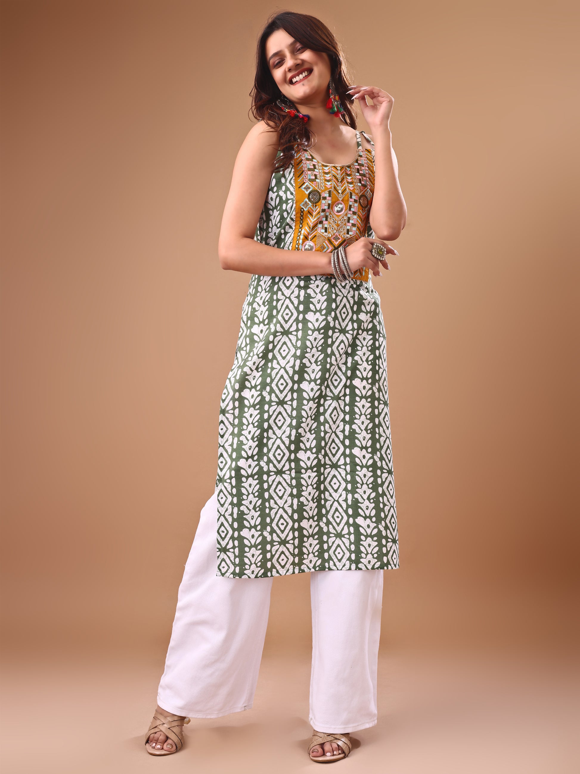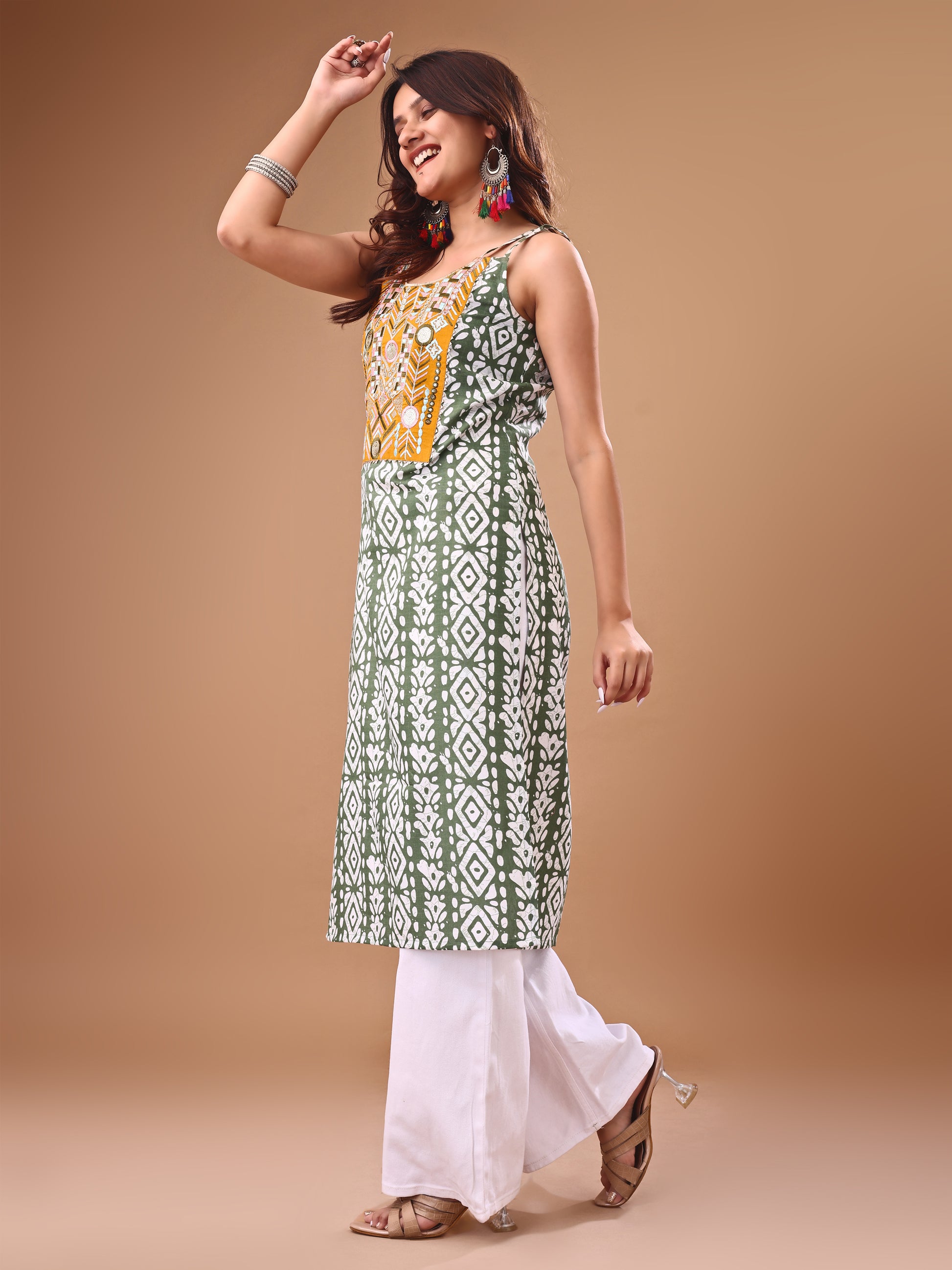 Green Cotton Blend Embroidered Batik Print Straight Shoulder Straps Summer Kurta