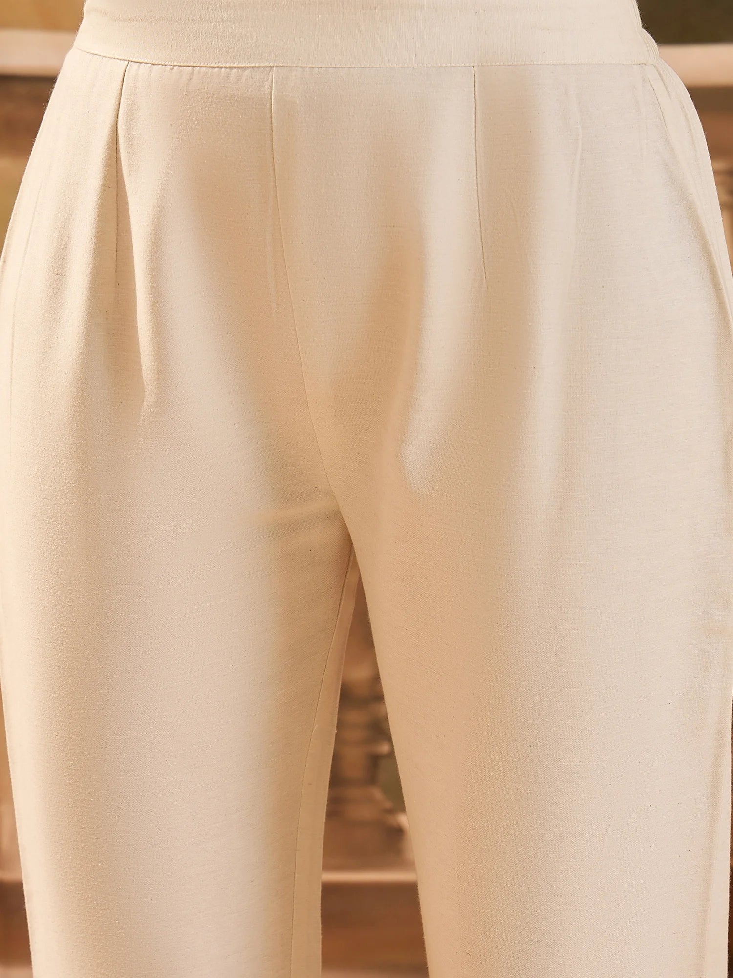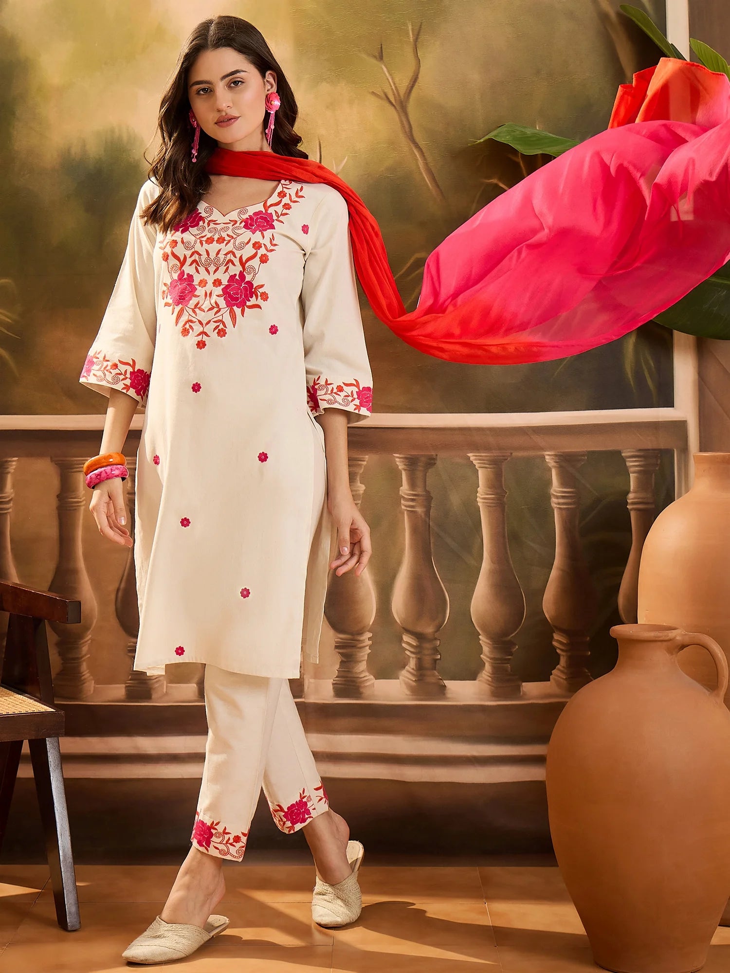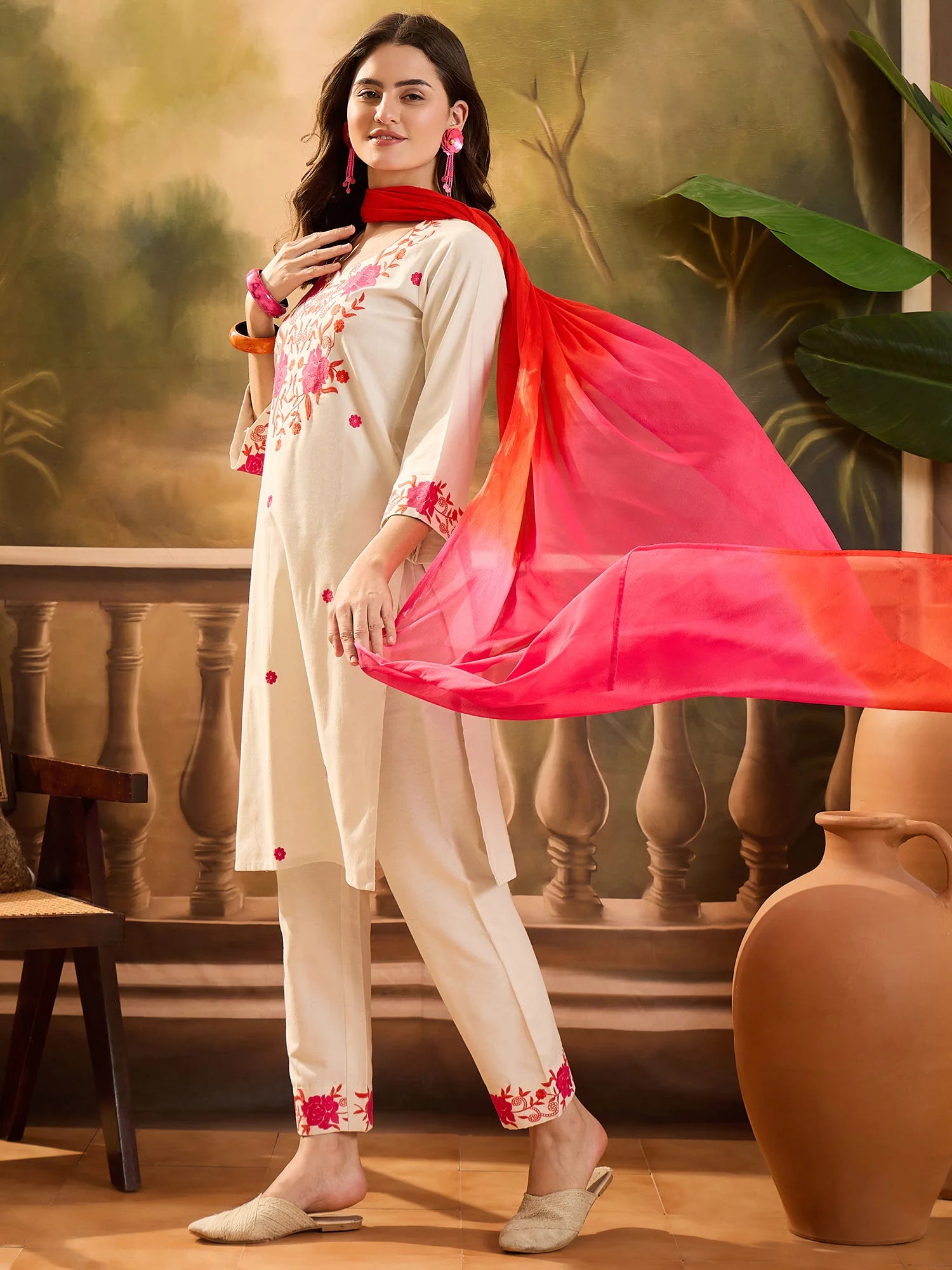 Pink Cotton Blend Floral Embroidered Kurta Pant and Dupatta Set