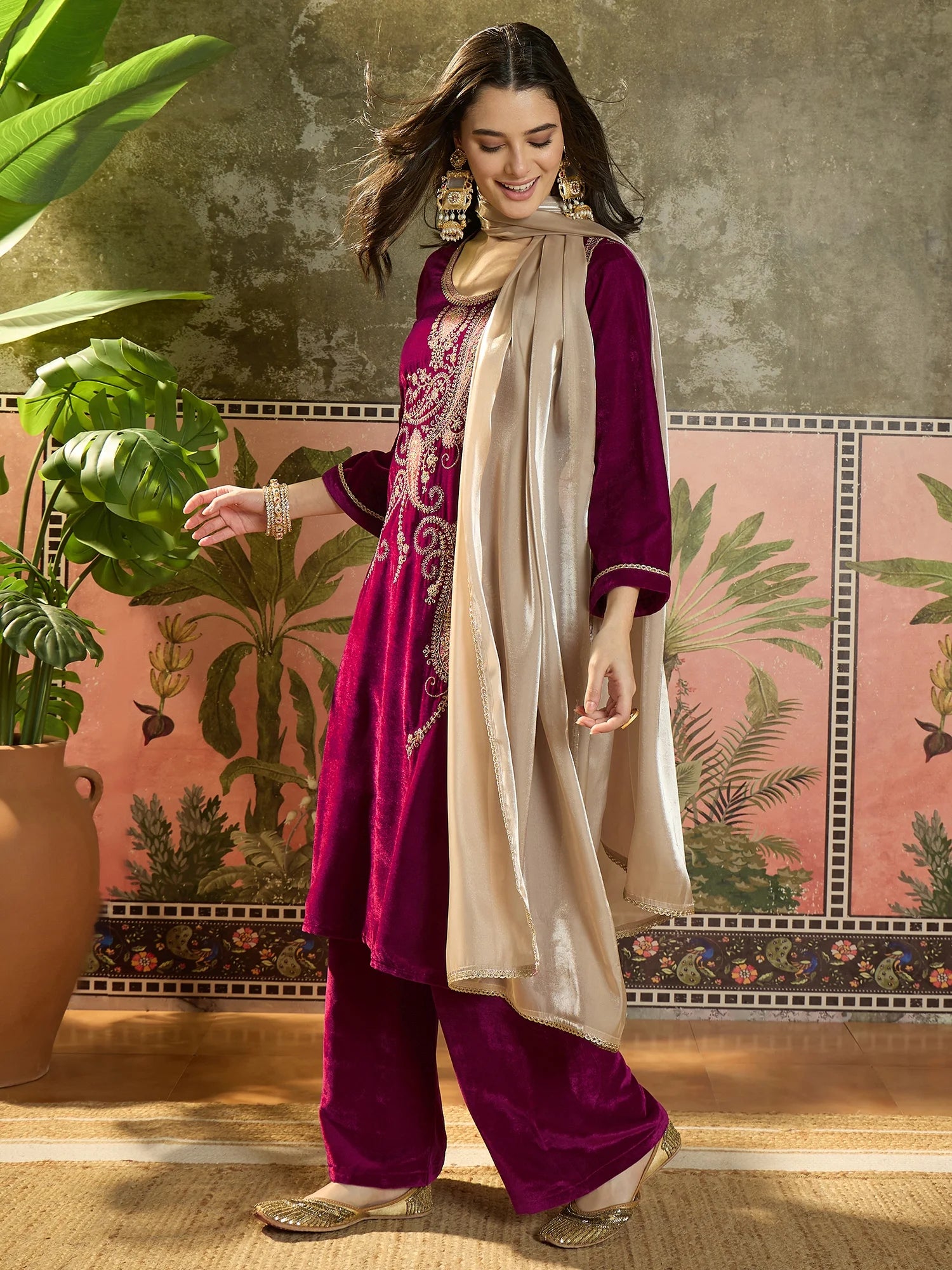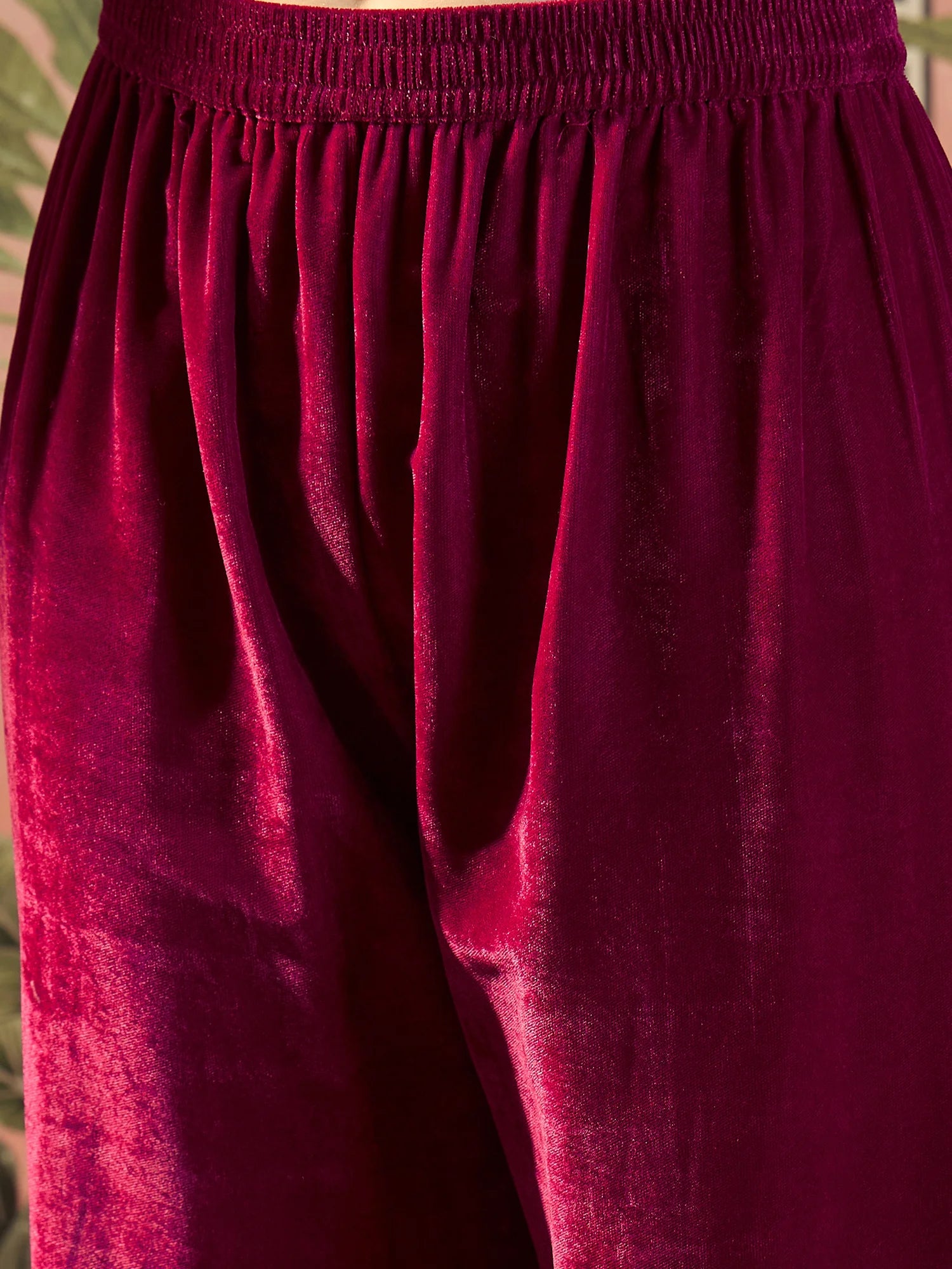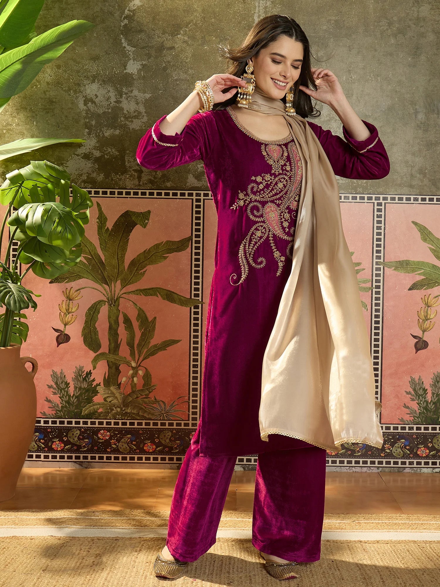 Pink Velvet Embroidered Straight kurta palazzo with Dupatta Set