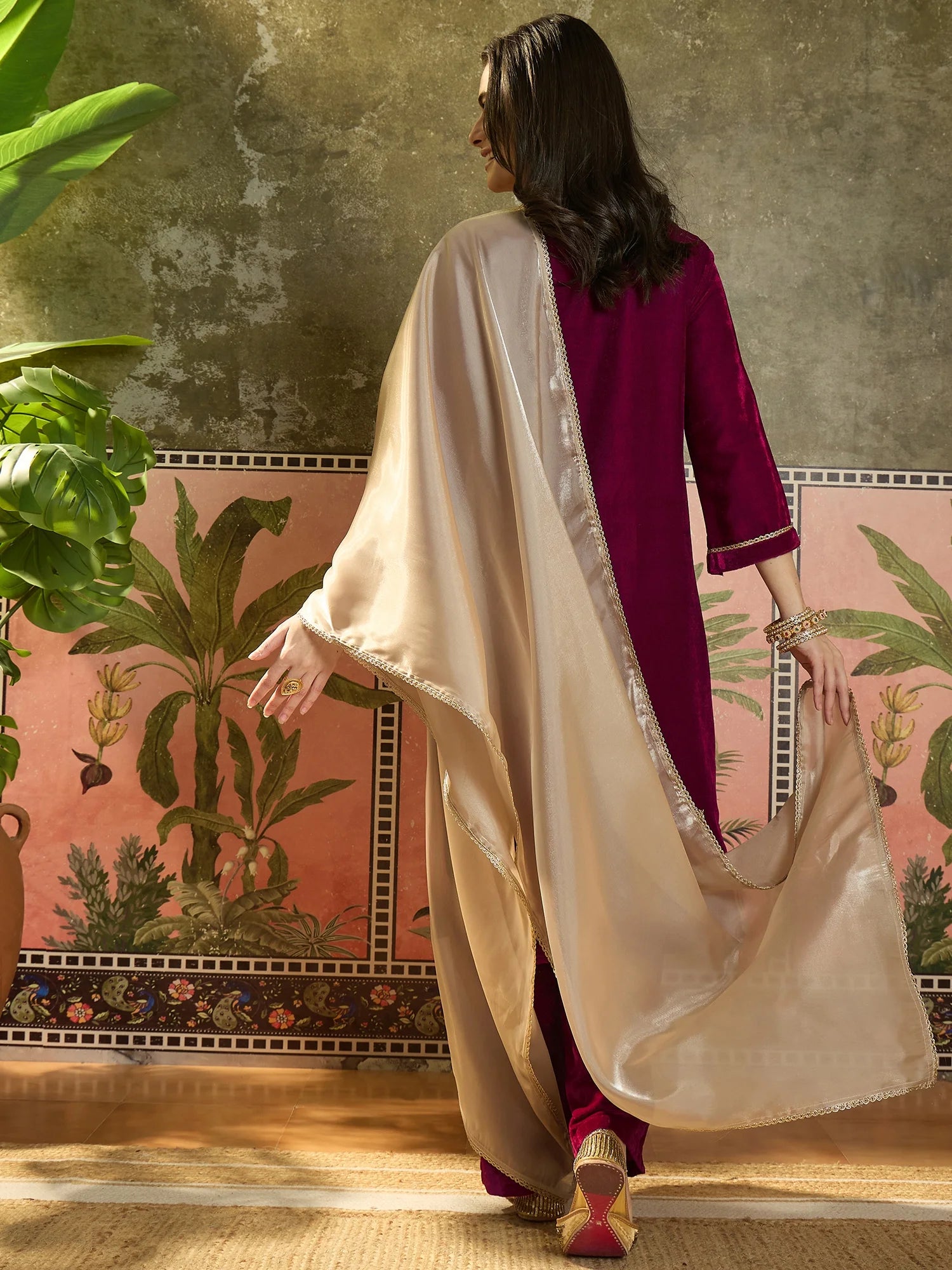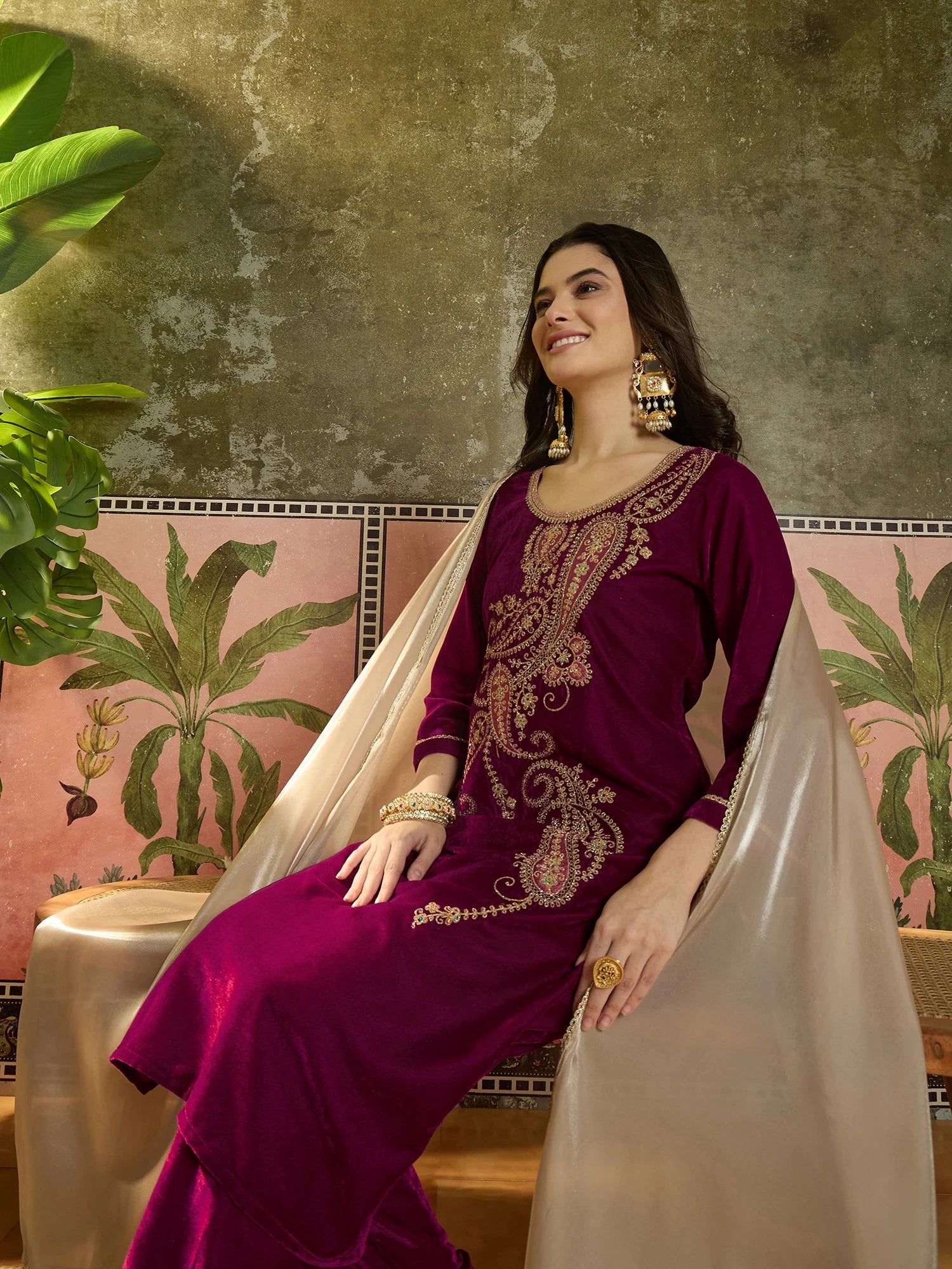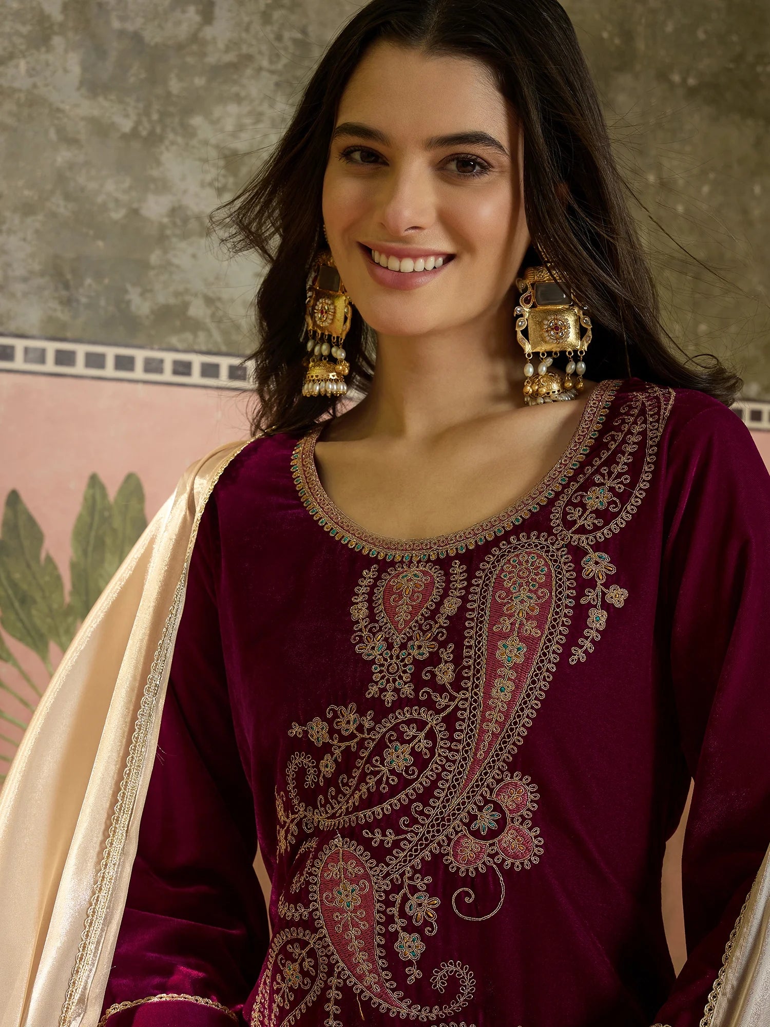 Elevate your winter wardrobe with this elegant Pink velvet embroidered kurta set, designed for both comfort and festive charm. The rich velvet fabric gives the outfit a luxurious feel, while the detailed golden and blue thread embroidery adds a touch of traditional sophistication.
