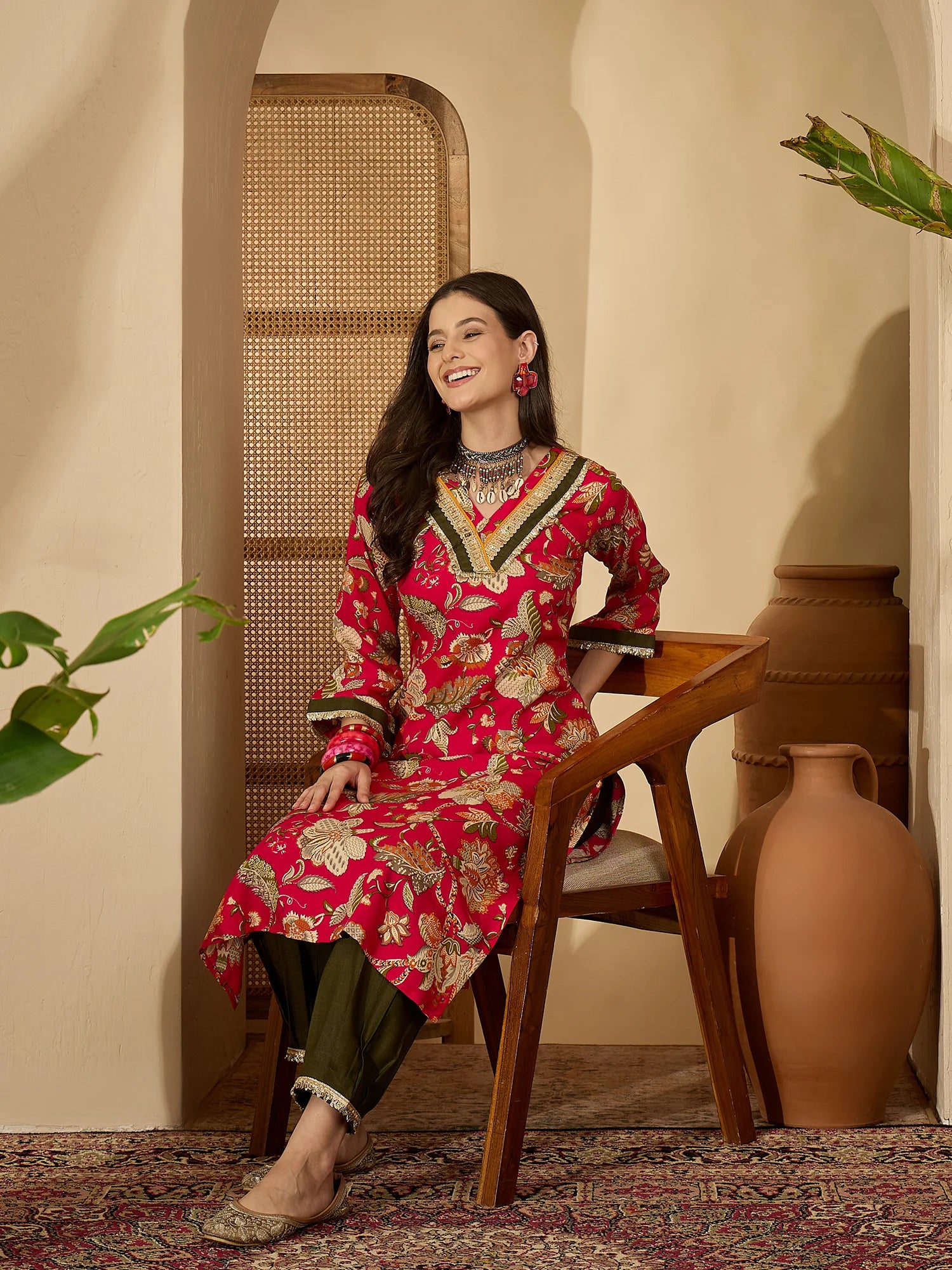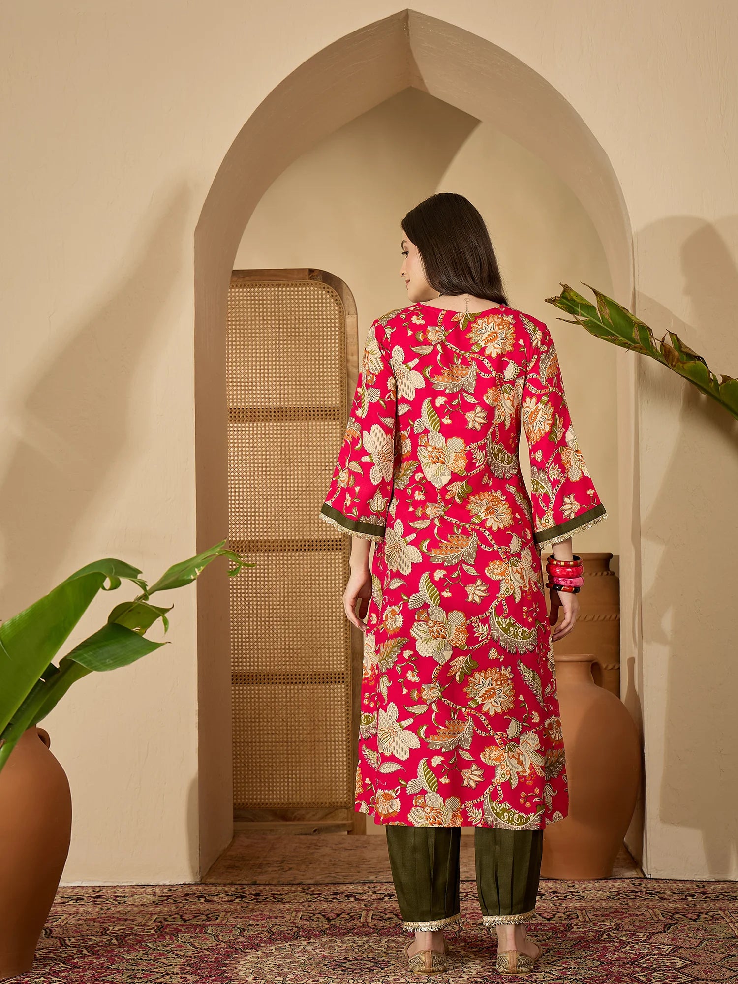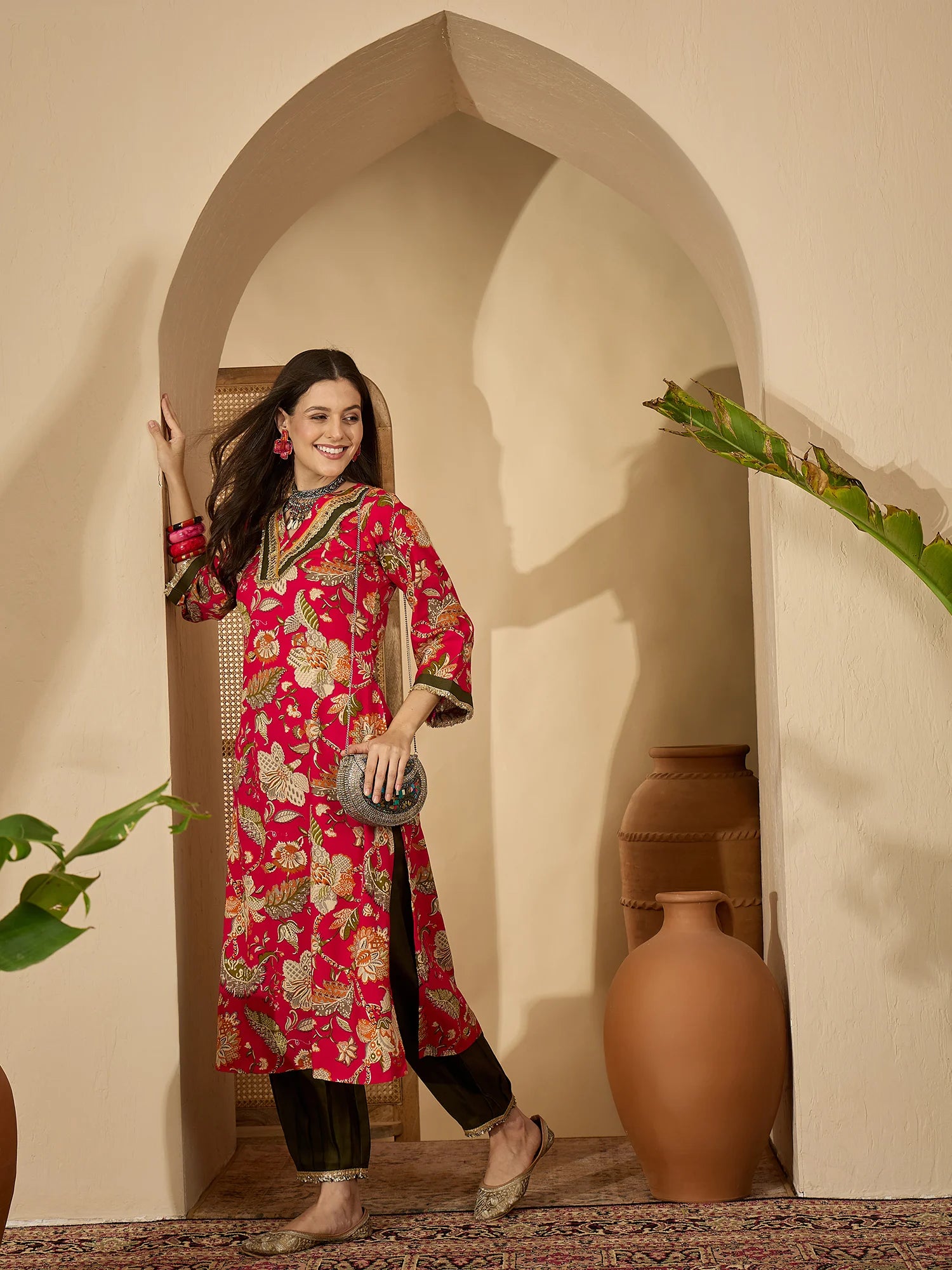 Pink Viscose Rayon Floral Print A-line Long Kurta